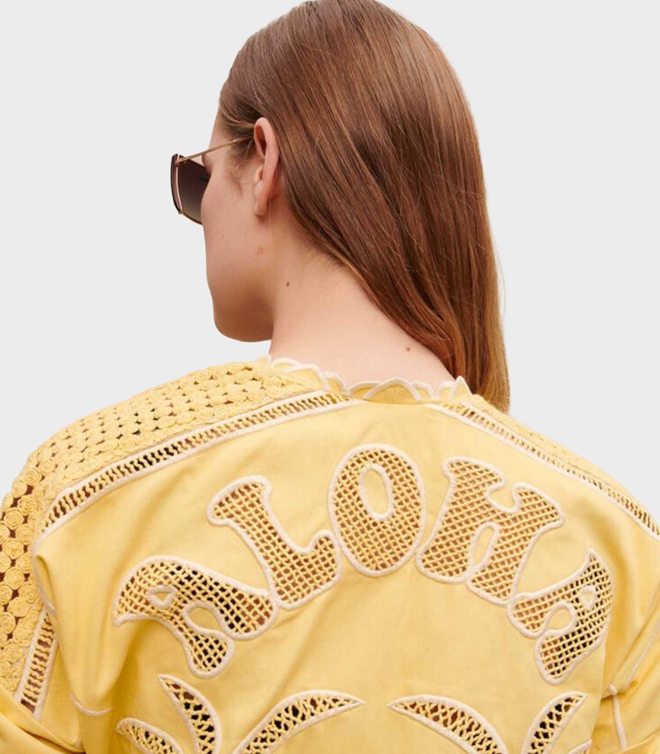 • One of the season’s must-have pieces, this long-sleeved kimono jacket is embellished with hand-crocheted motifs and scalloped trim and features a removable belt. Its versatility allows it to be worn open over a lightweight dress or tied at the waist over a top and shorts.