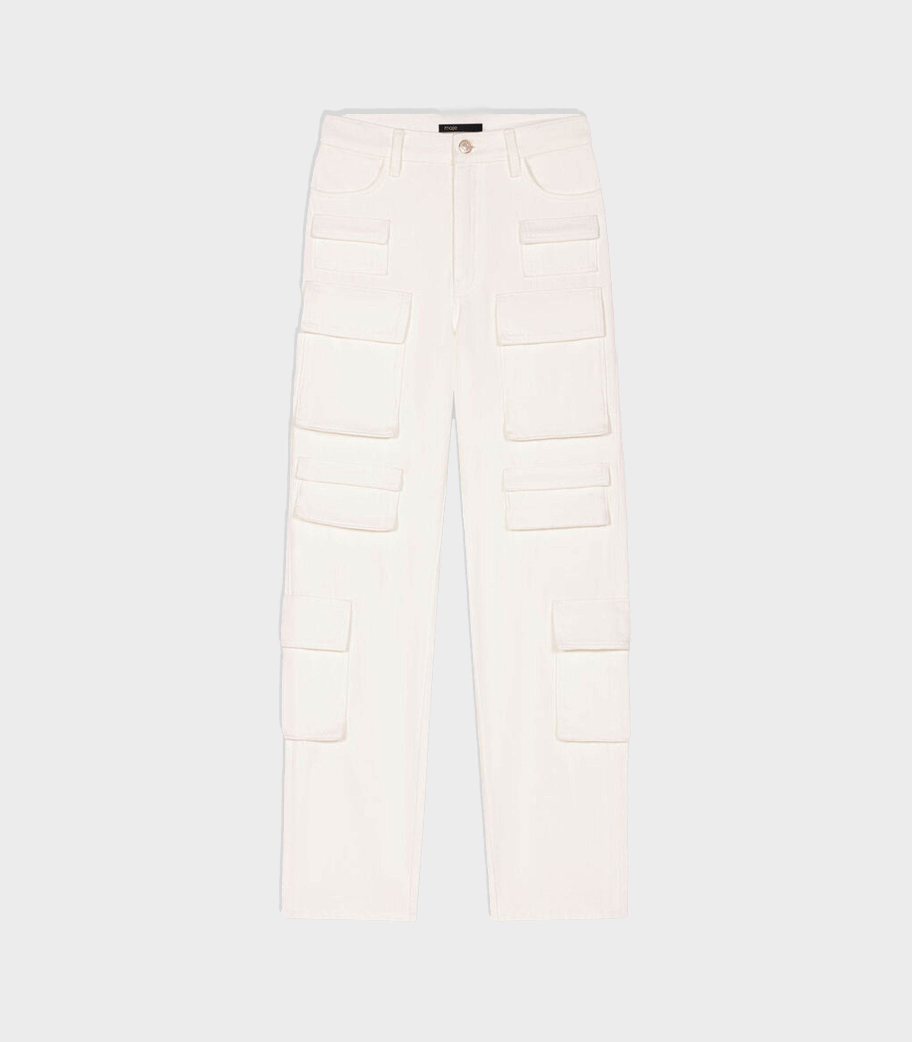 • Maje has revamped its urban, casual cargo trousers which feature multiple pockets on the sides, by pairing them with romantic pieces in lightweight materials and pastel tones.