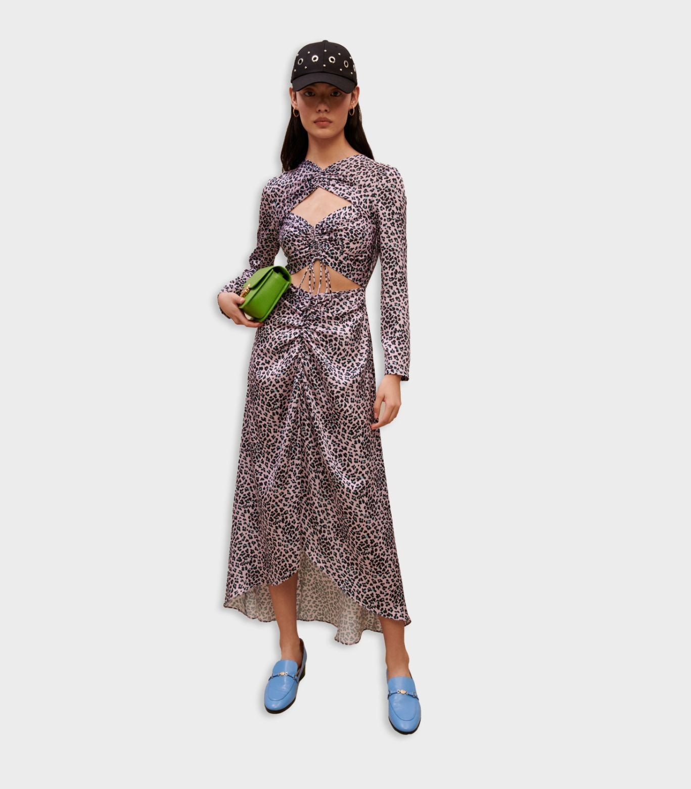• This dress is an ode to festivity. It flaunts a leopard print and cut-outs on the bust. Fully draped at the front it is proud to be a bold style. The soft, satiny material is extremely comfy.