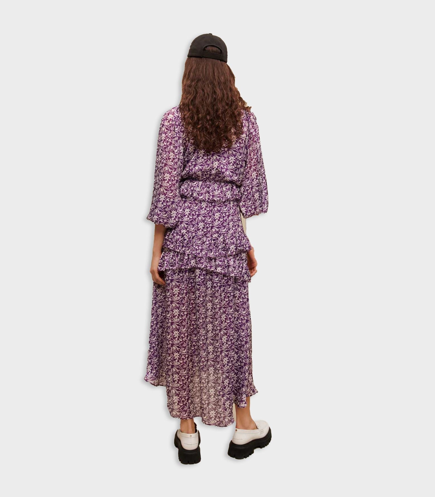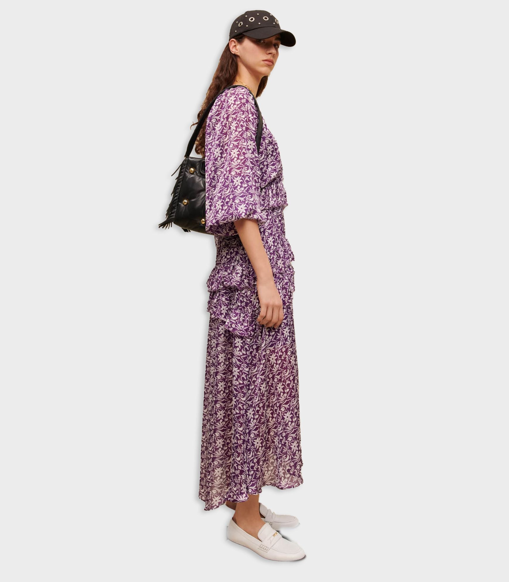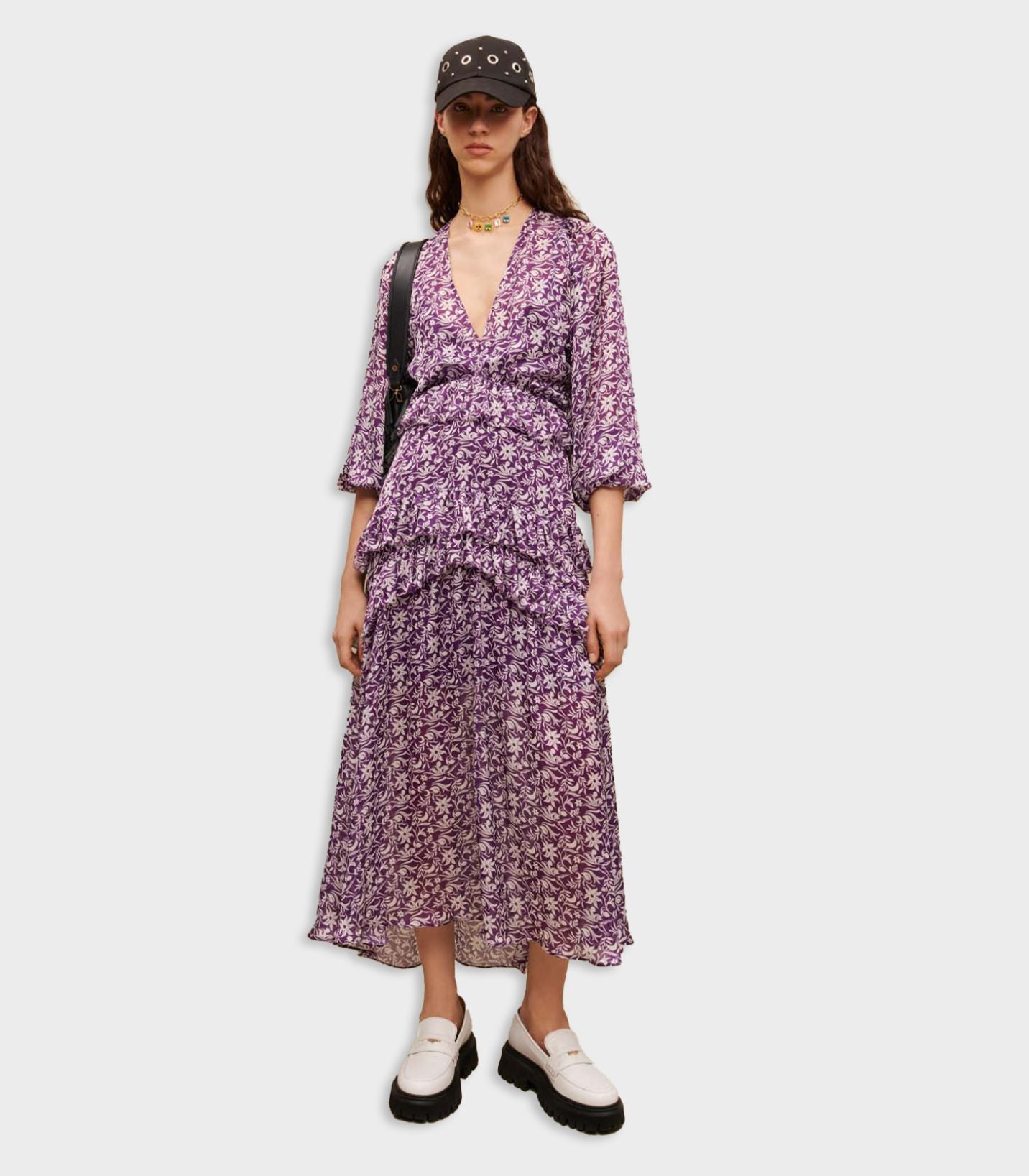 • Adopt this slinky, flowing dress for a lightweight, boho look. It features a V neckline and flared 3/4-length sleeves and is decorated with a floral print and ruffles at the hips.