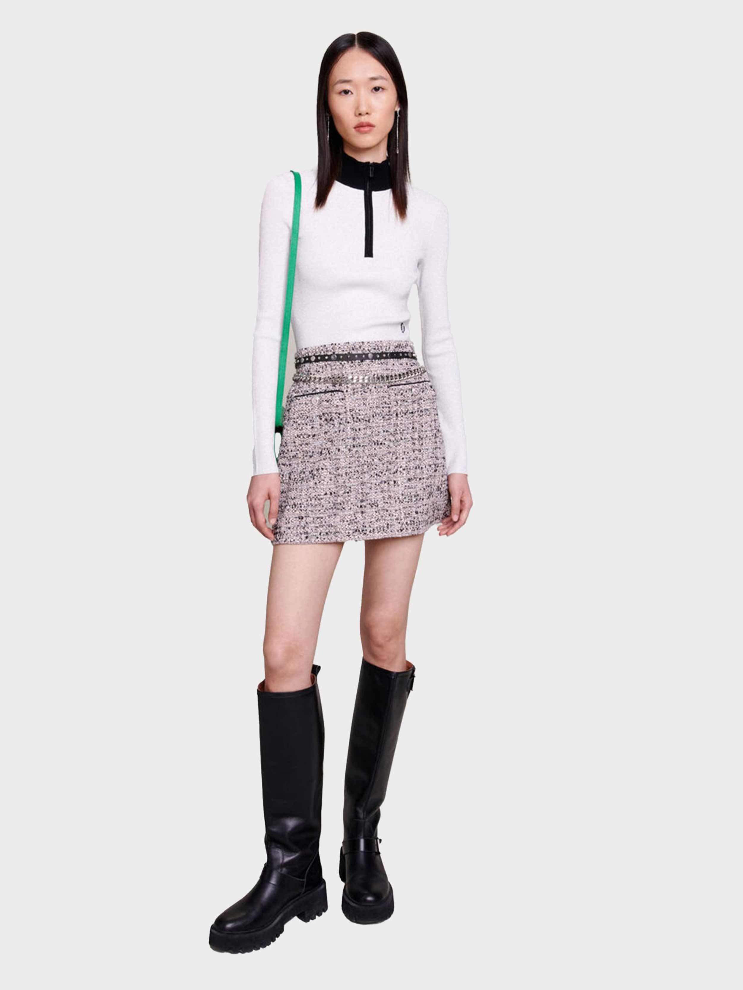 Maje - femme skirt , t36 , pink , style mfpju01138For this latest collection, the Maje girl plays at mix and match, using classic British items with a retro touch. The classic short tweed skirt, this season with chic details to give you a new look. With its metallic and patterned design, it features two false welt pockets with Clover buttons and contrasting piping and zip fastening on the back. Perfect for daytime or office wear, it offers a shapely and alluring silhouette. Easy to pair and accessorise, wear it with a top and ankle boots for a chic, casual look.