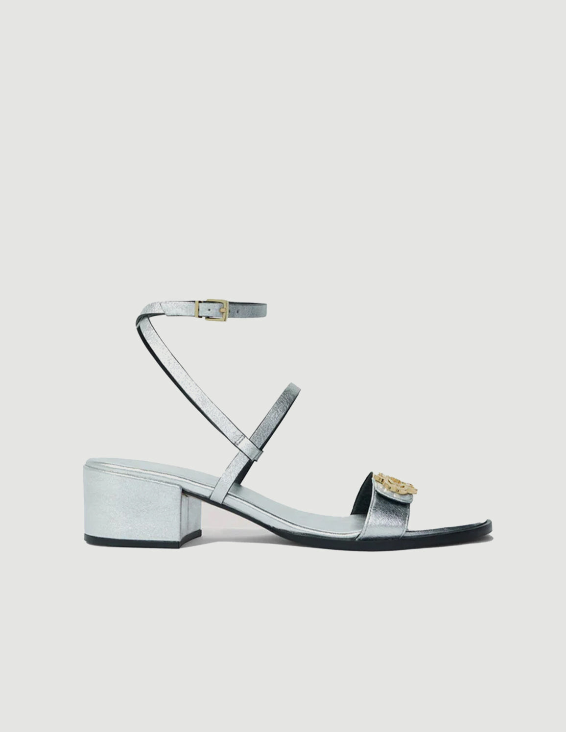 • Made from silver metallic leather, these heeled sandals are a dazzling addition to any day or evening wear.