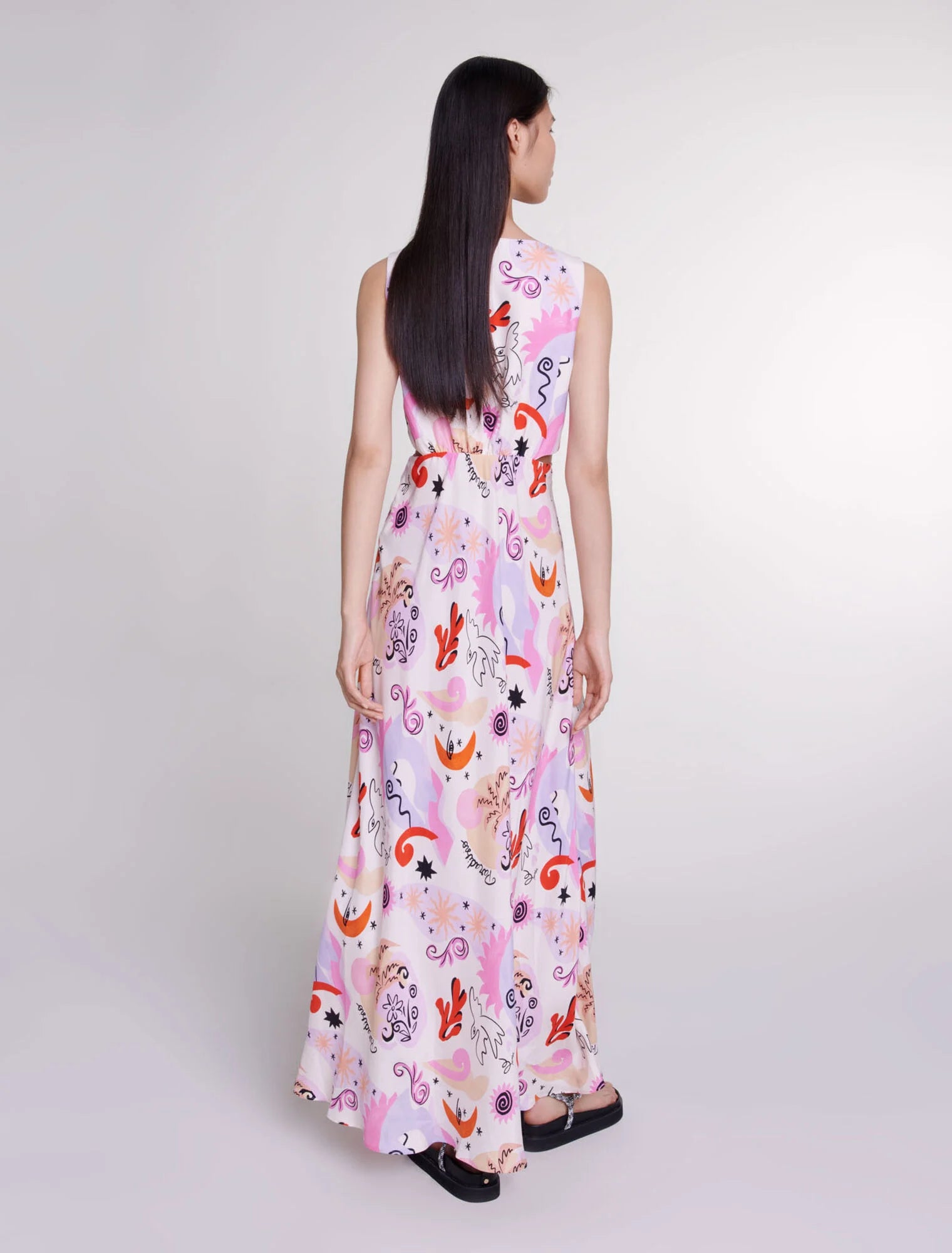 • This silk maxi dress is bright and sunny, embellished with this season's signature Paradisio pattern. This sleeveless dress features a V-neckline and a teardrop opening at the back accentuated by a button.