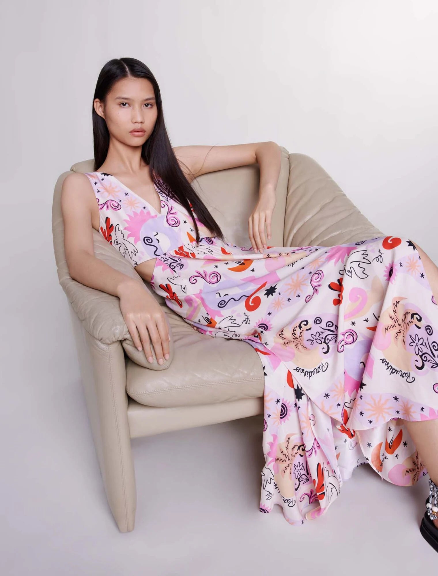 • The waist is emphasised by a cutaway design and it transitions into a floaty, flared skirt with a subtle slit.