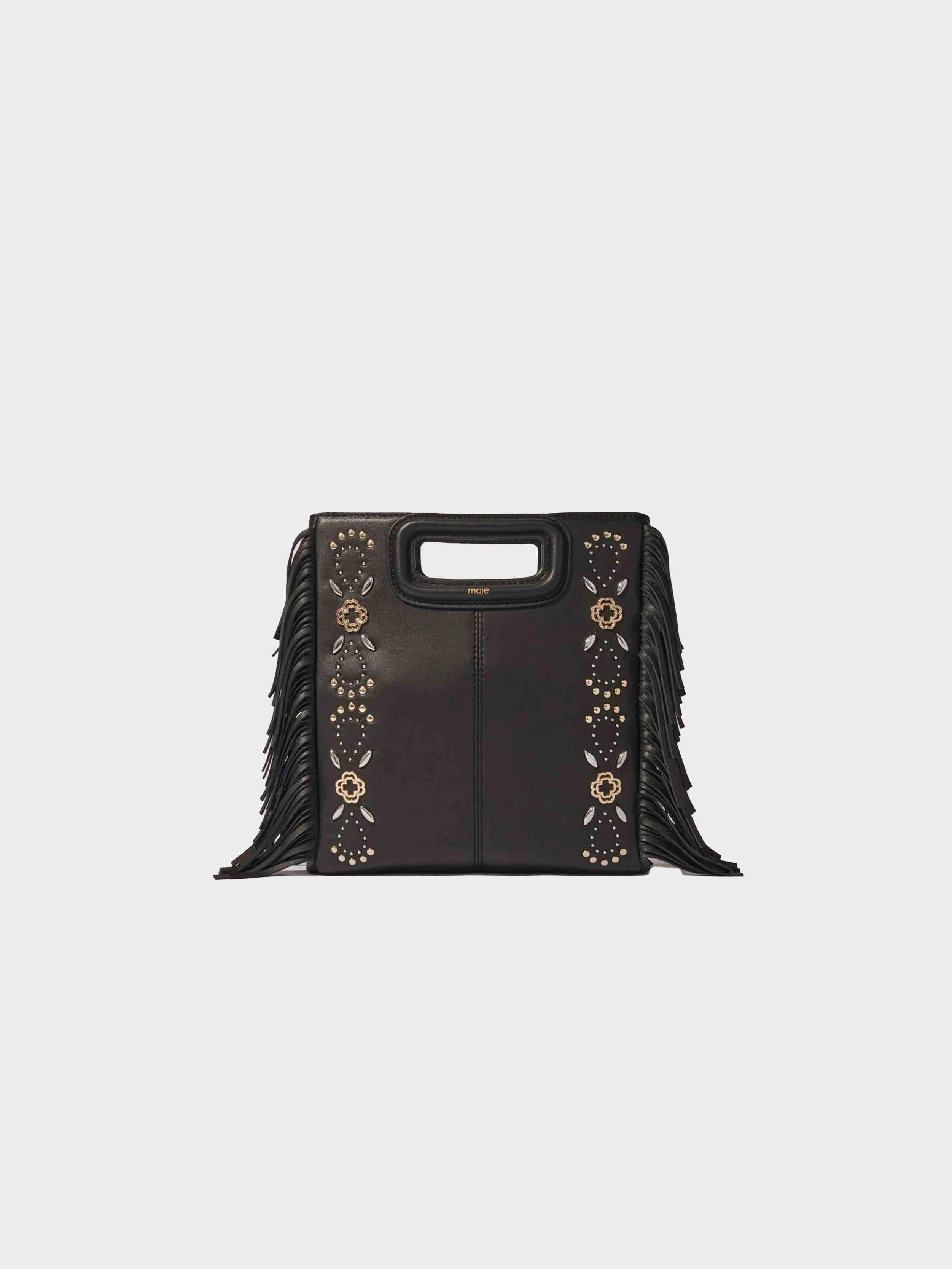 Maje's iconic M bag comes in plain leather accentuated with bi-colour eyelets. Featuring fringe detailing on the sides and a sheathed handle, it has an embossed gold-tone logo and a signature engraved on the buckles. It comes with a practical magnetic fastening and an adjustable, removable shoulder strap so you can carry it in a variety of ways: by hand, on the shoulder or crossbody.
