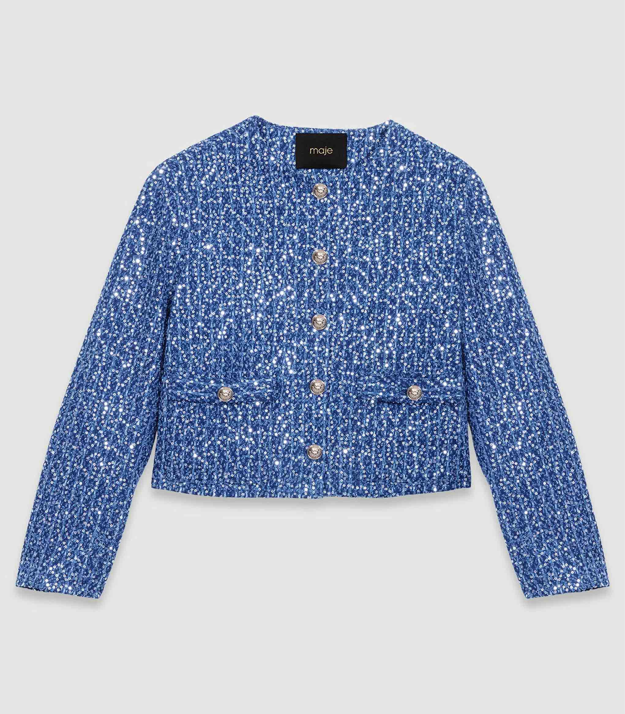 An ode to versatility, the new Maje collection uses comforting fabrics and timeless colours to make your daywear and evening wear look simply sublime. This short jacket, embellished with all-over sequins, will make you shine on any occasion. Made from tweed-effect denim, it features a round neck and long sleeves. It also features elaborate buttons on the fastening and two patch pockets with flaps. Wear it as a head-to-toe outfit or mix and match it with jeans, a bag and loafers.