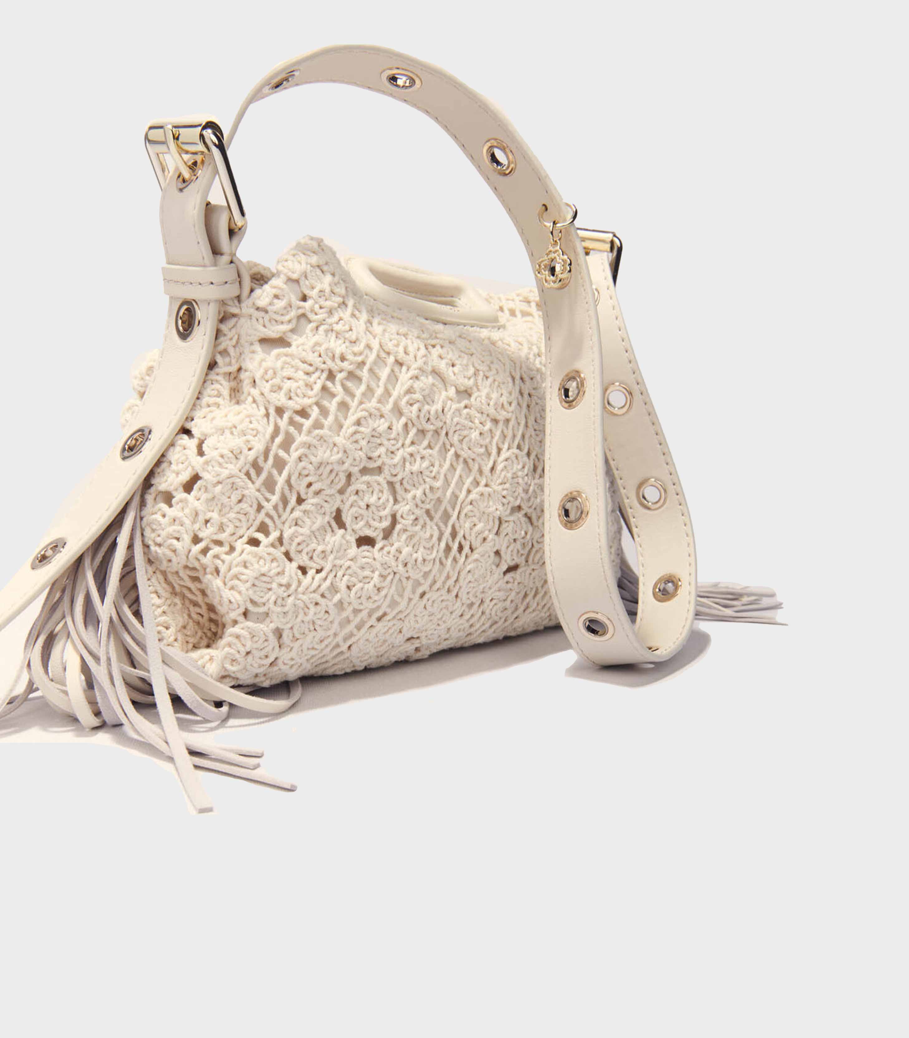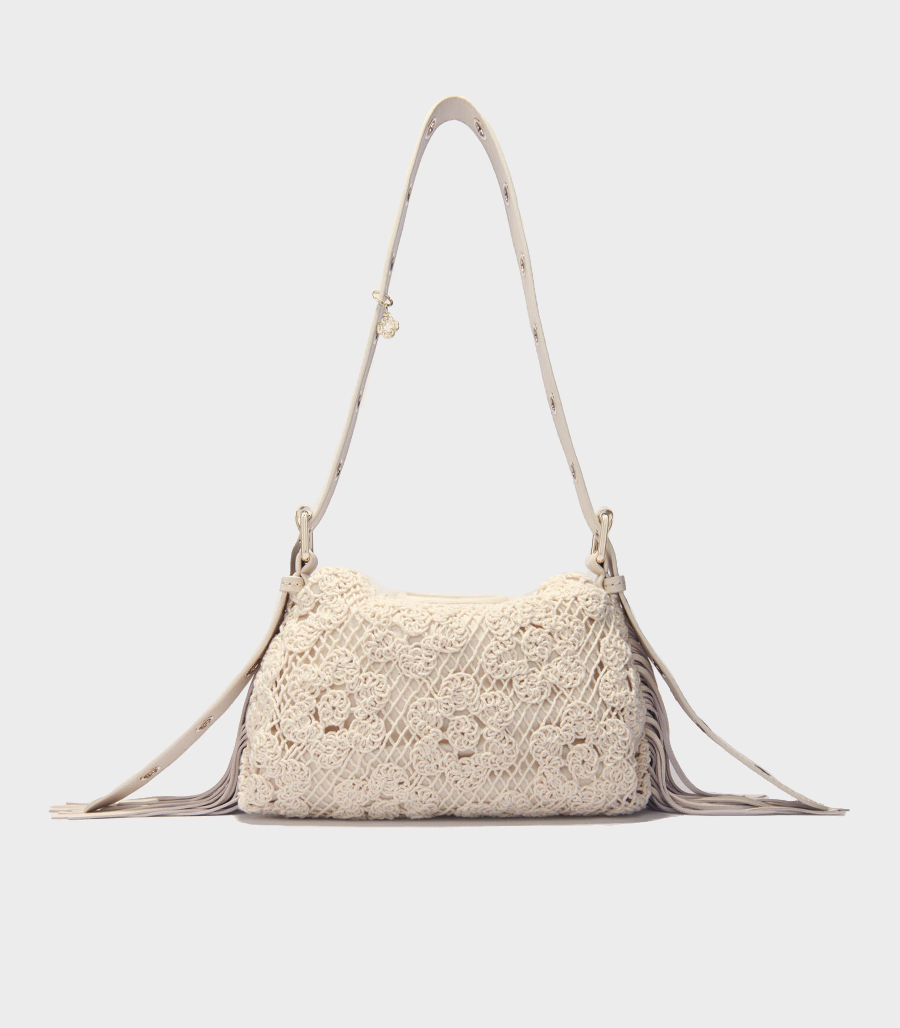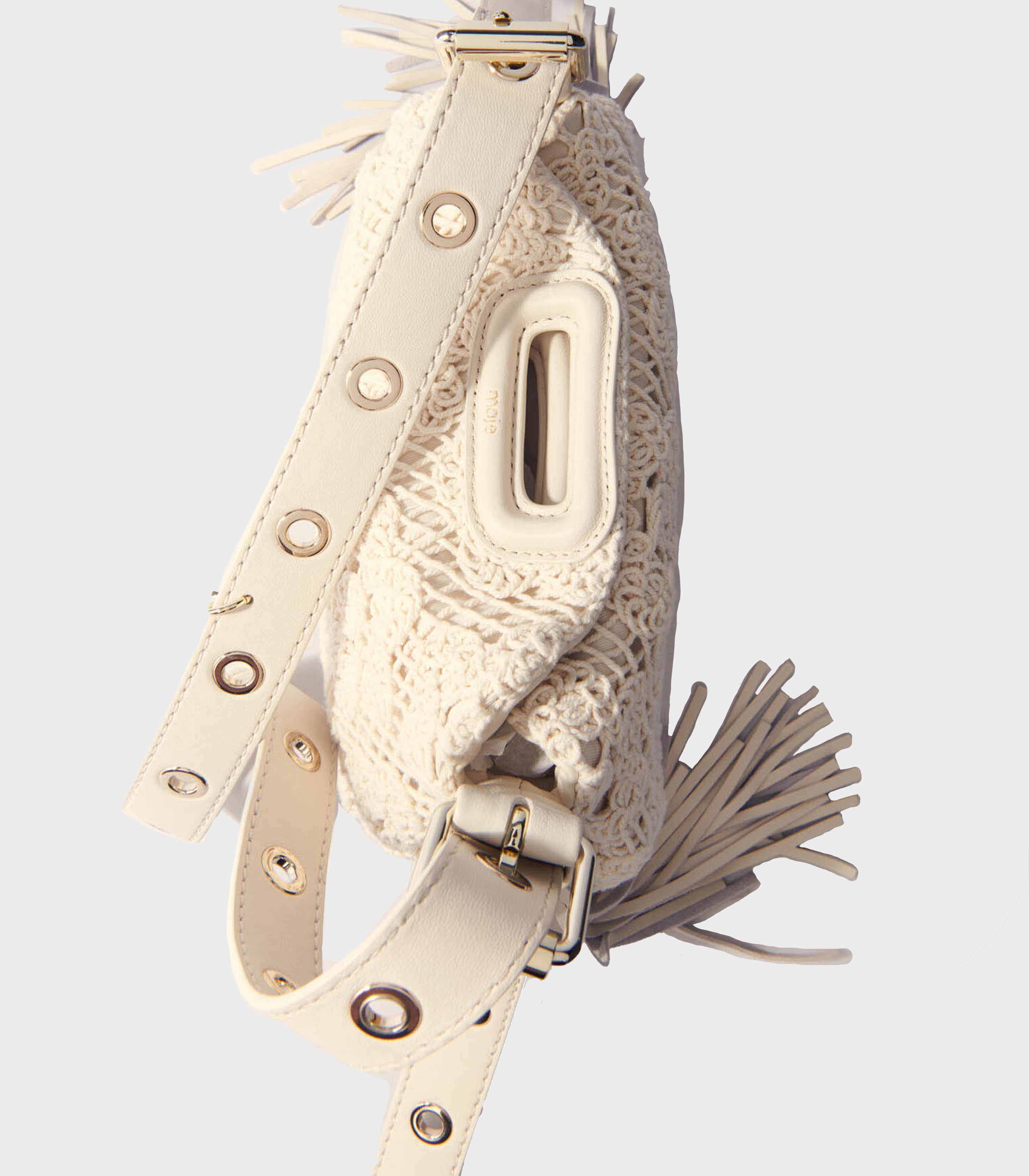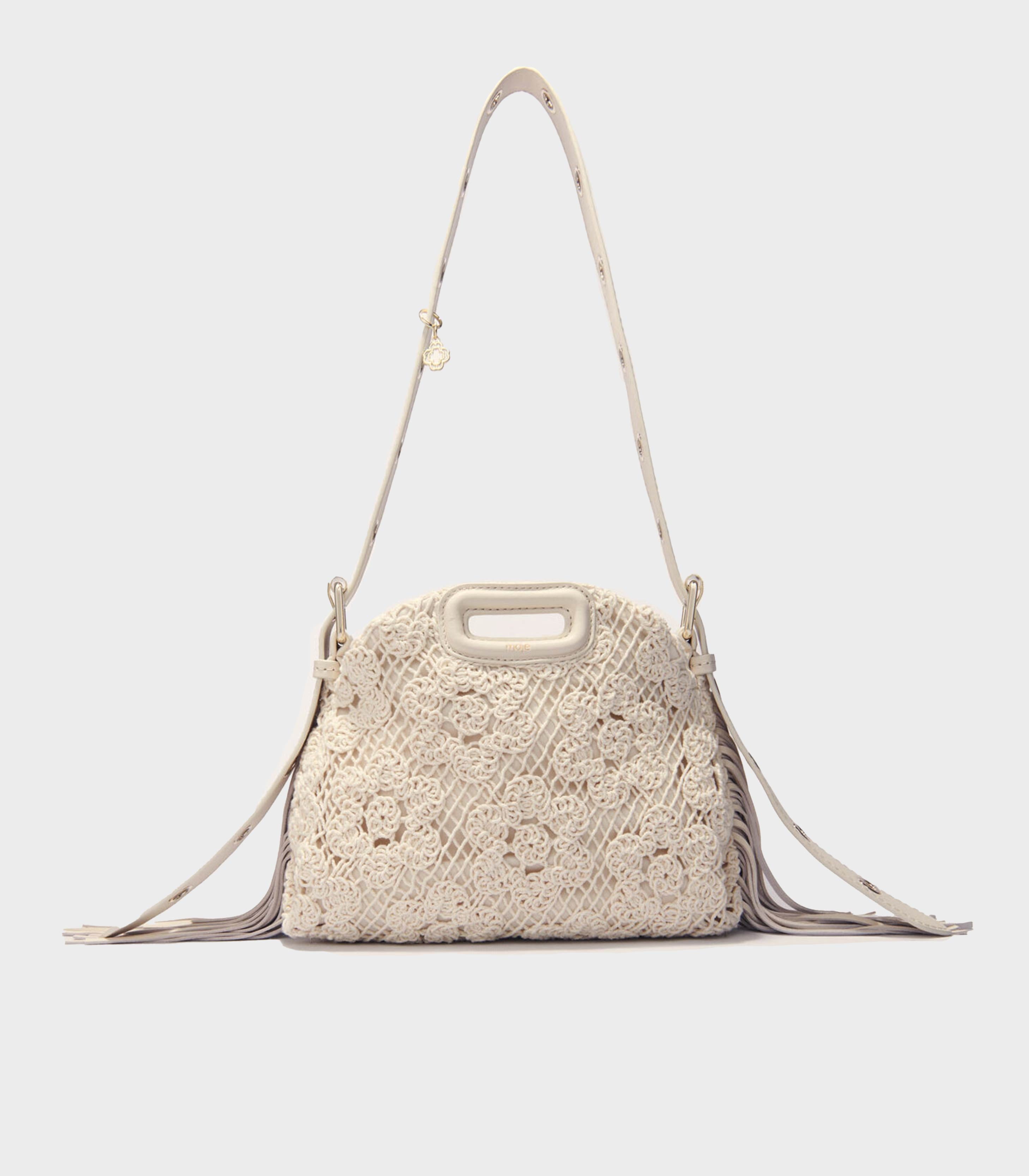 • Maje's iconic M bag comes in a mini version in openwork crochet with a floral motif that's both chic and practical. With fringed sides and a leather-covered handle, it features an embossed logo and signature engraving on the lobster clasps. It has a practical magnetic fastening and comes with an adjustable and removable leather shoulder strap and a removable chain strap for different carrying options: by hand, over the shoulder or crossbody.