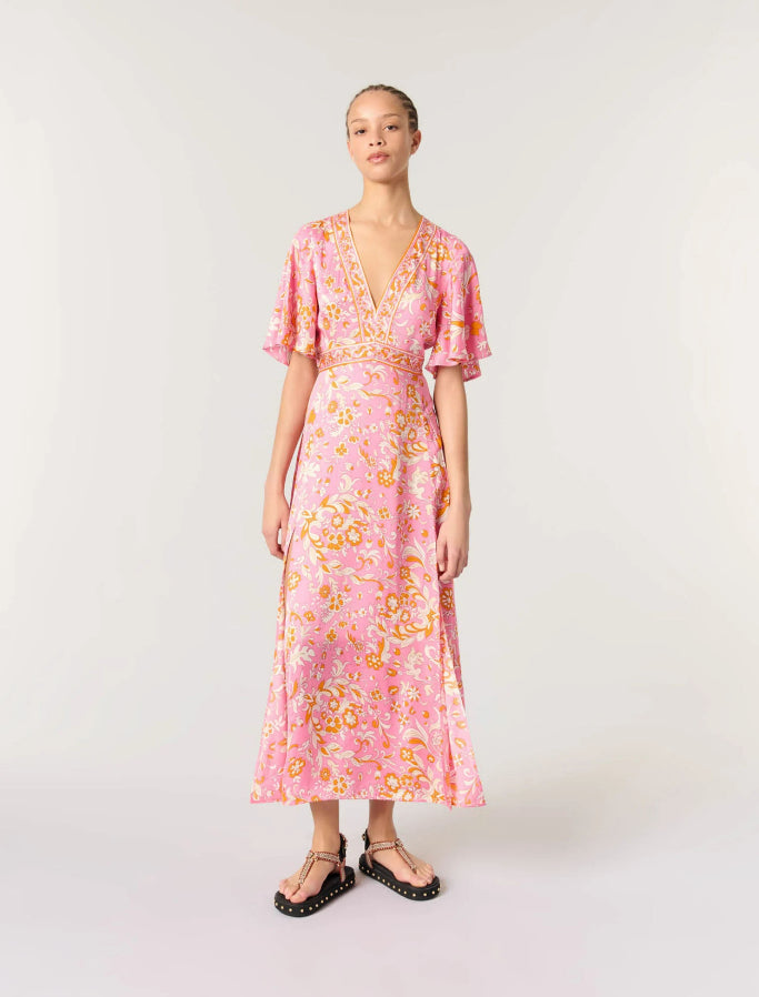 • This long dress features a floral print in pink and orange, inspired by the ‘70s. Its deep V neckline structures the silhouette, while the 3/4-length butterfly sleeves and slit skirt give it a light, flowing look.