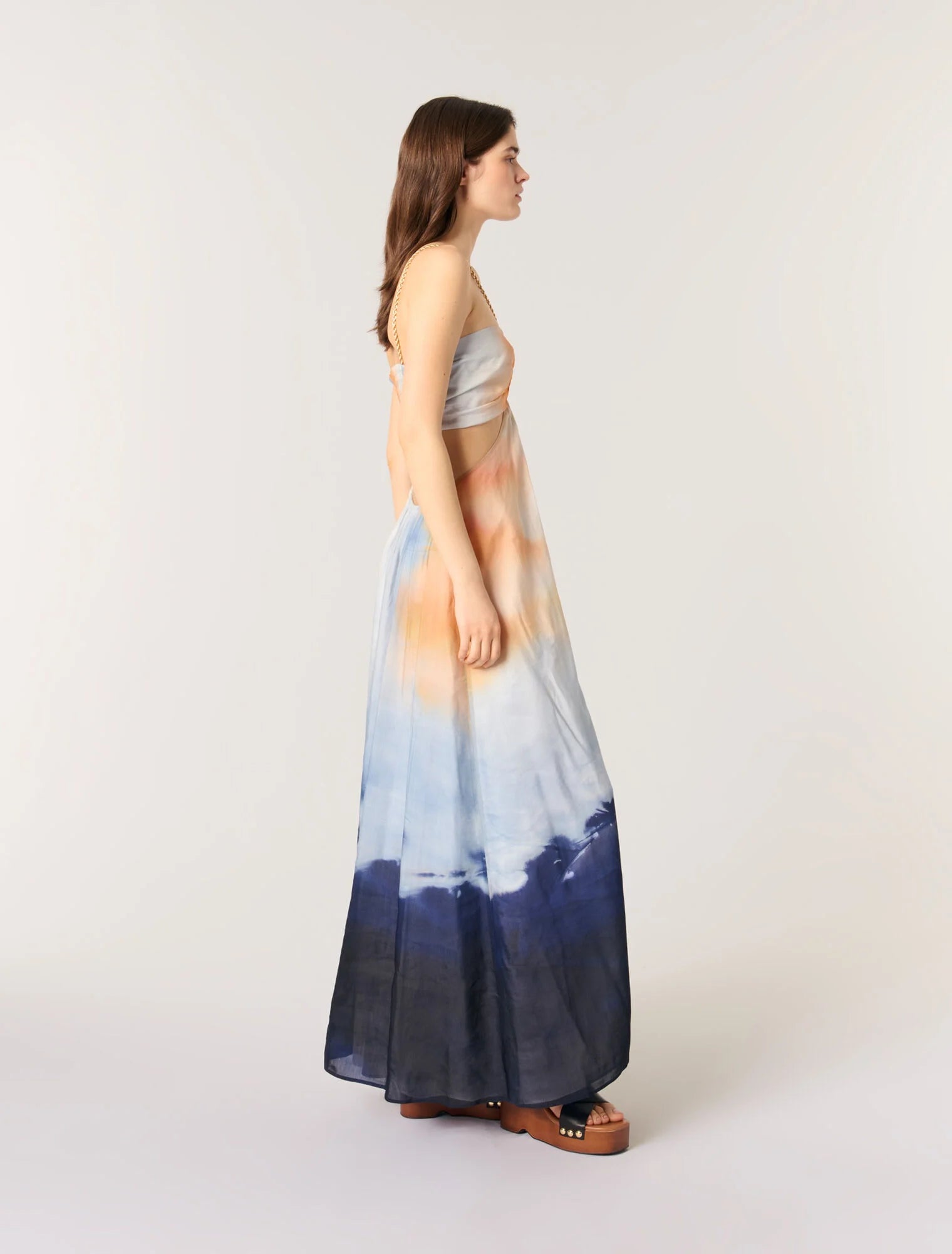 • This lightweight maxi dress features a tie-dye motif evoking the soft hues of a sunset.