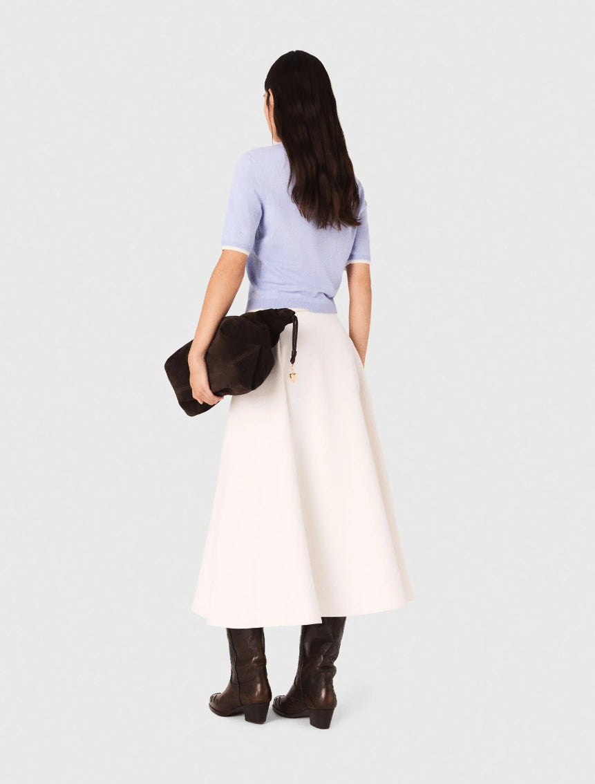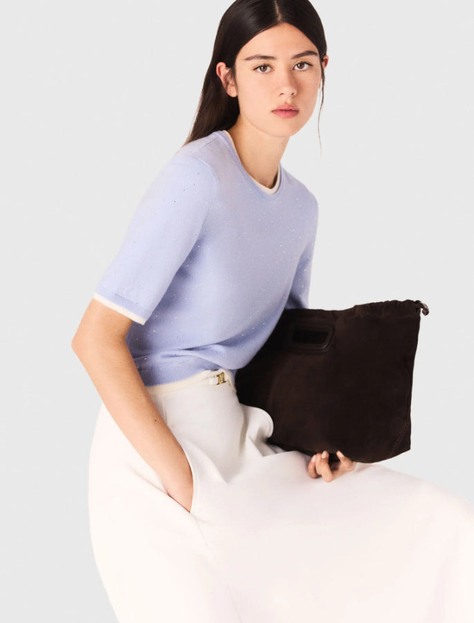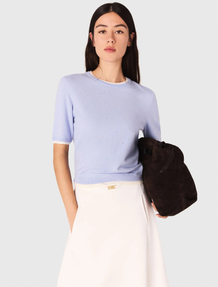• This wool jumper brightens the silhouette with its delicate rhinestones and 2-in-1 effect contrasting finishes. Featuring a round neck and short sleeves, it can be worn under the matching cardigan for a twin set look.