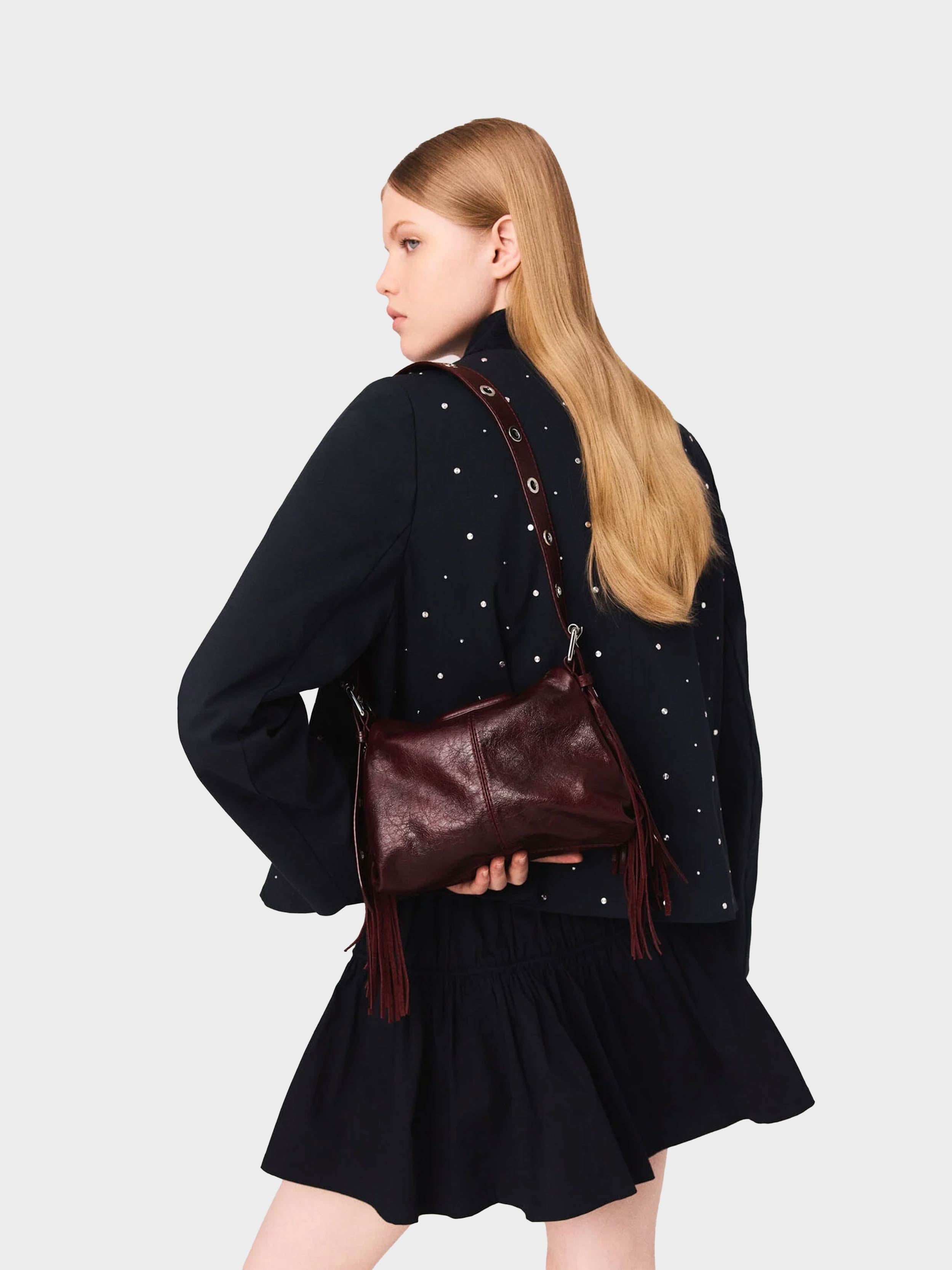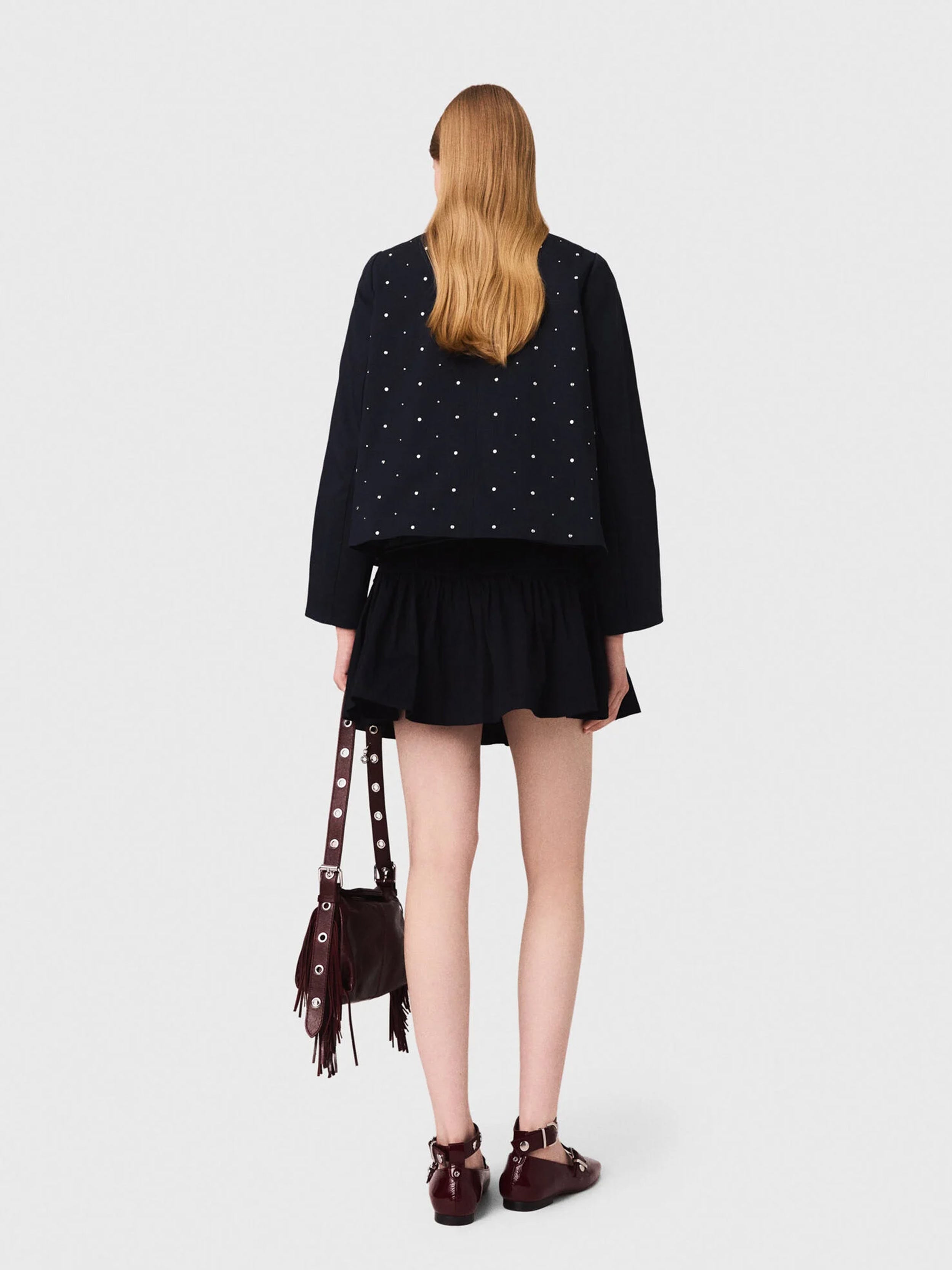 • With this flared short jacket adorned with studs, Maje reimagines a back-to-school classic. The corduroy collar and all-over studs add a touch of character, while the removable vest lining and press studs enhance its functional and versatile nature. This jacket is perfect for both day and evening wear, providing structure and lightness to the silhouette.