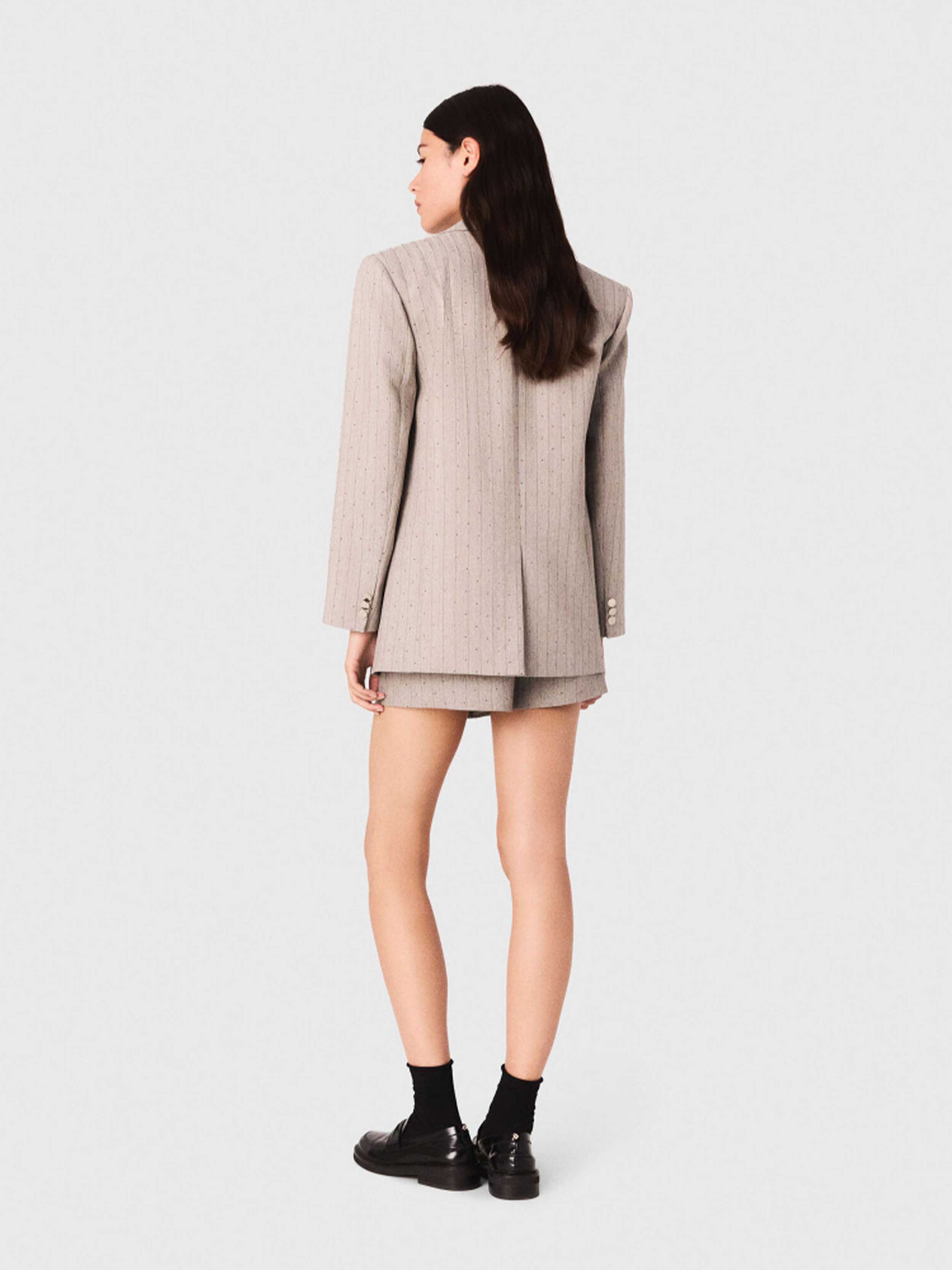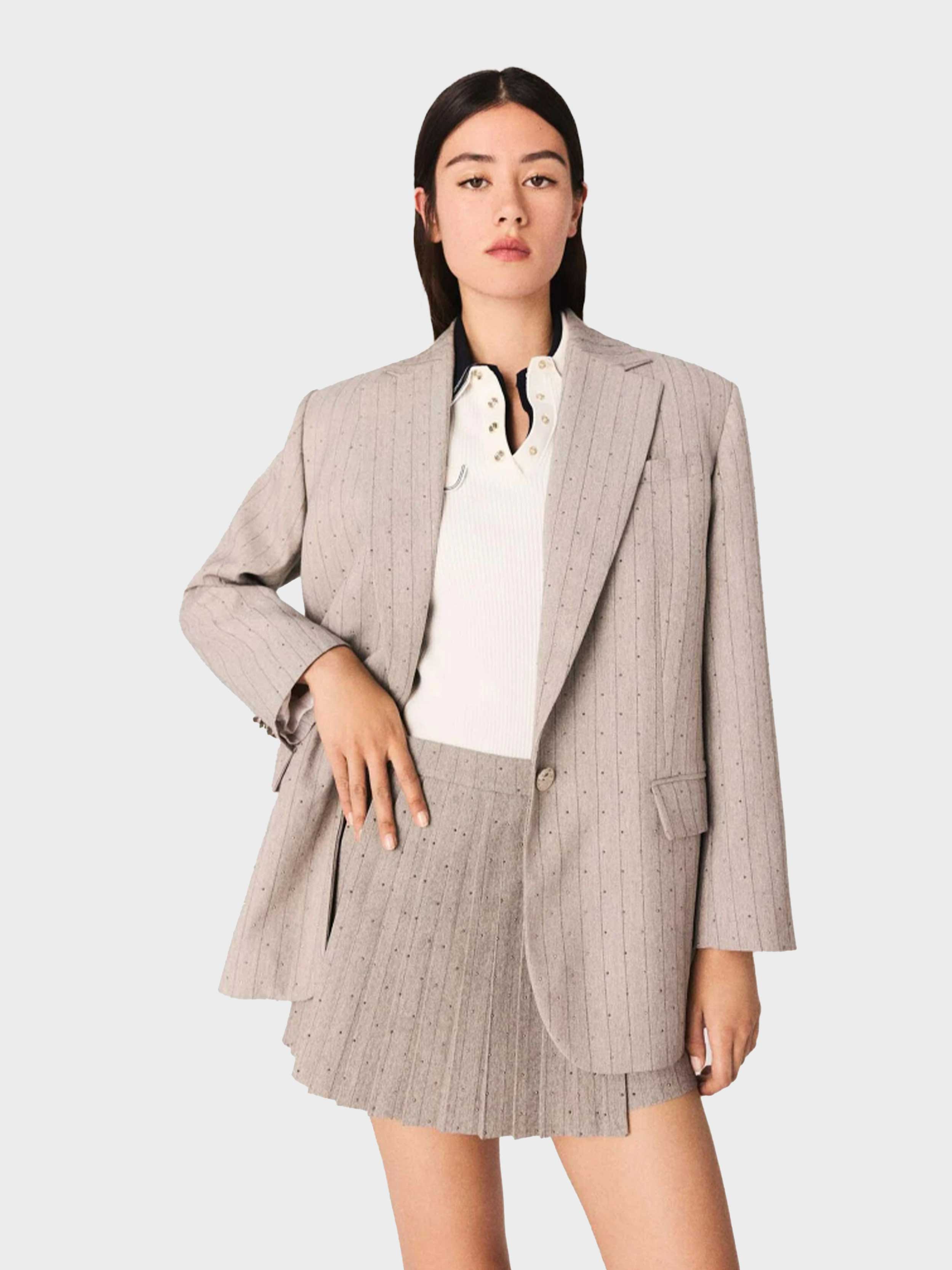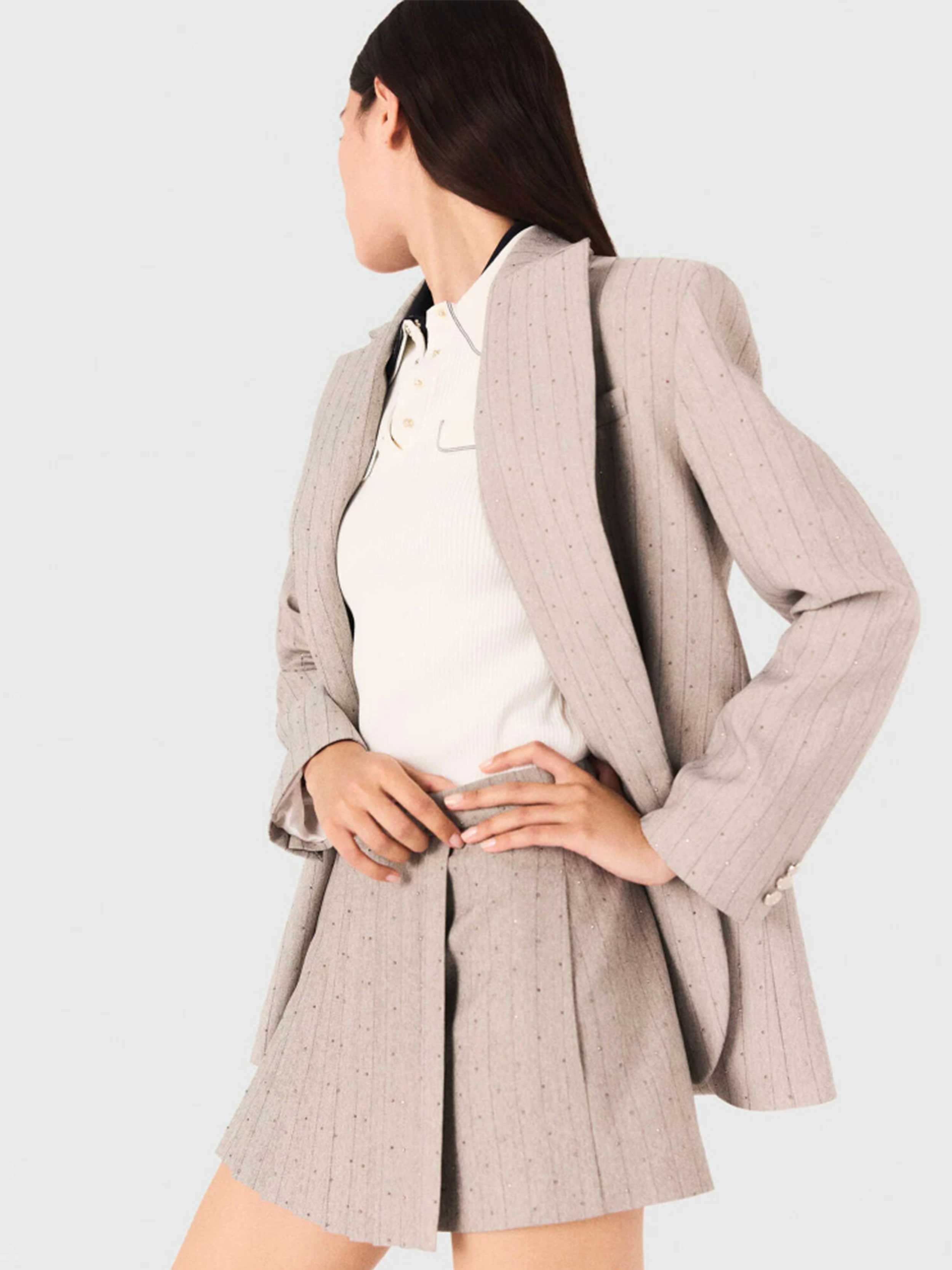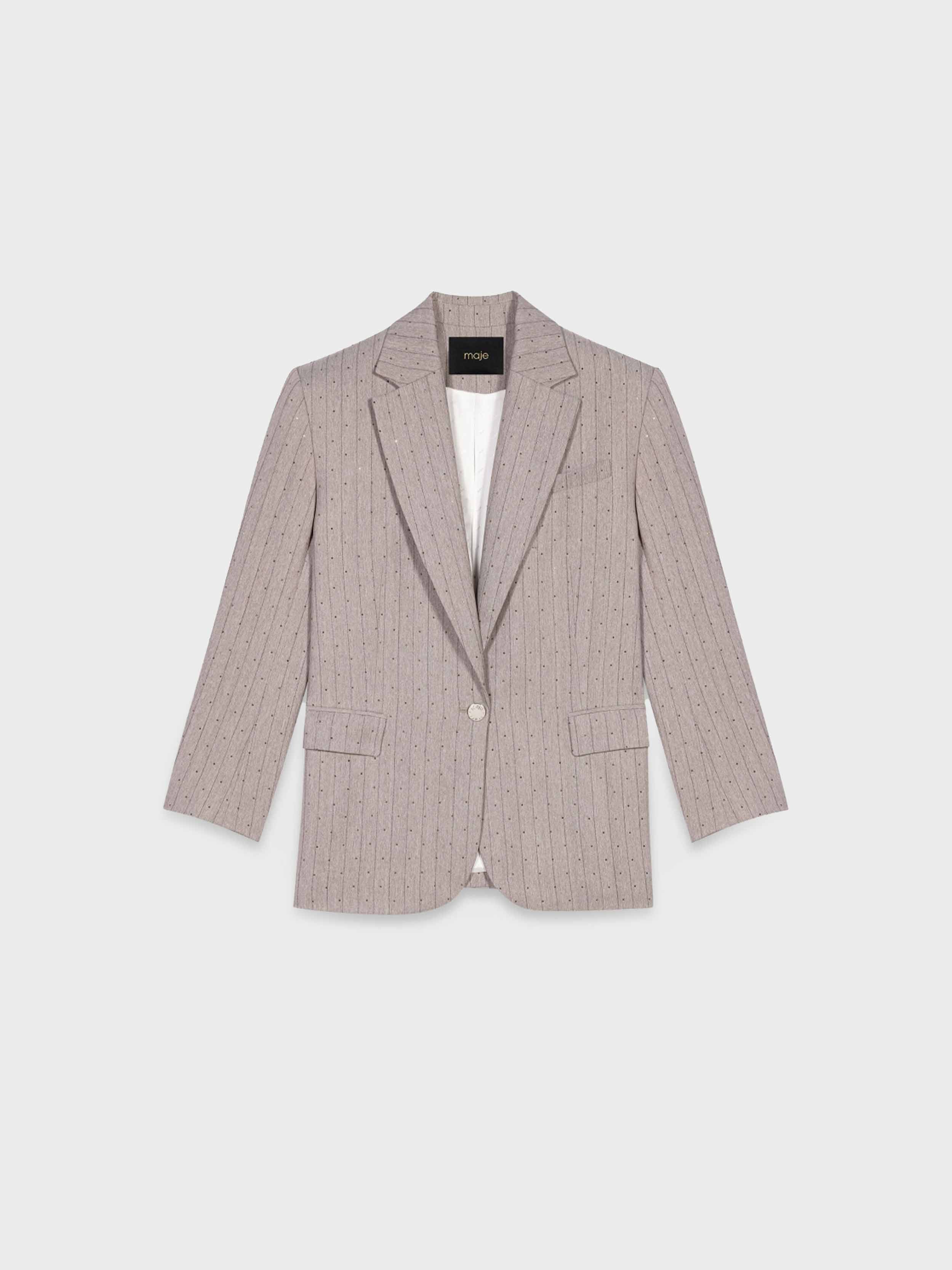• This structured jacket adds a lot of style to the silhouette and stands out with rhinestone stripes and meticulous finishes, from the lapel collar to the buttoned cuffs.