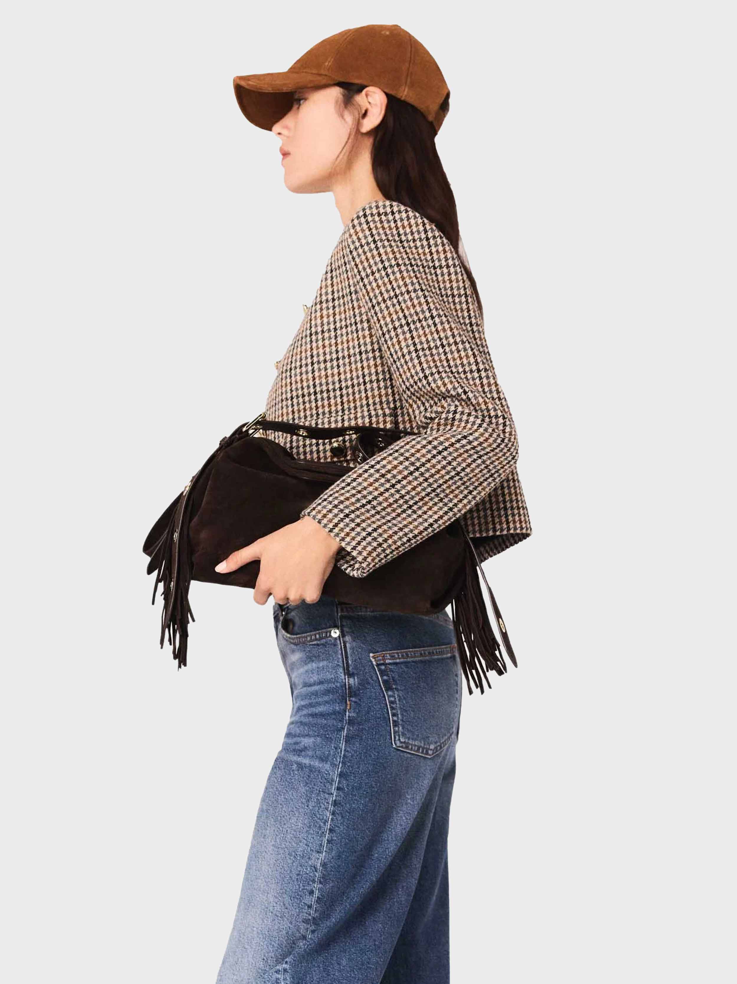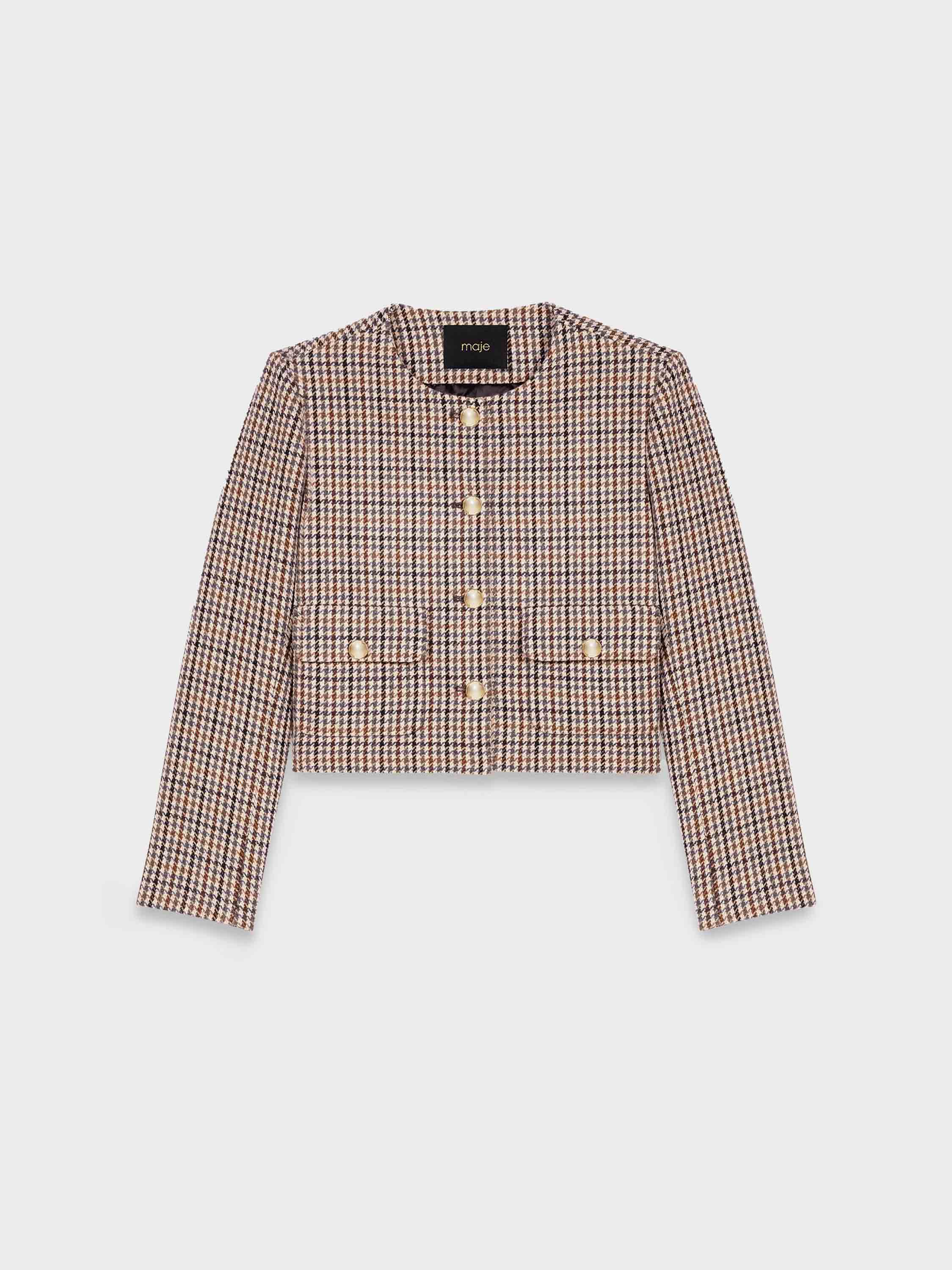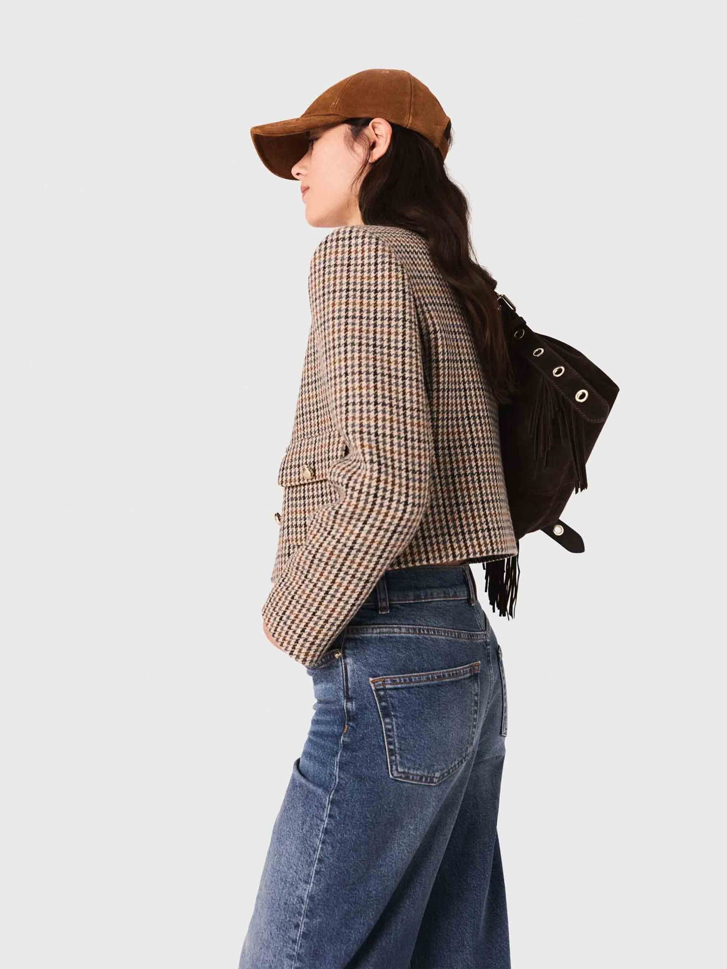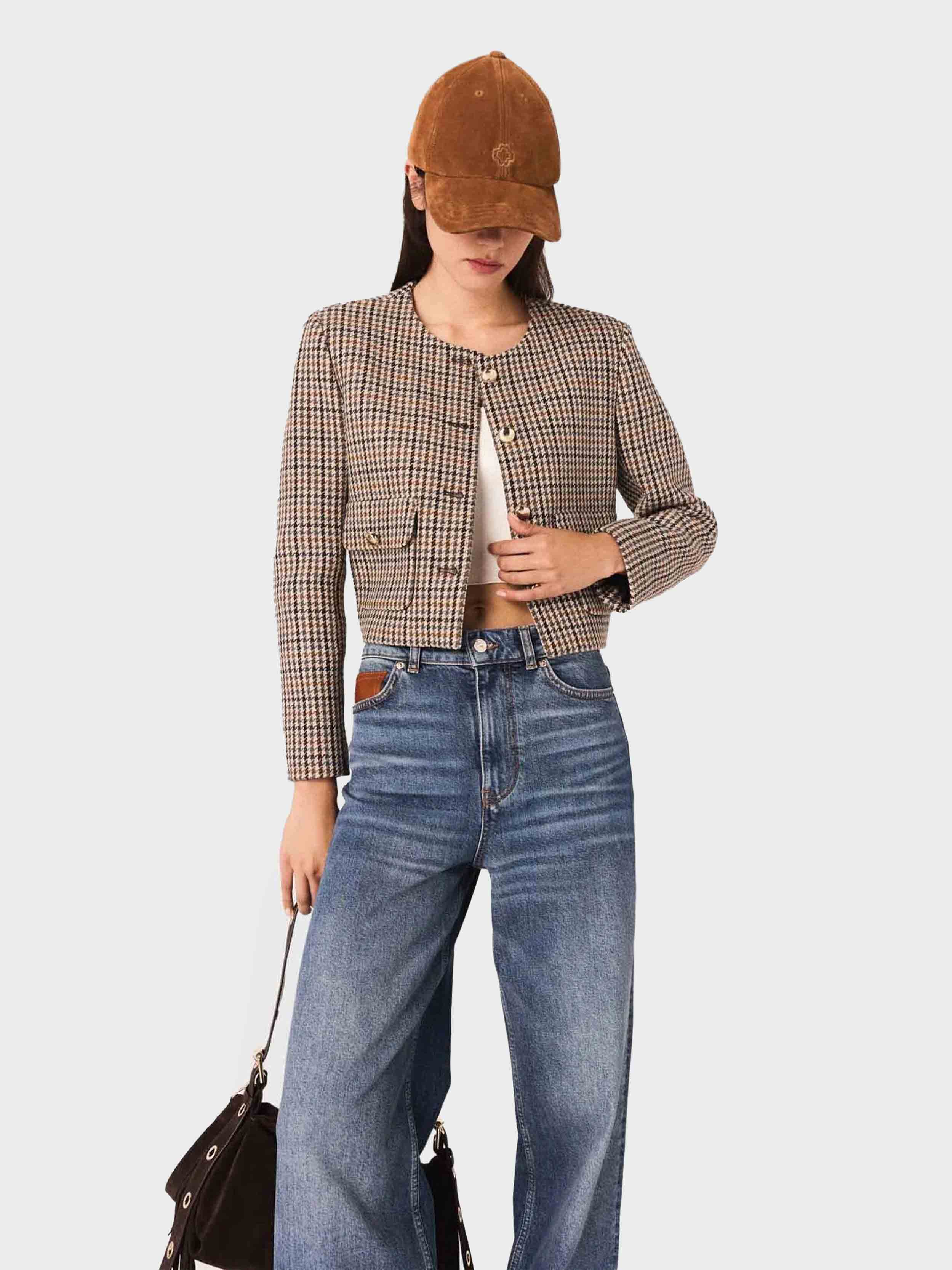 • With its short cut and gold buttons, this elegant jacket reinvents a wardrobe essential with modernity. A round neck, long sleeves and flap pockets complete this piece. Wear it with jeans, a suede cap and a fringed bag for a chic and effortless silhouette.