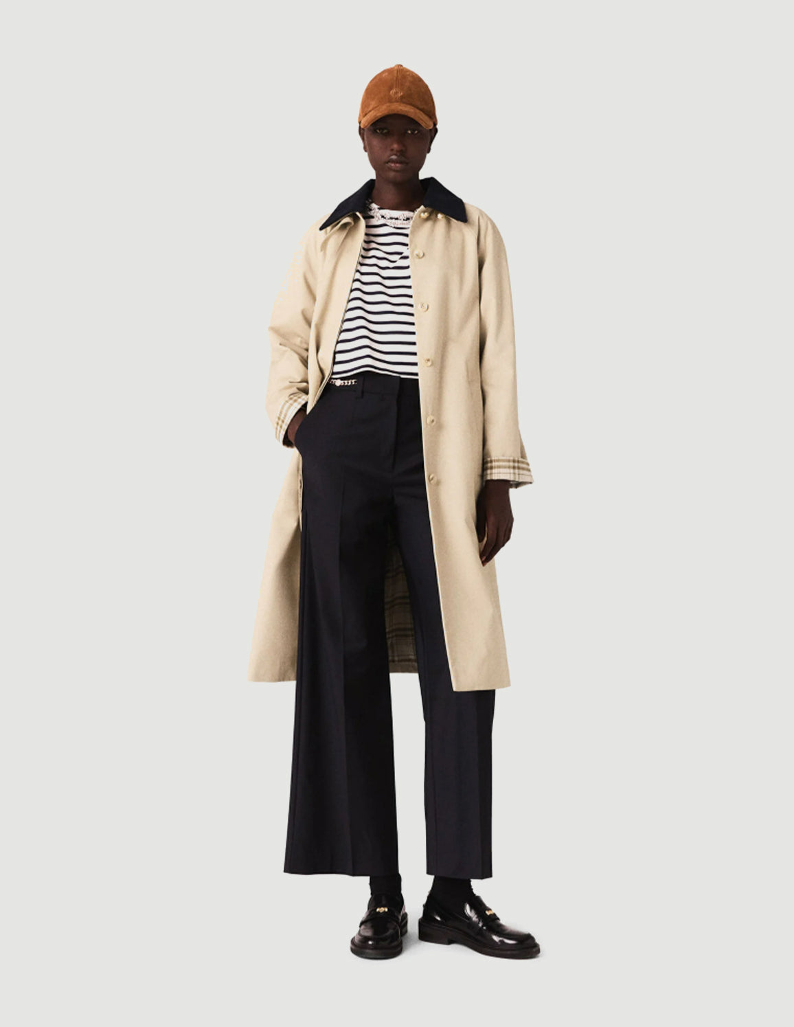 • This long trench coat stands out with its sleeve details and elegant collar, creating a sculpted and assertive silhouette.