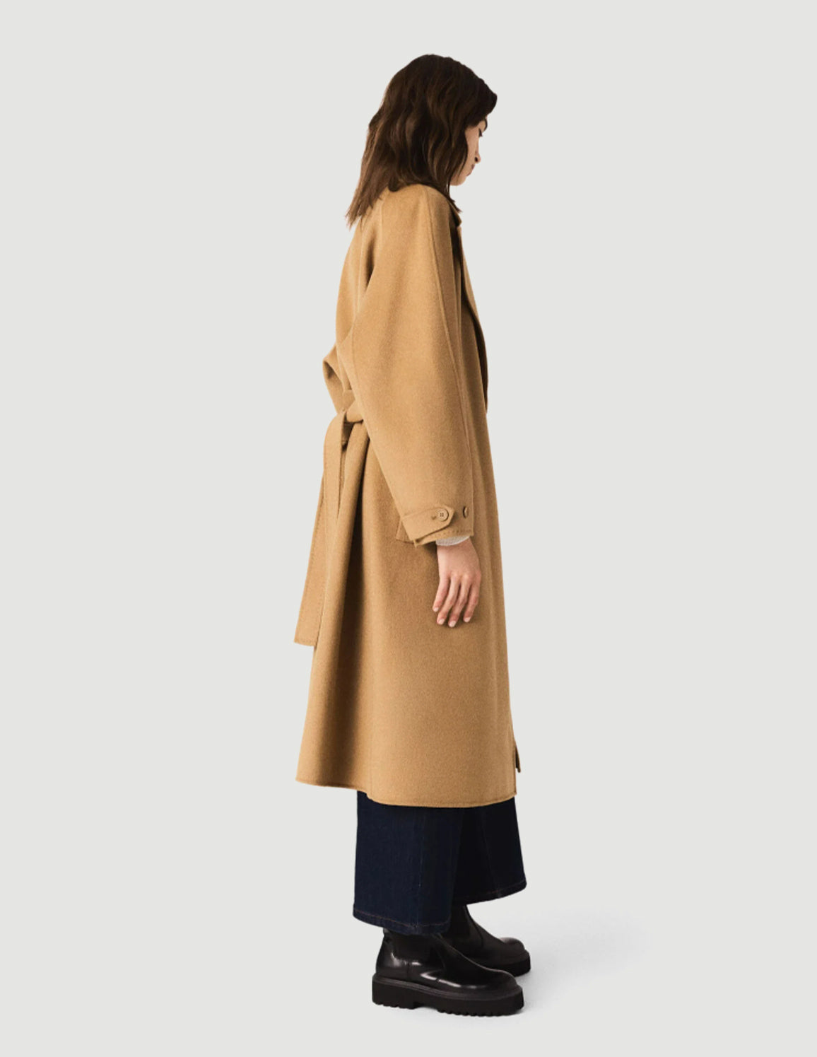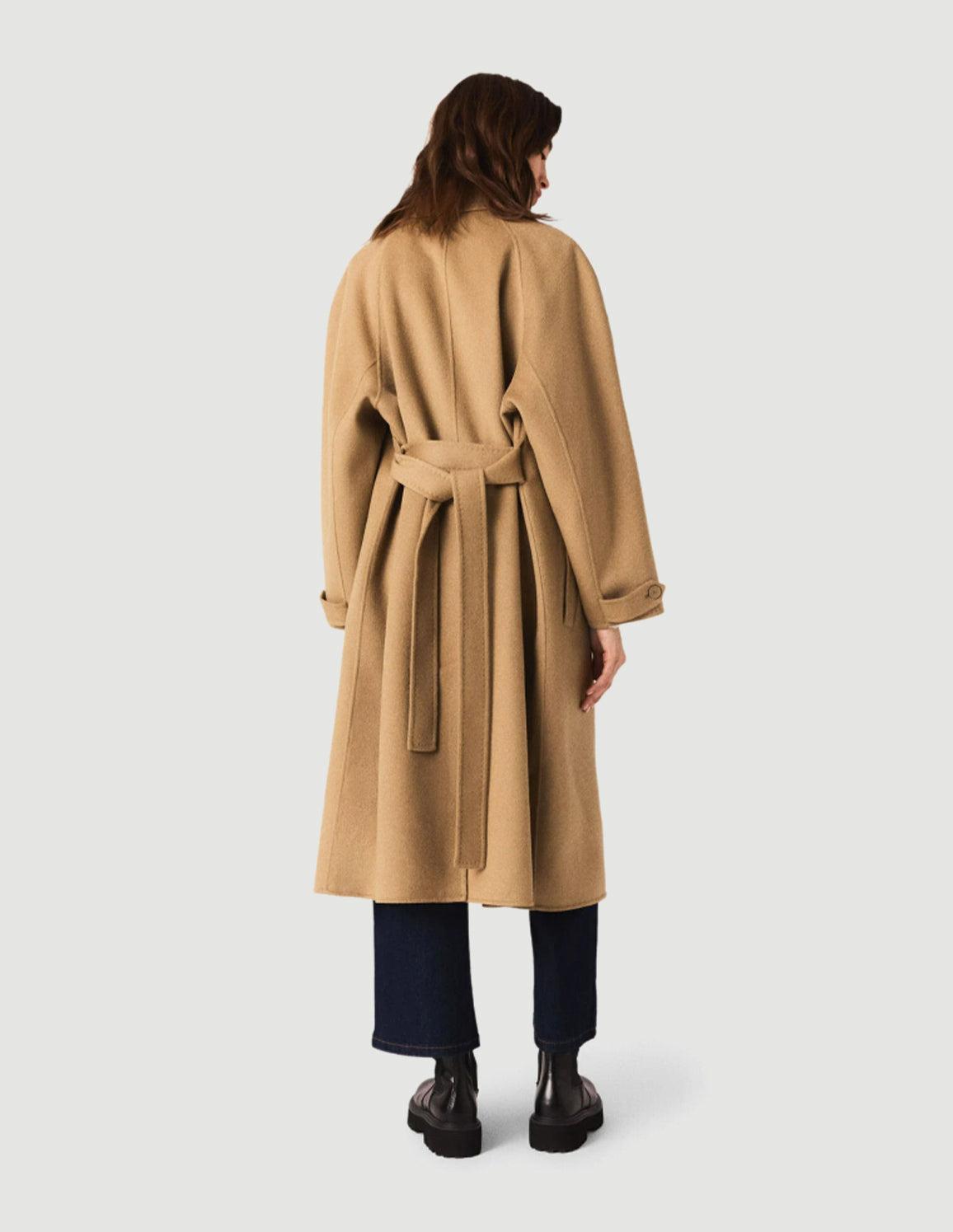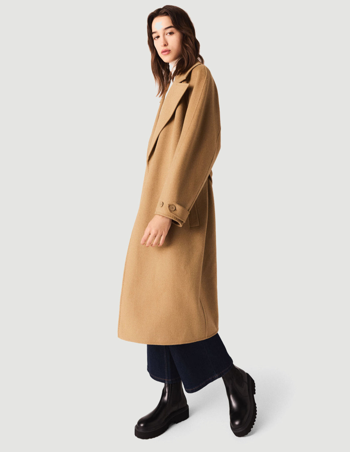 • This double-faced wool coat revisits retro style with a modern twist and gently envelops the figure. The large lapel collar and cuff tabs create a bold look, while the back slit ensures ease of movement and fluidity. A piece that is both strong and understated, to be worn with dark, straight-cut jeans and an ecru turtleneck jumper. Slip a scarf underneath to wear as a belt and complete the look with chunky-soled boots for a confident metropolitan touch.