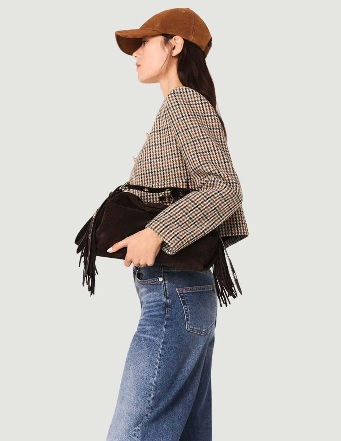 • The Miss M is the statement accessory for the Maje wardrobe. It features the hallmarks of the classic M bag—rectangular handles, fringing and topstitching—and comes in a suede version, accentuated with gold-tone metallic details. With its multiple carrying options and signature finishes, it complements any style, from the most urban to the most casual.
