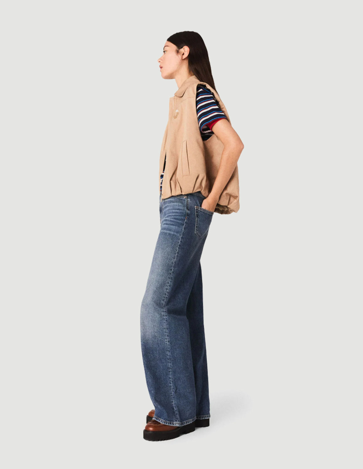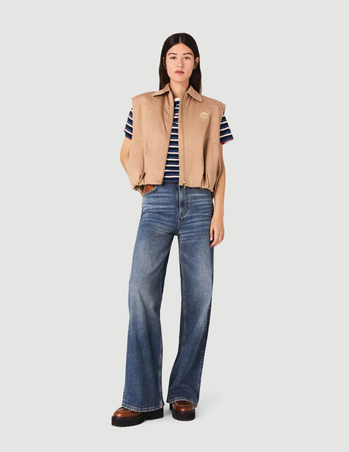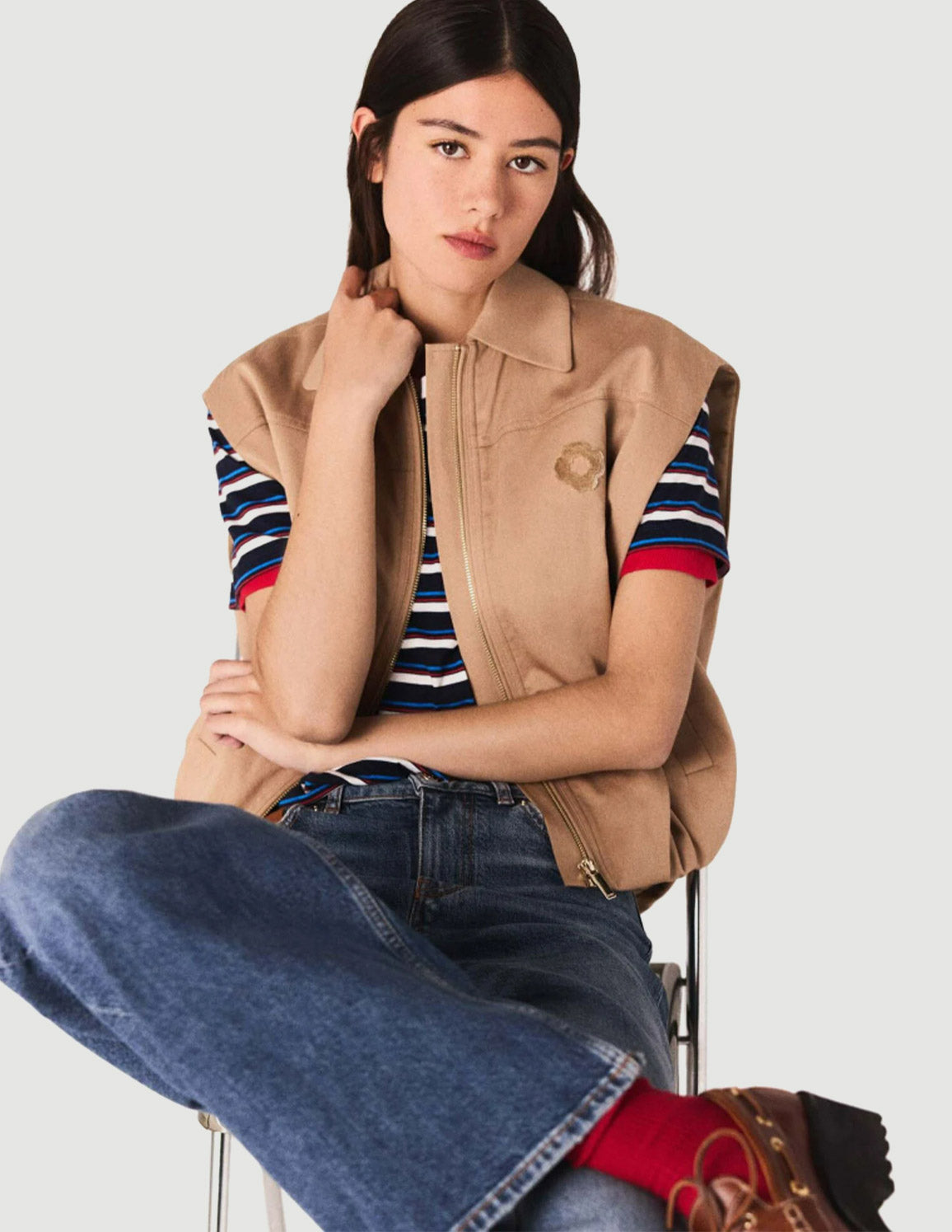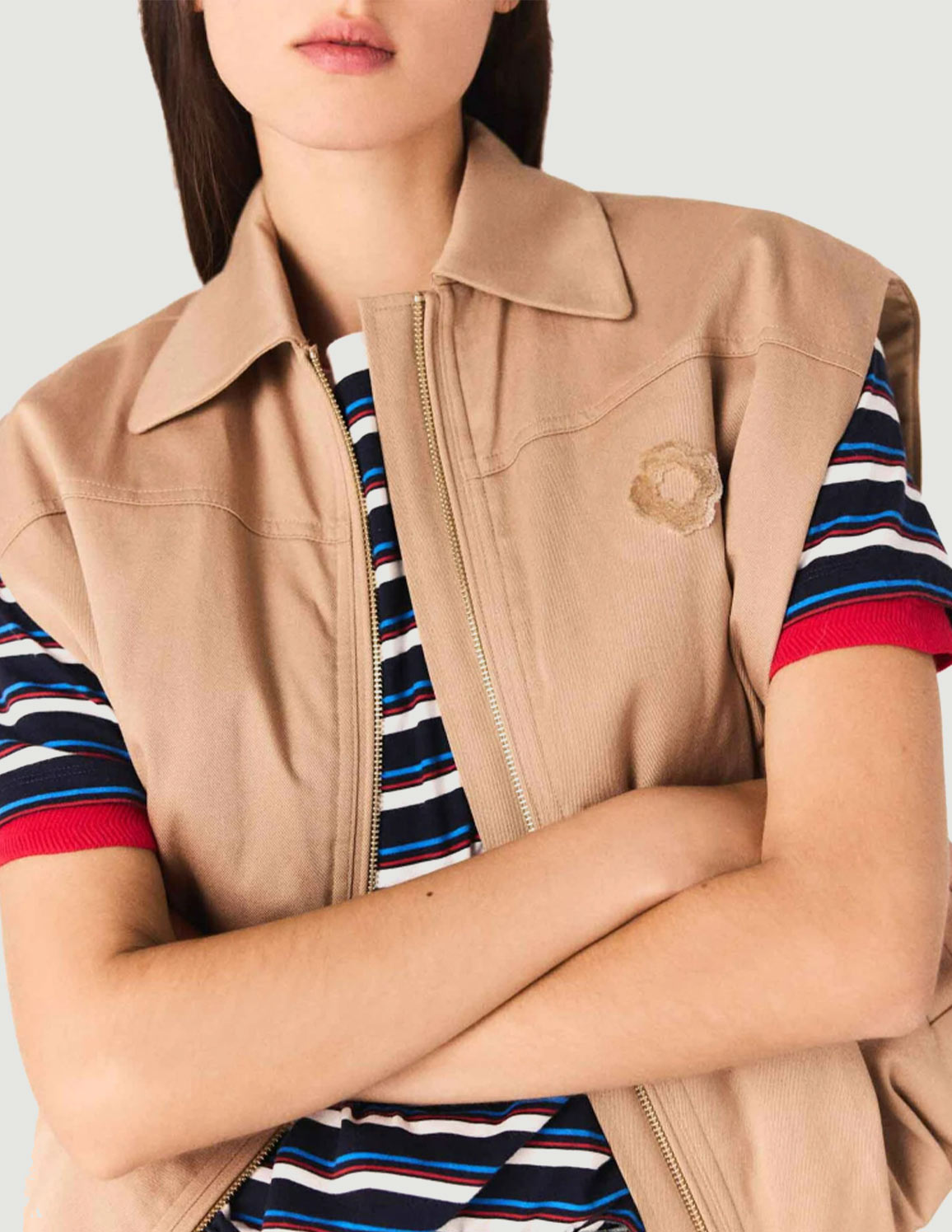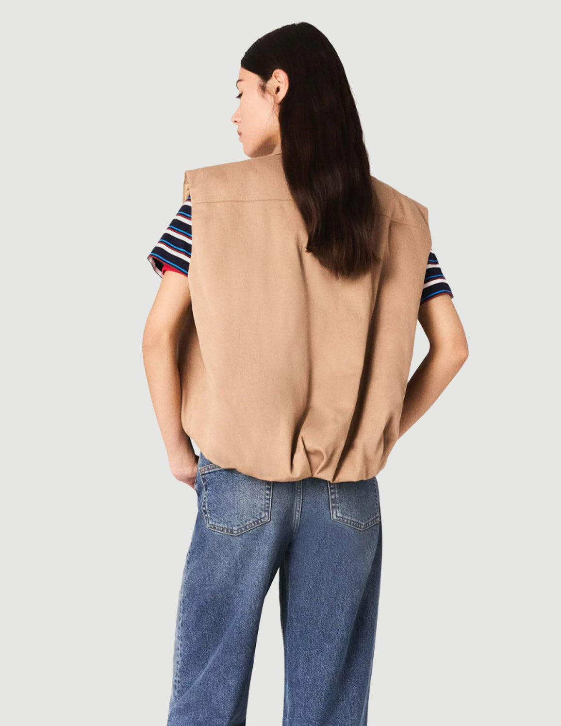 • This sleeveless jacket highlights the waist with a discreet elastic and layers easily over any silhouette.
