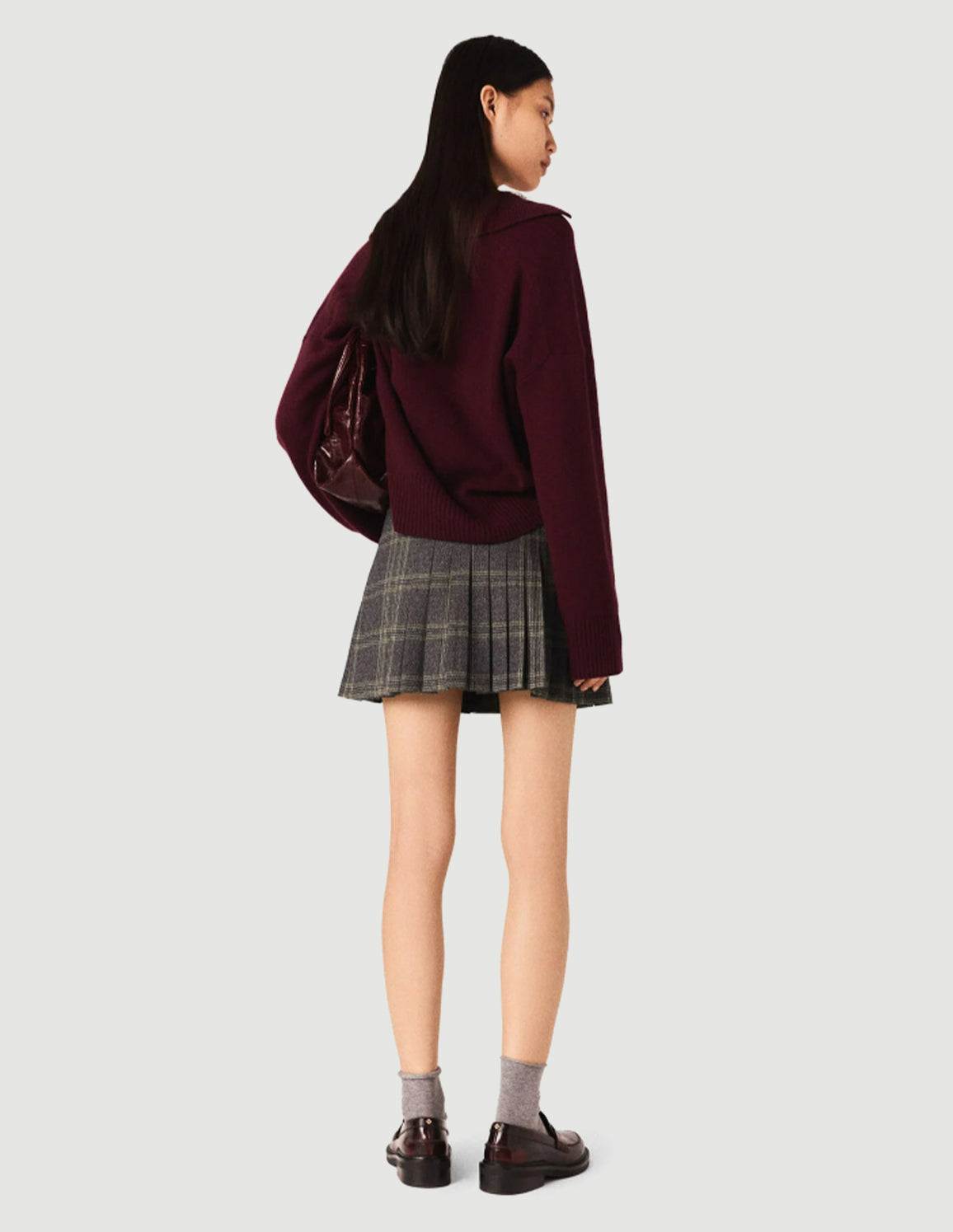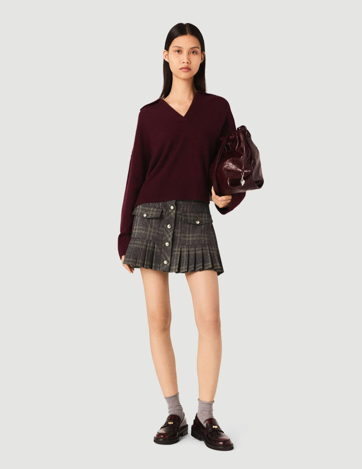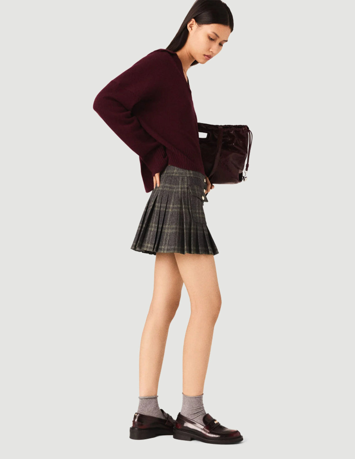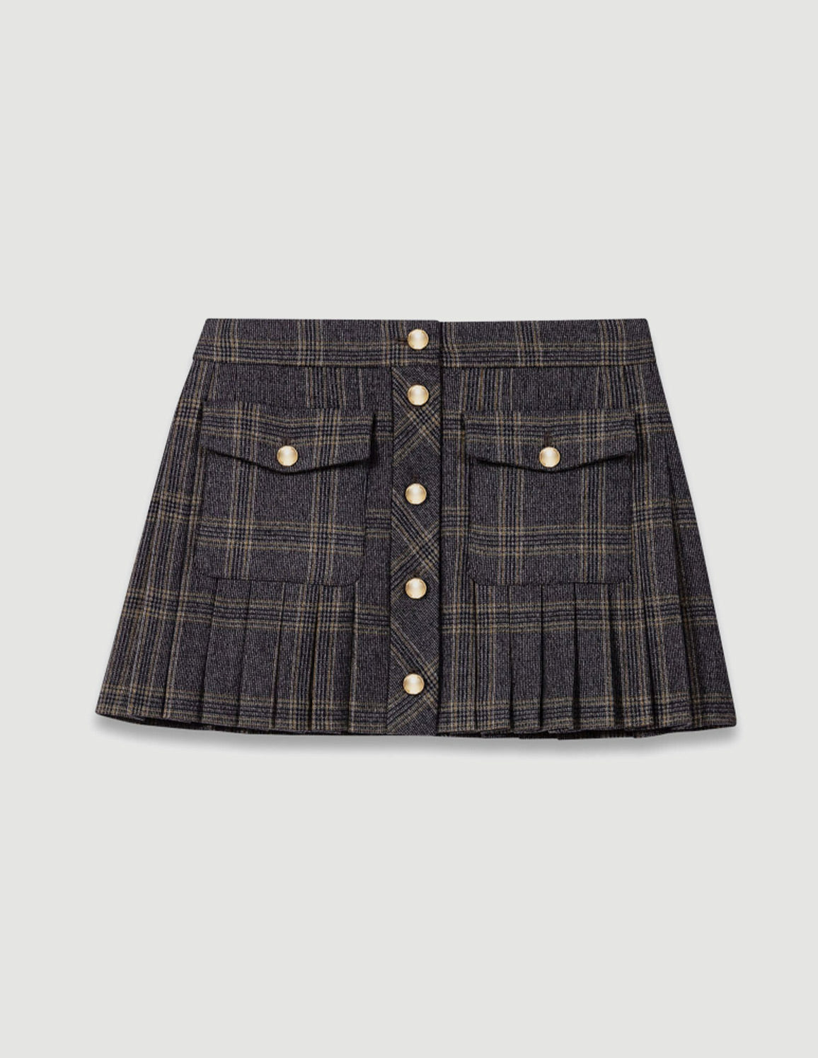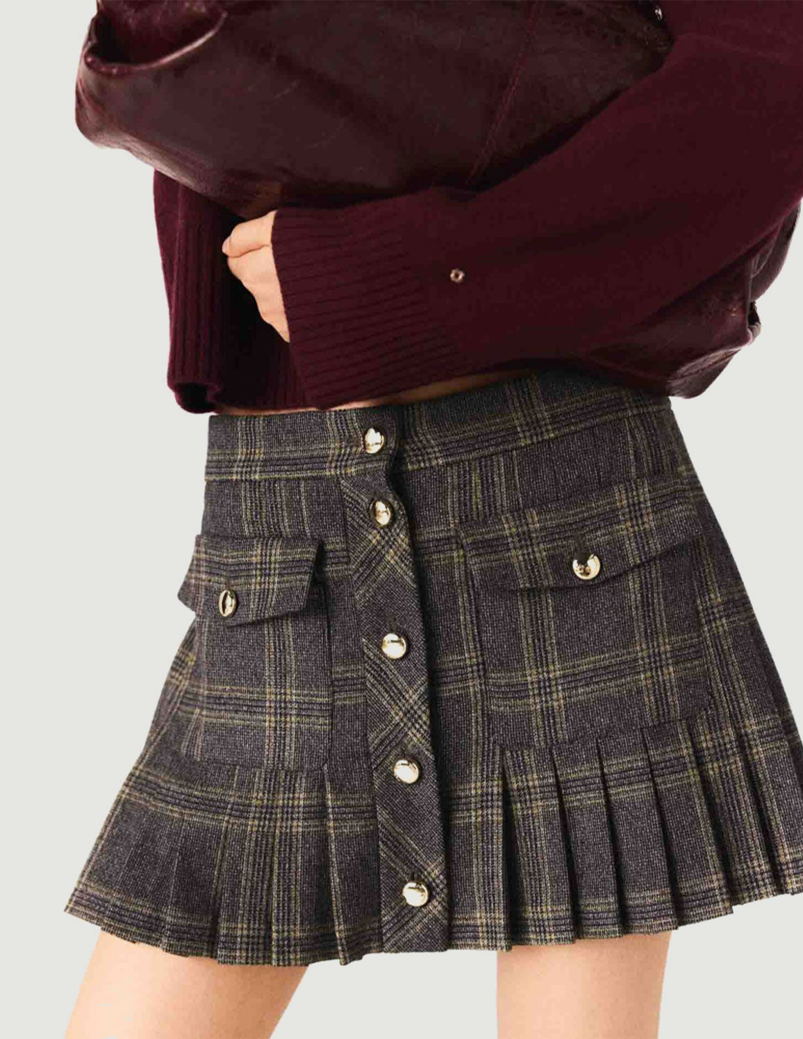 • This pleated checked skirt is a must-have for a preppy chic wardrobe. Its flap pockets and gold buttons create a look that is both structured and feminine, to be paired with a matching jacket or oversized knitwear to play with contrasts. Add a pair of loafers and socks to complete the look.