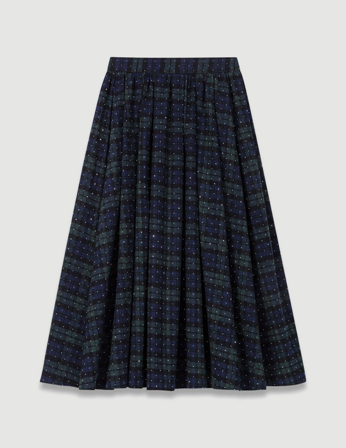 • This long skirt combines the classic look of checks with the sparkle of rhinestones. Full and flared, it offers fluid movement and a redefined silhouette. Wear it with a loose shirt with an embroidered collar and high boots for an assertive look, or create a twin set with the matching shirt.