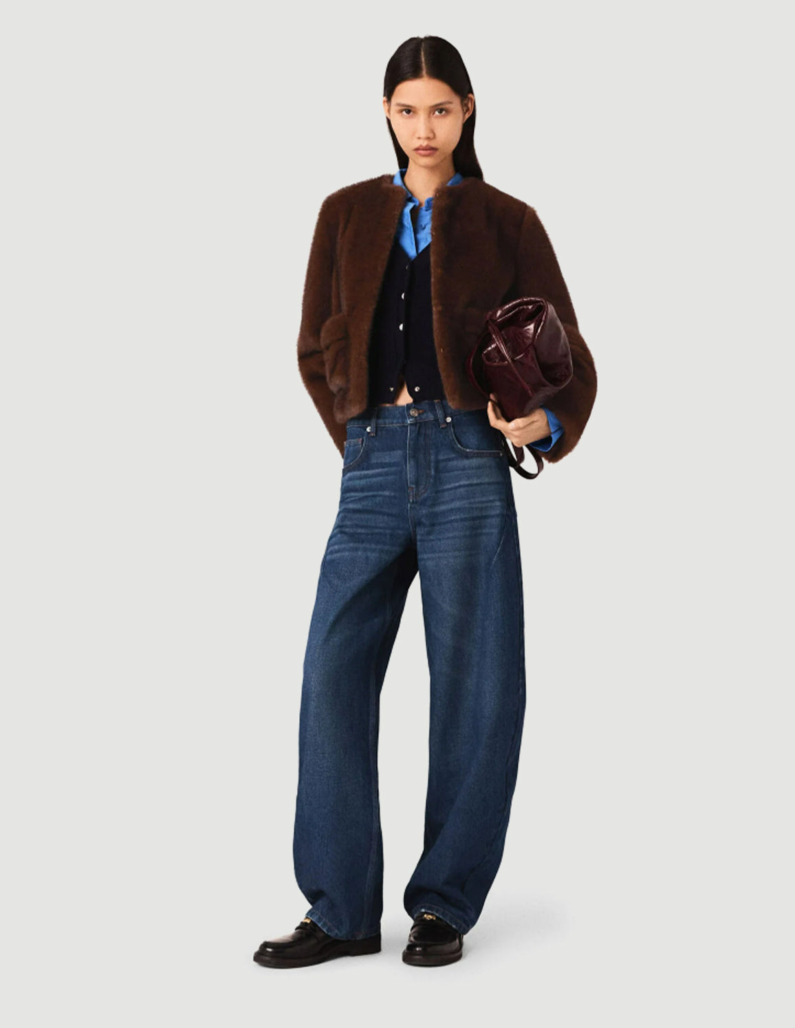 • This season, bold black pieces and precious accessories enhance every silhouette, for a look that is radiant, intense and refined.This short, long-sleeved faux fur coat has a captivatingly cosy texture and a structured drape. With a round neck and button fastening, it can be worn for everyday or with an evening outfit. Ideal with a sequin skirt, loafers and a mini bag for a sophisticated contrast.