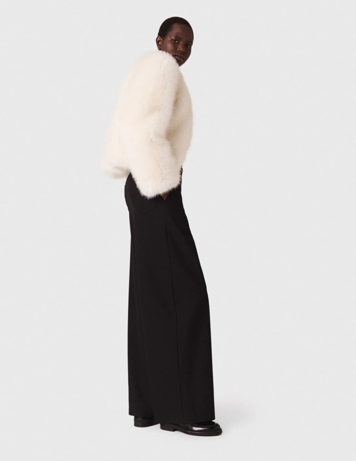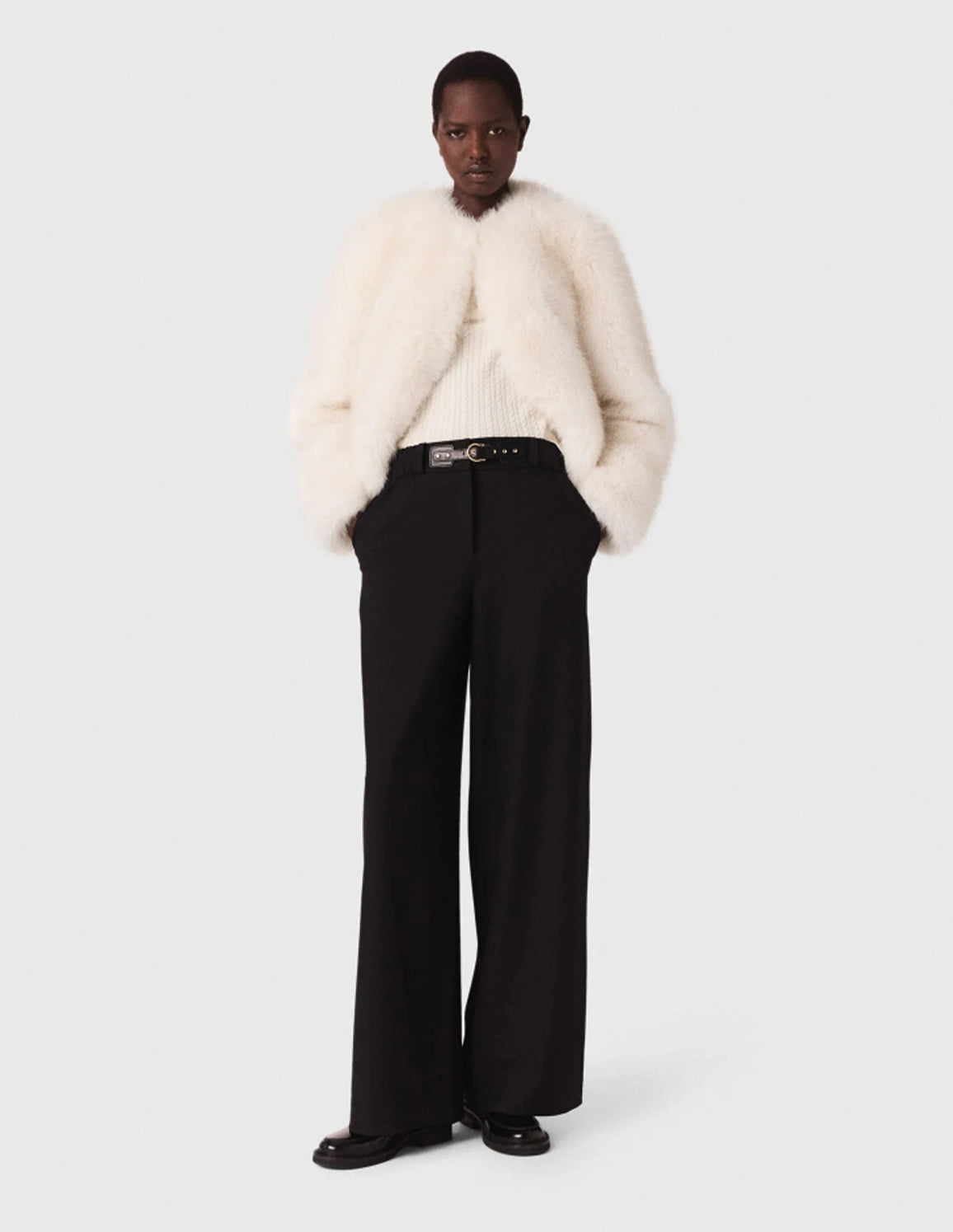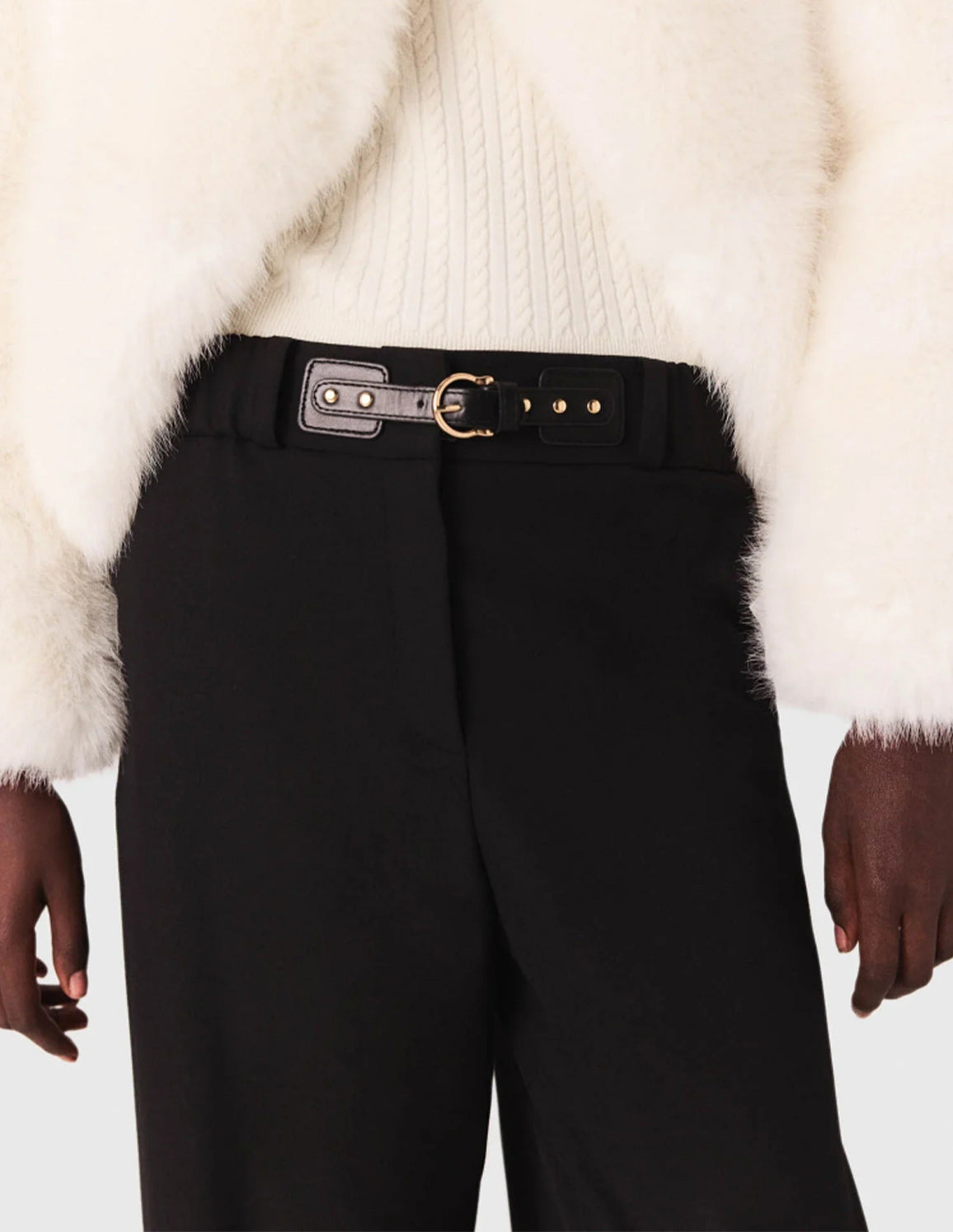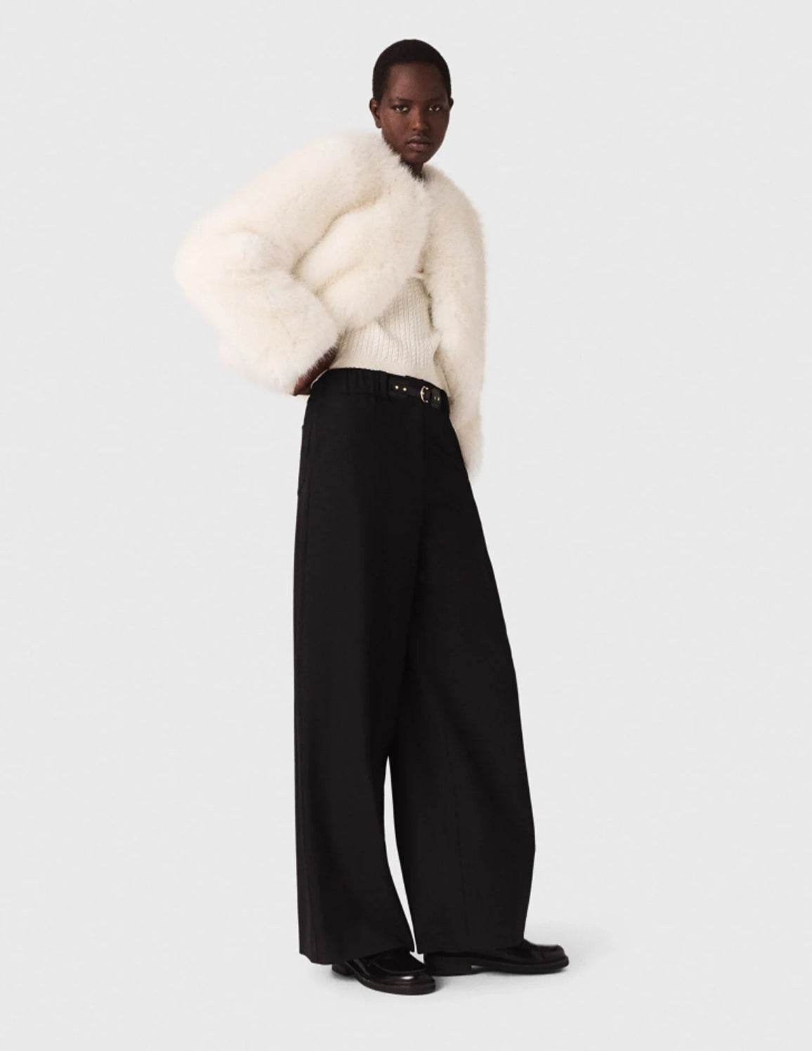 • A structured silhouette and masterful comfort come together in these reimagined suit trousers, with their wide, flowing cut. The waist is accentuated by a leather-effect strap with a jewellery buckle, a subtle detail that evokes the retro elegance so central to this new collection.