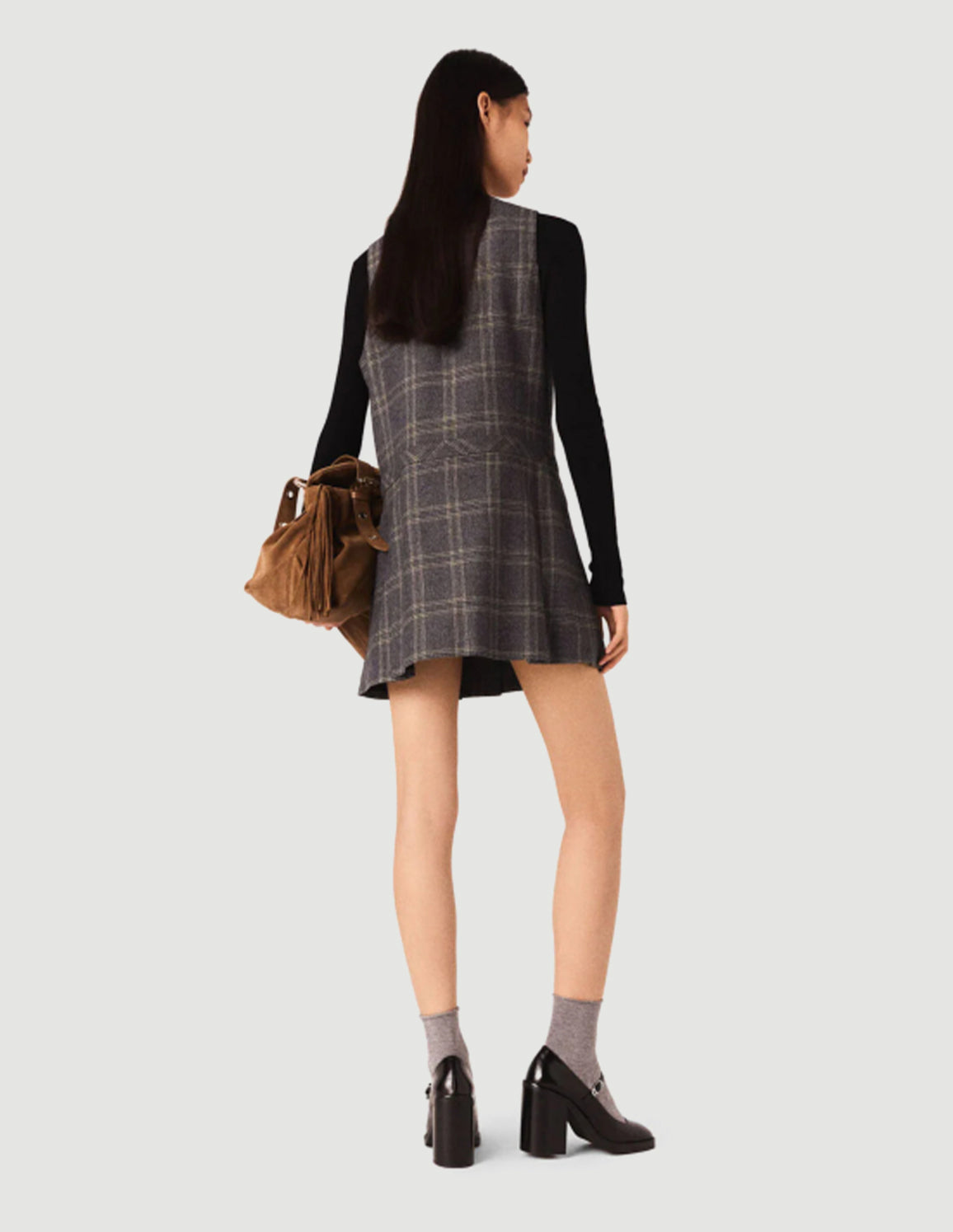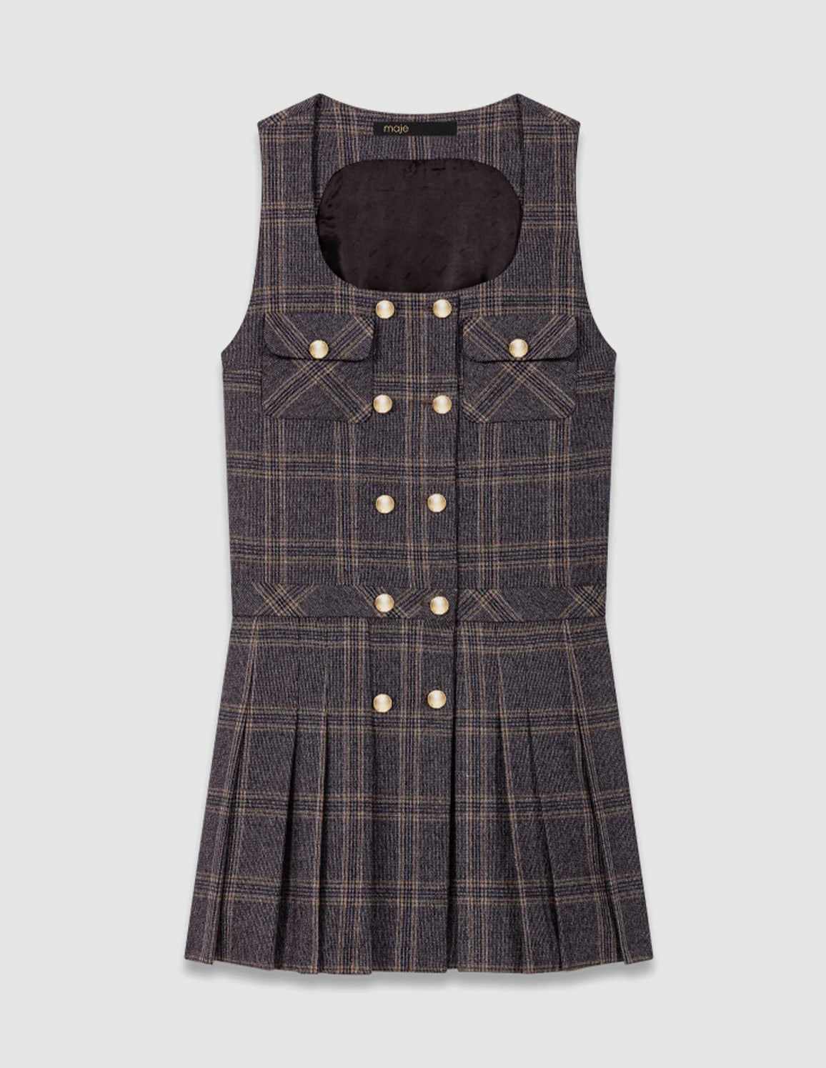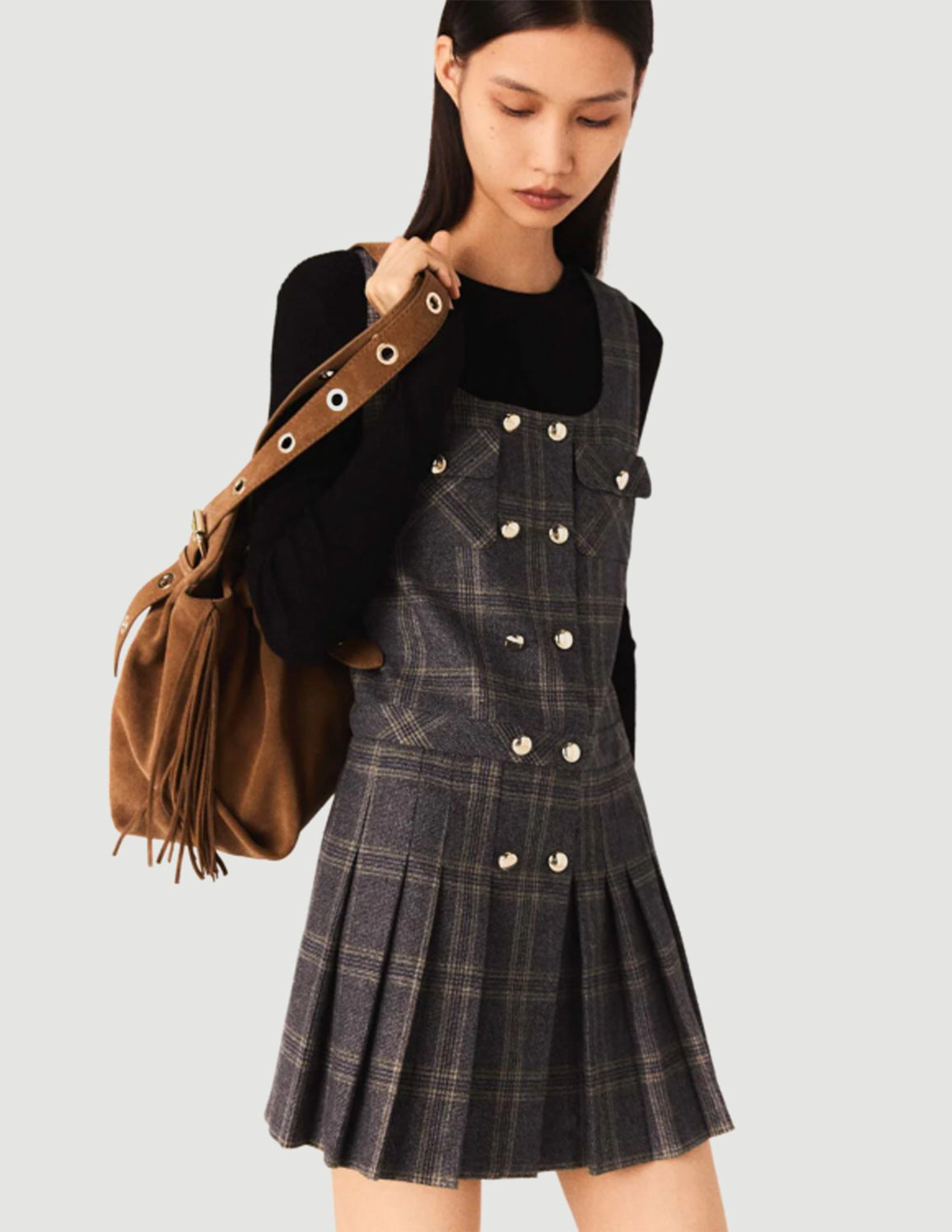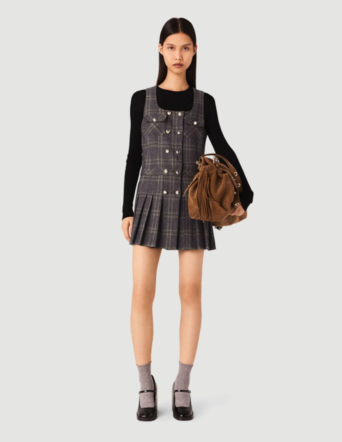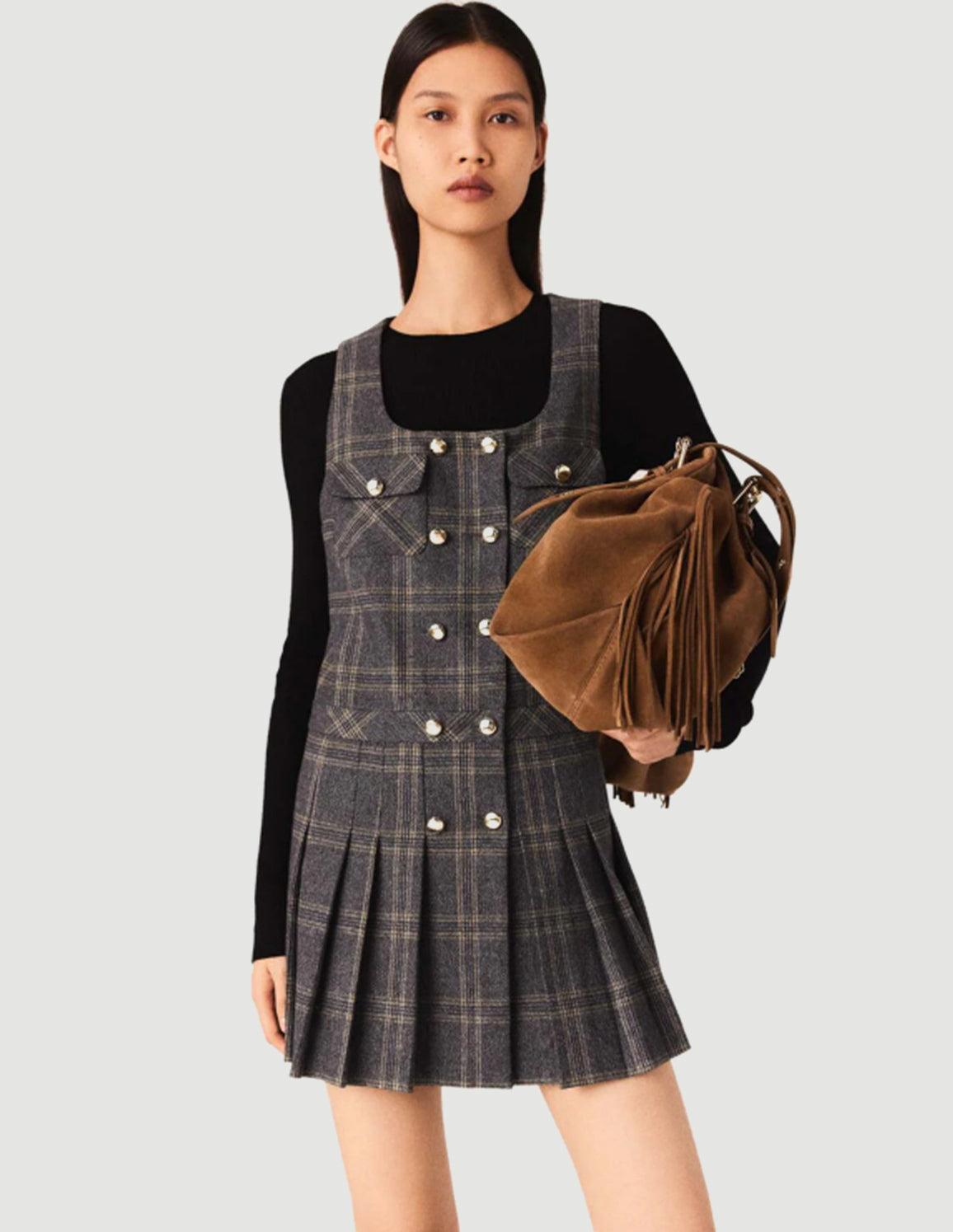 • This check dress focuses on a graphic construction: a rounded neckline, buttoned pockets and a pleated skirt for a nod to the school uniform. It can be worn on its own, or layered with a long-sleeved knit, and accessorised with statement pieces like heeled Mary Janes and a fringed bag.