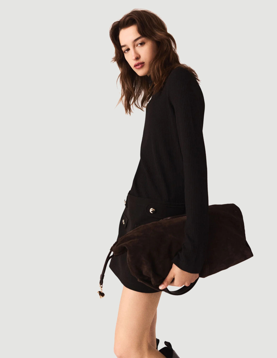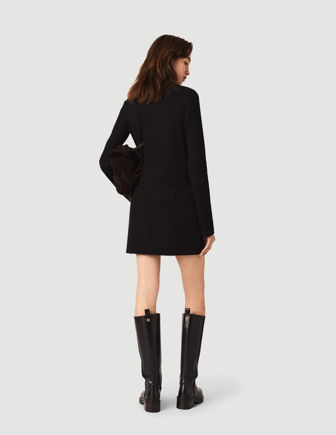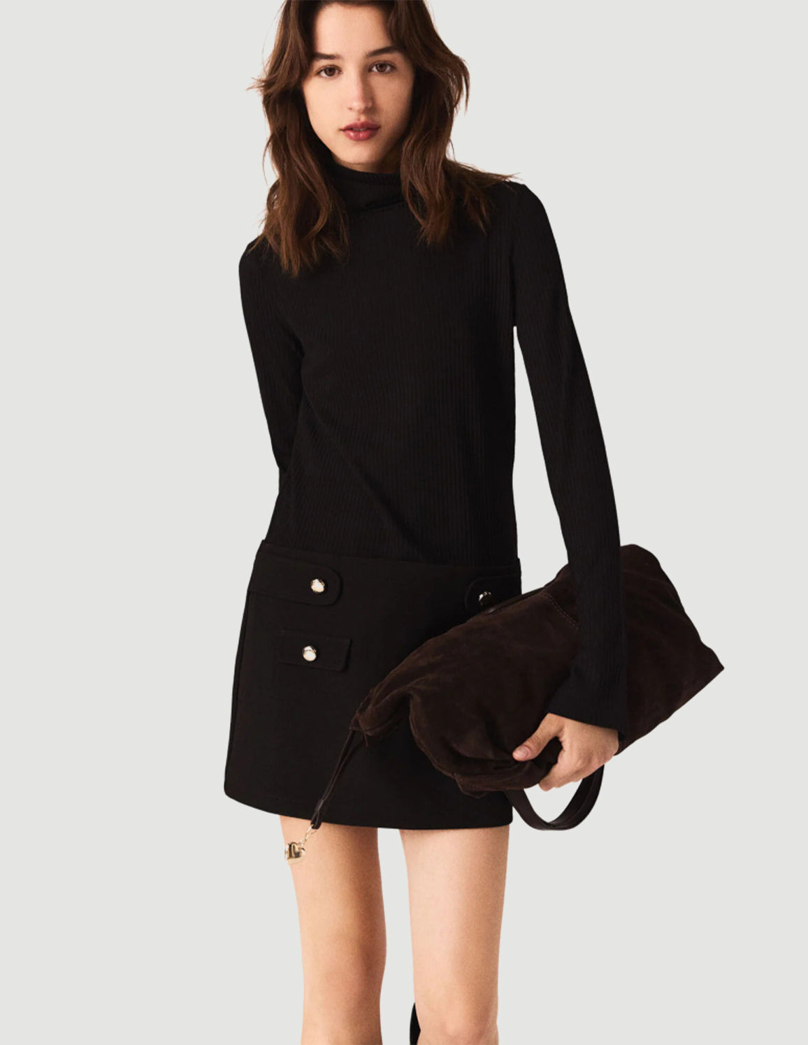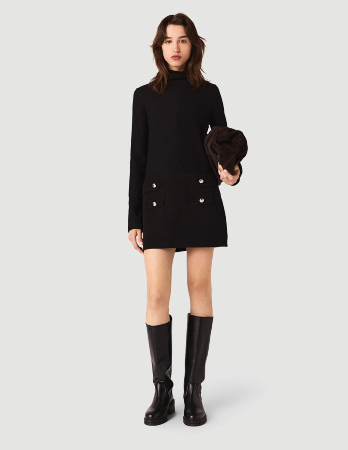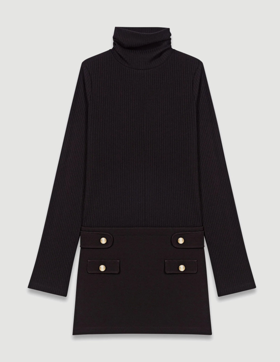 • A masterful play on textures for a confident silhouette. This short dress combines a ribbed knit top with the structure of a tailoring-inspired skirt, adorned with button tabs. The two-piece illusion, accentuated by the contrasting materials, enhances the modernity of the piece. An enveloping turtleneck, clean finishes and a defined waist: everything is designed to elegantly accentuate the figure.