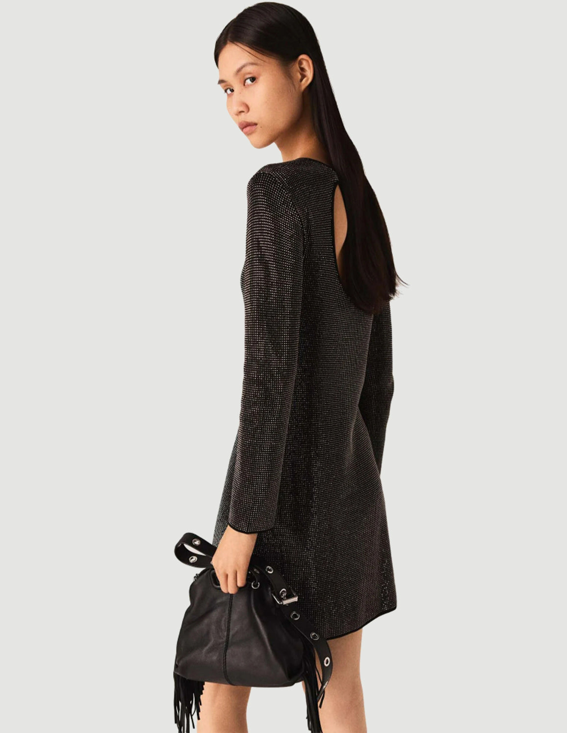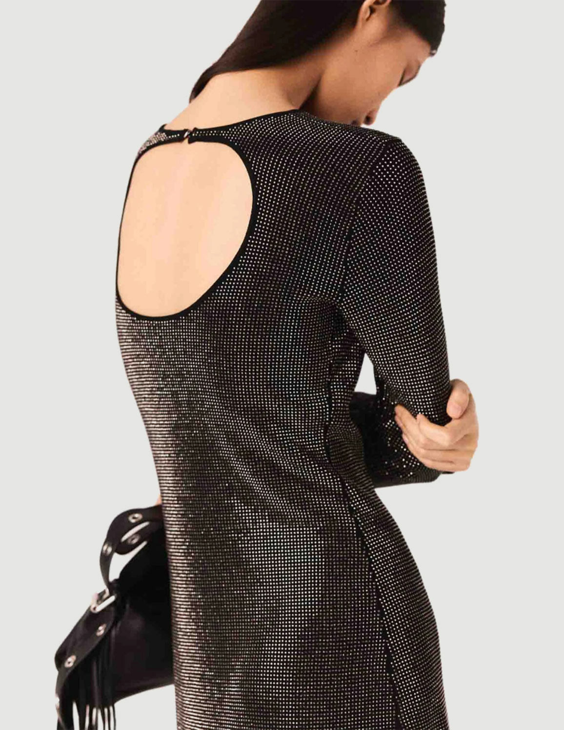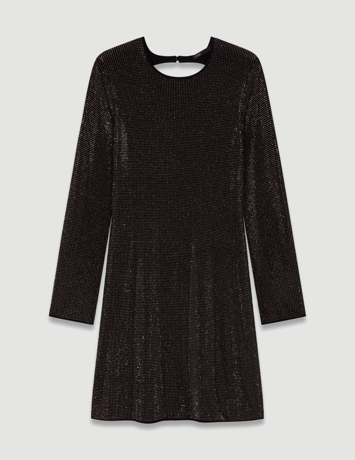 • The look sparkles right down to the details. With its discreet rhinestones, soft knit and subtly open back, this short dress combines glamour and everyday comfort. A piece that catches the light without overdoing it.