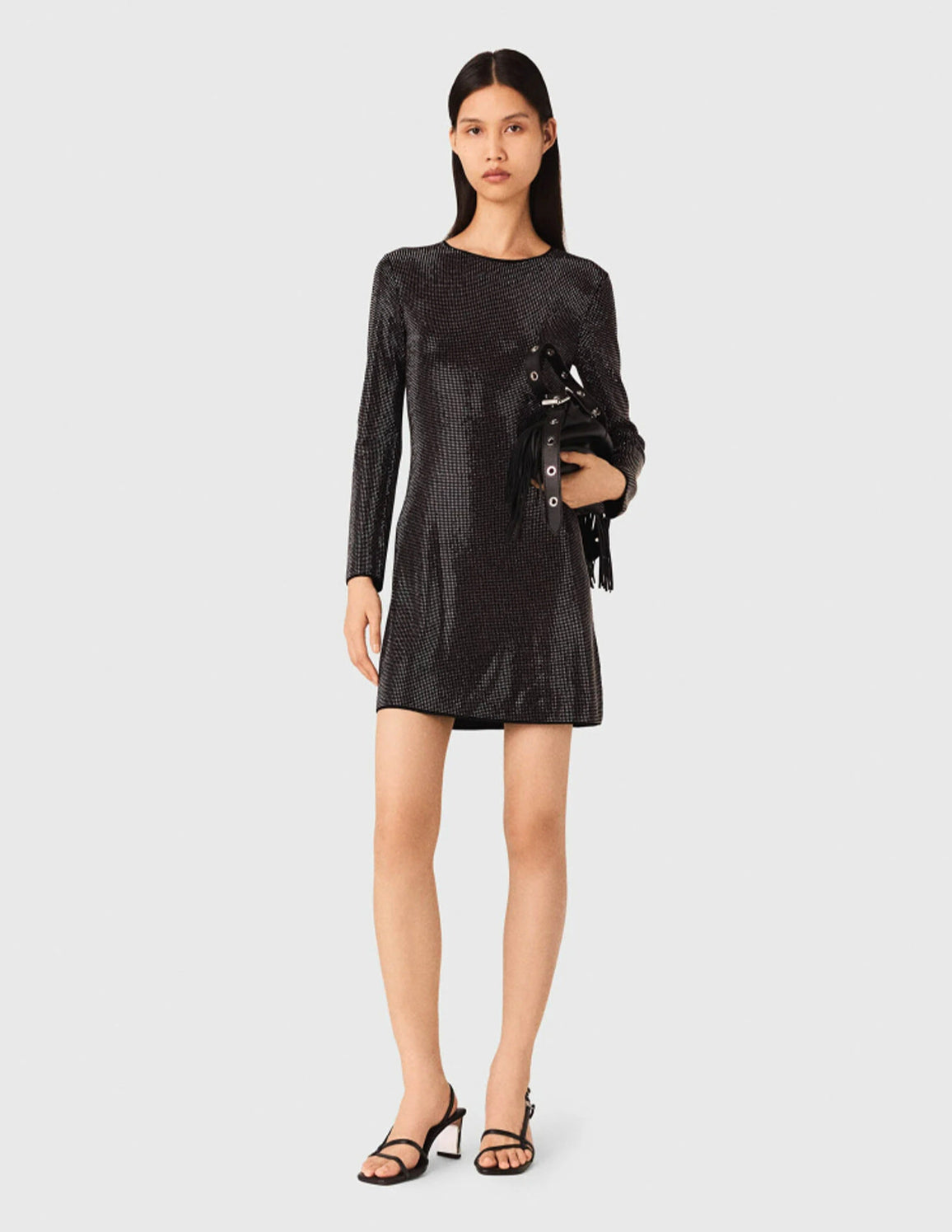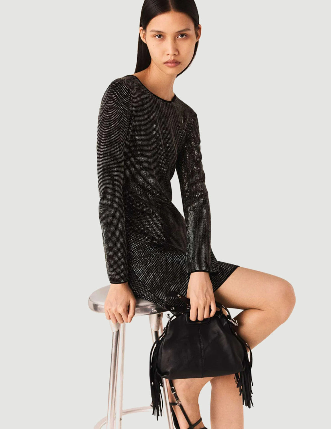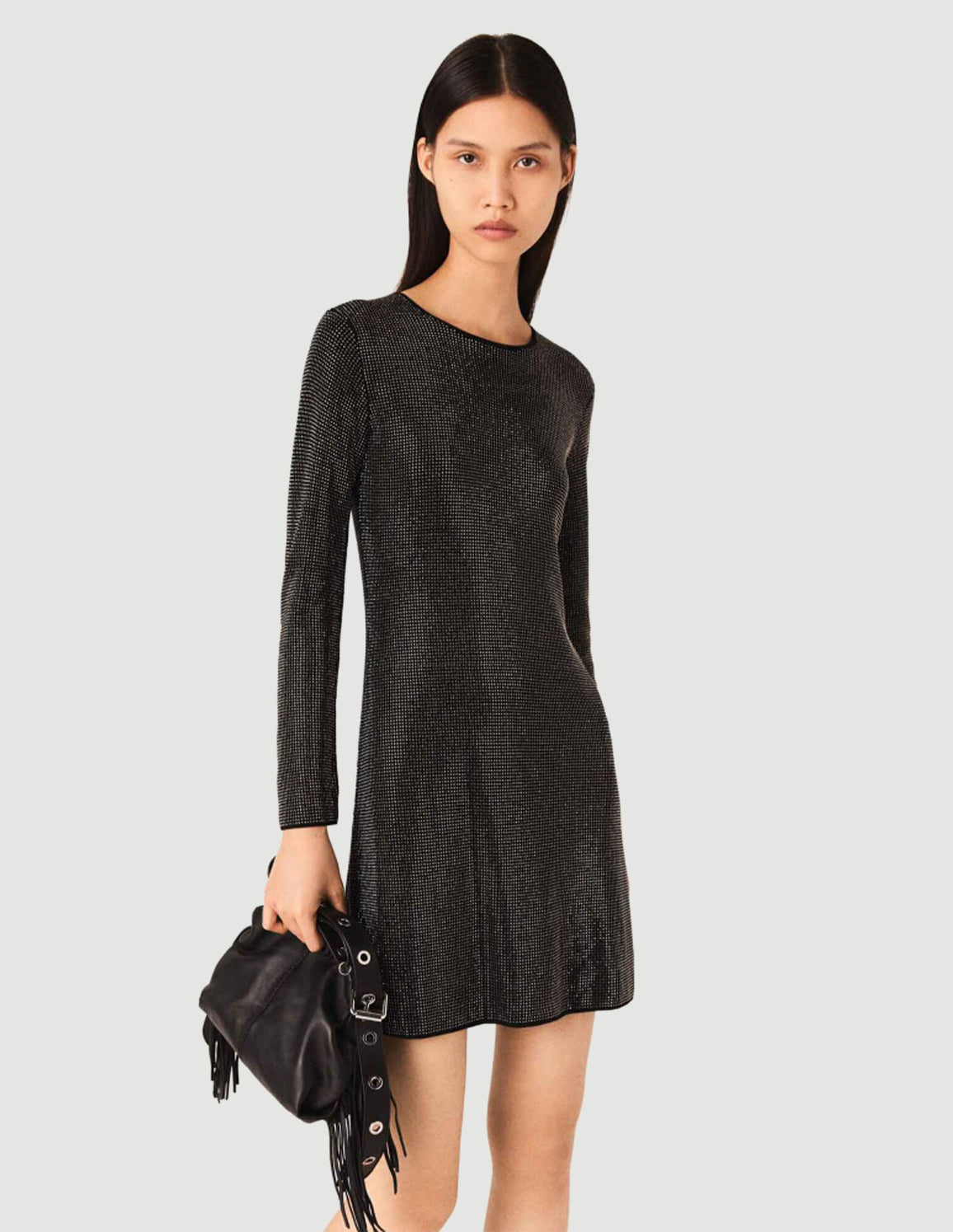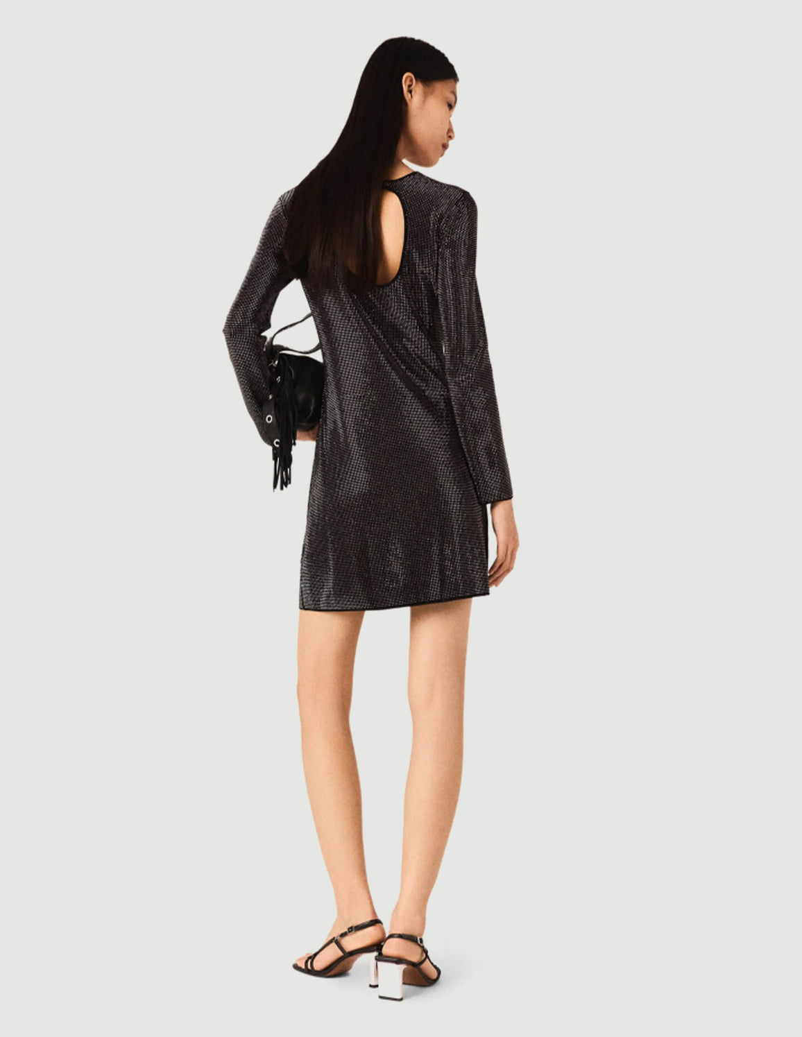 • The look sparkles right down to the details. With its discreet rhinestones, soft knit and subtly open back, this short dress combines glamour and everyday comfort. A piece that catches the light without overdoing it.