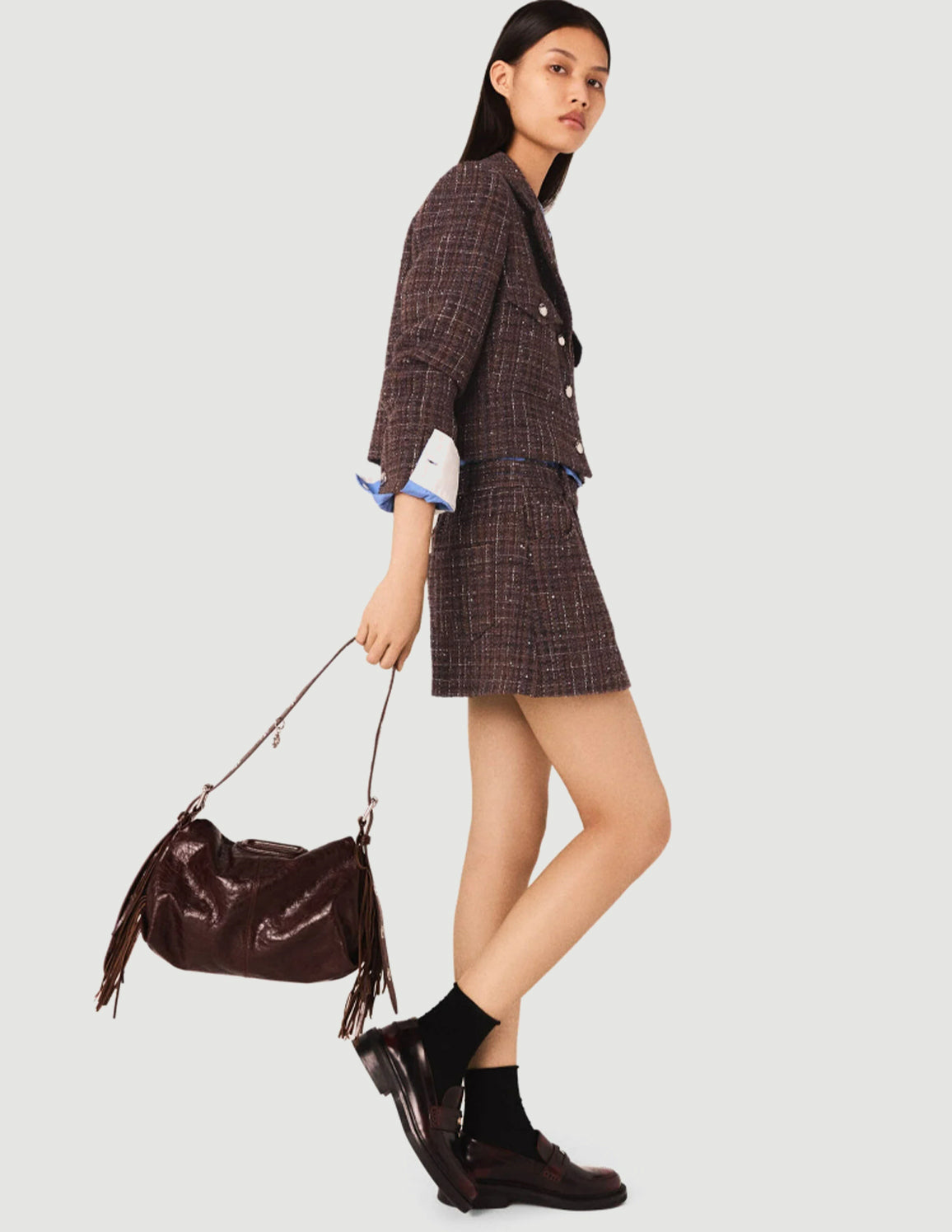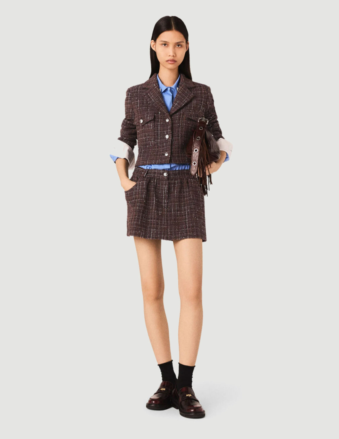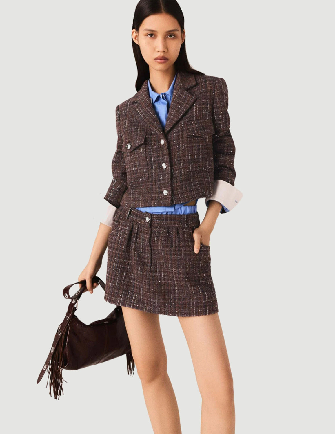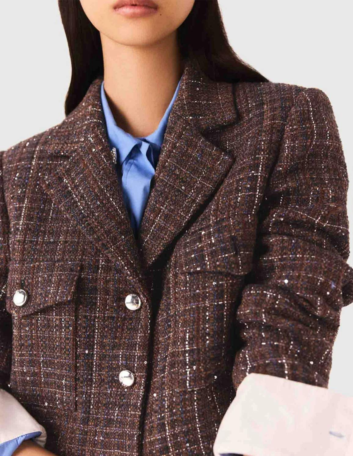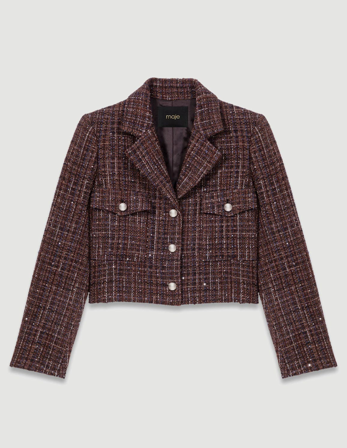 • A subtle play on contrasts between the retro elegance of tweed and the sparkle of sequins. This cropped jacket provides a structured look while gently catching the light. Featuring a lapel collar, chest patch pockets and a button fastening, it charms with its straight cut and assertive look.