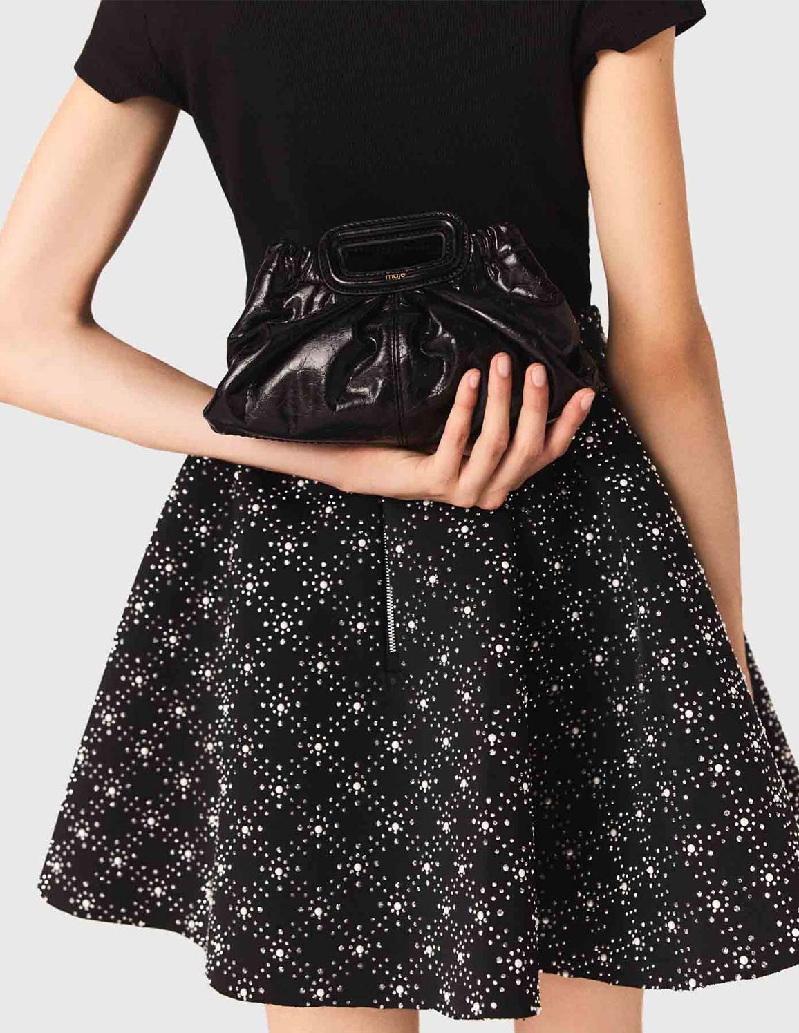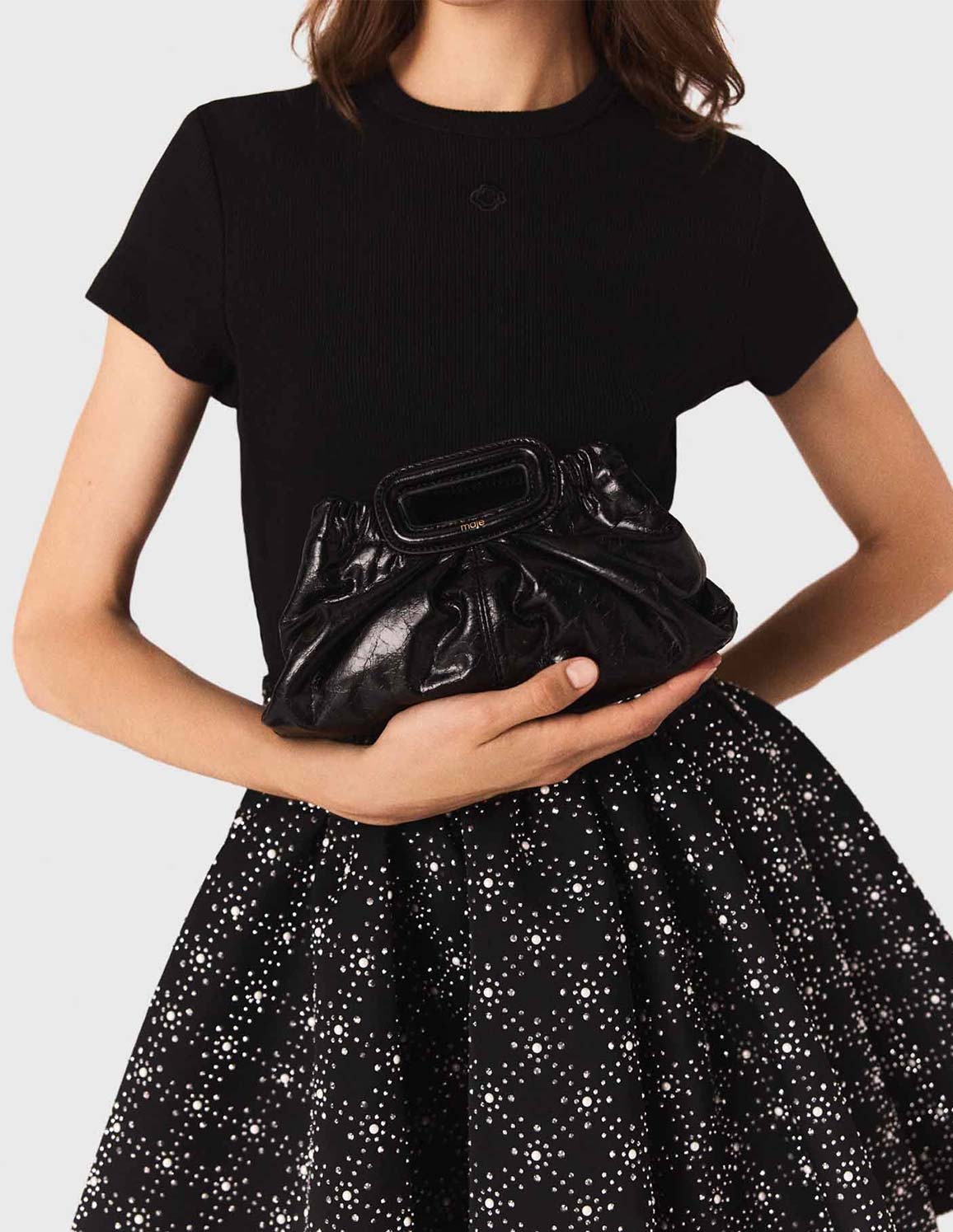 • The studio unveils its must-have in a mini version. Made from distressed-effect leather, this soft, ruched clutch features the iconic Maje handle, this time in magnetic metal. Its knotted straps and adjustable, removable shoulder strap offer different ways to carry it: by hand or crossbody.  Inside, a patch pocket holds all your essentials.