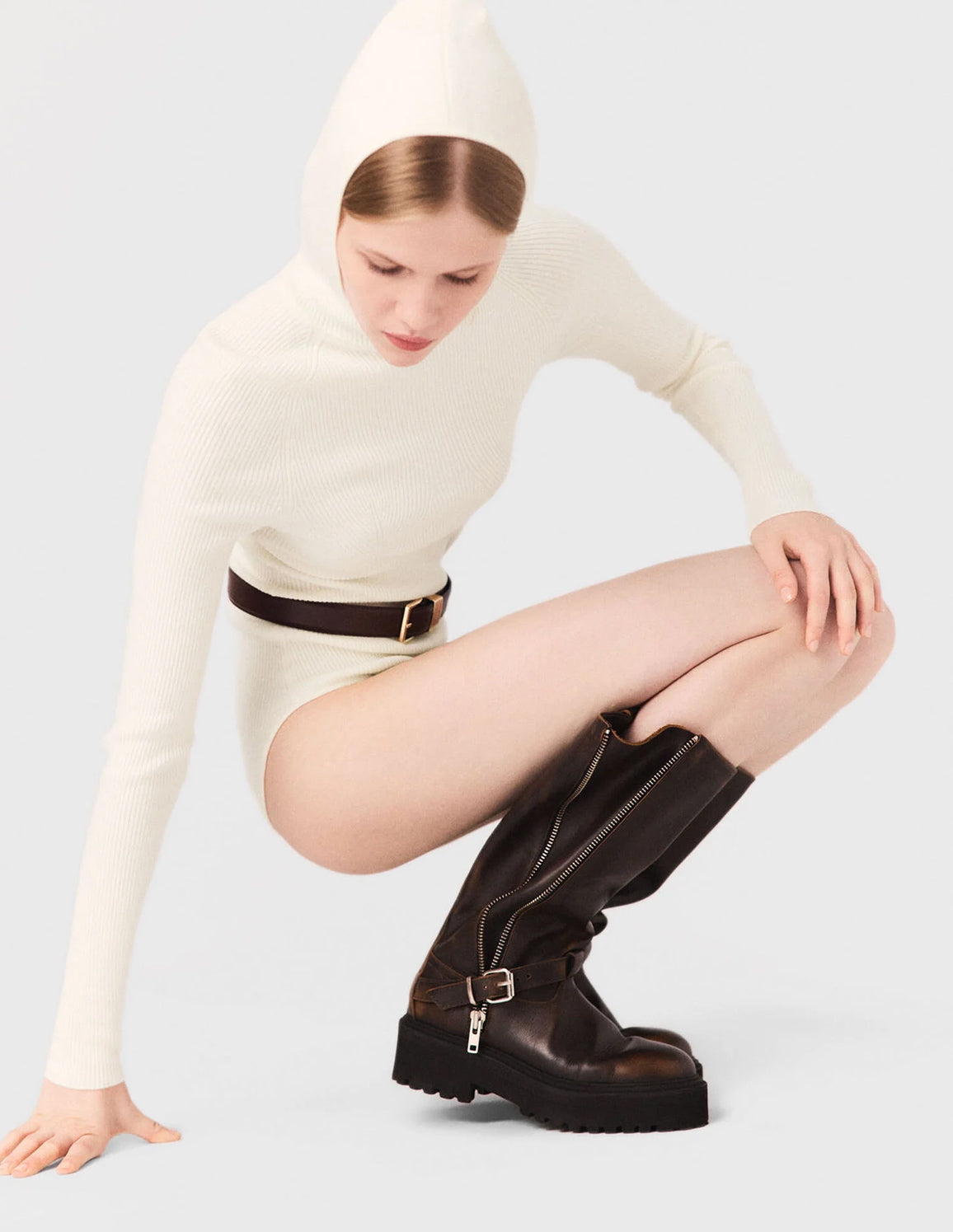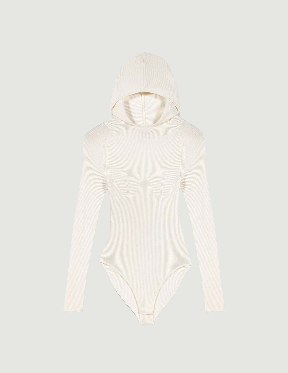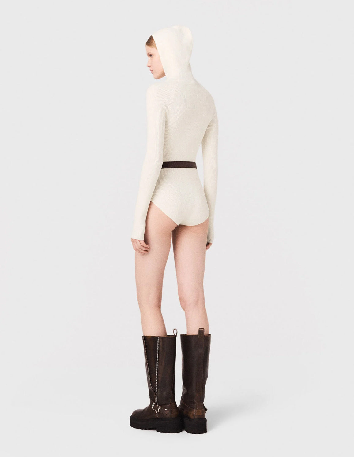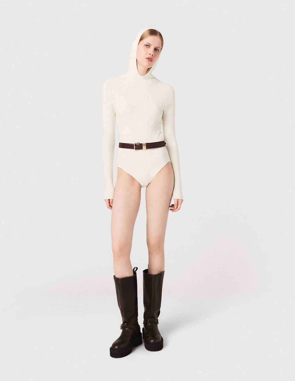 • The rib knit gently hugs the figure, while the hood adds a contemporary touch. An essential wardrobe staple, this bodysuit is an elegant base layer that slips easily under oversized pieces.