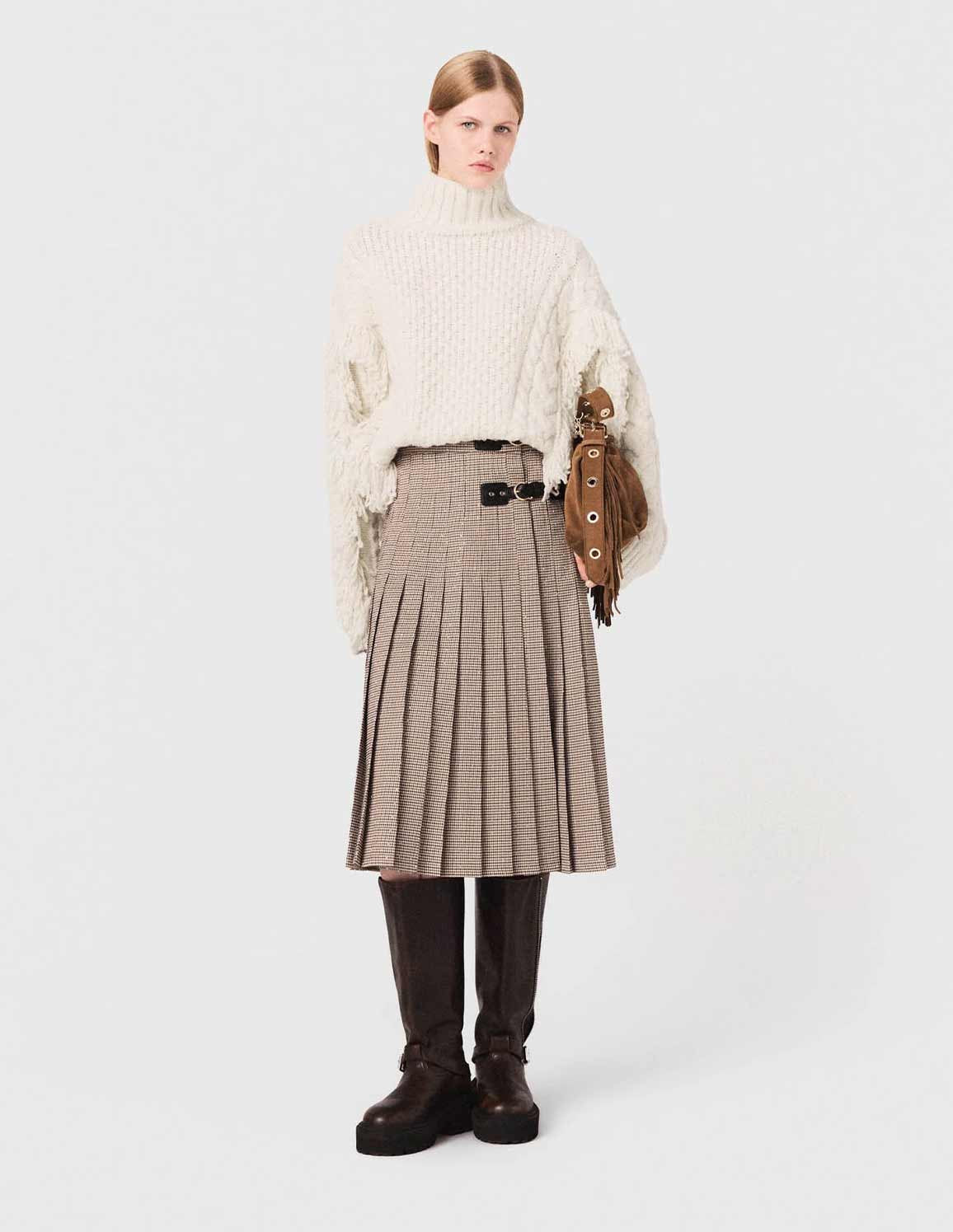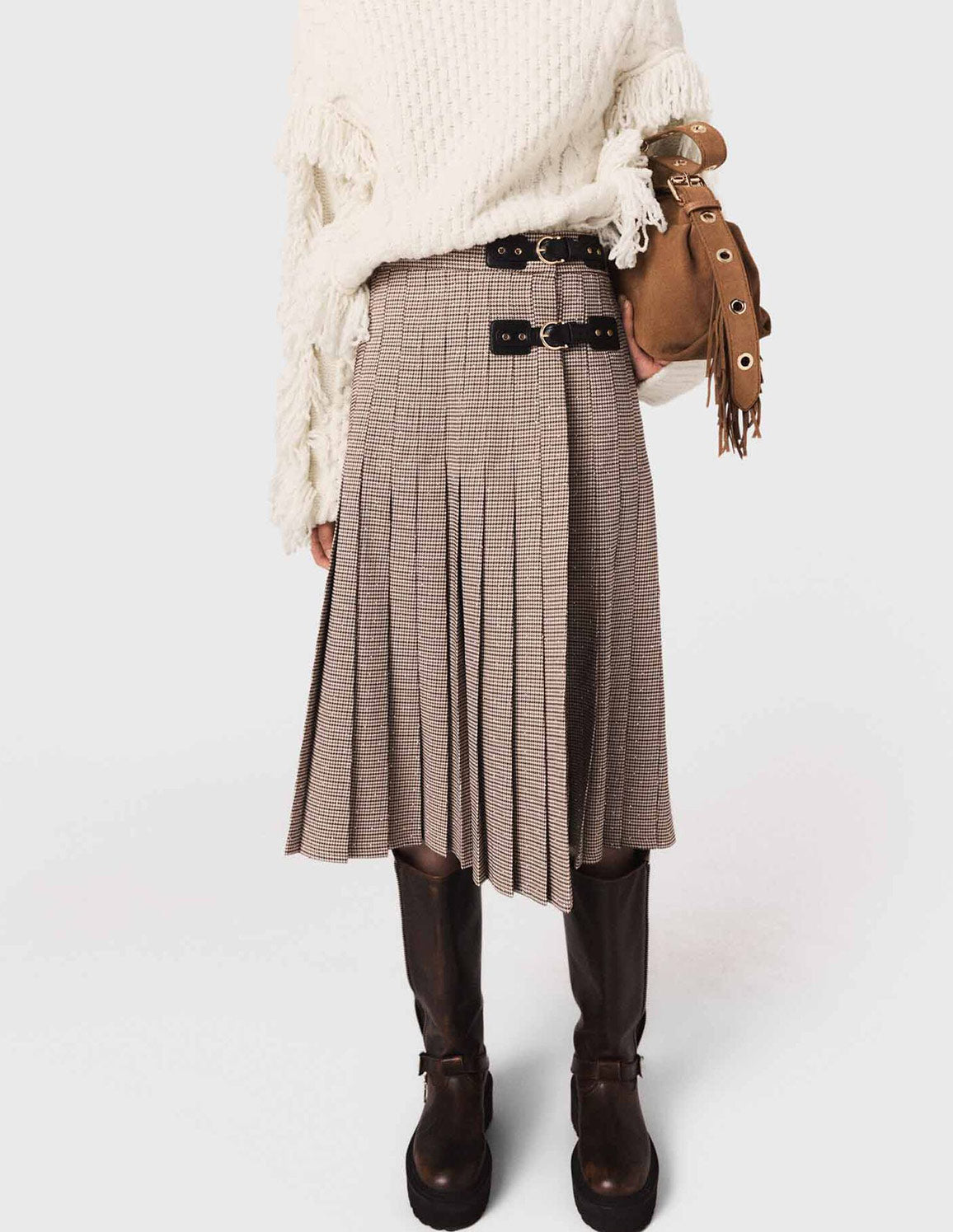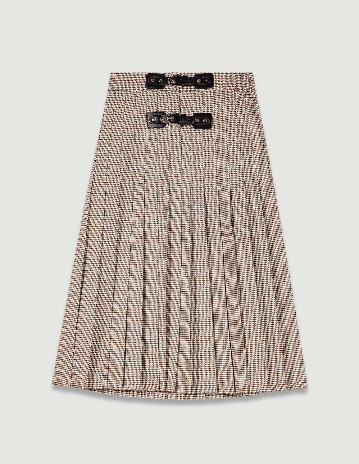 • This pleated houndstooth skirt stands out with the subtle sparkle of its rhinestones and its leather-effect buckles. The structured cut and floaty drape enhance its elegant, metropolitan look.