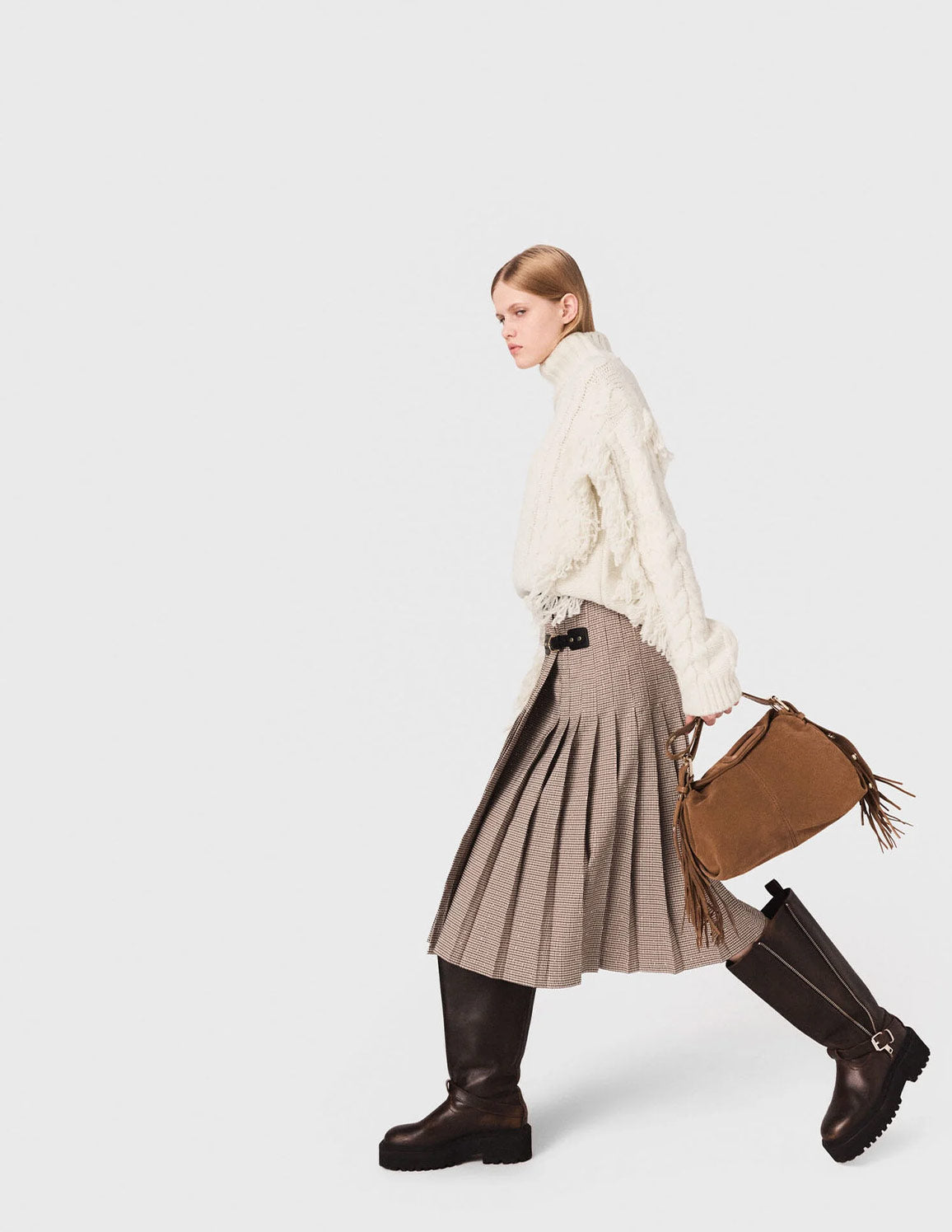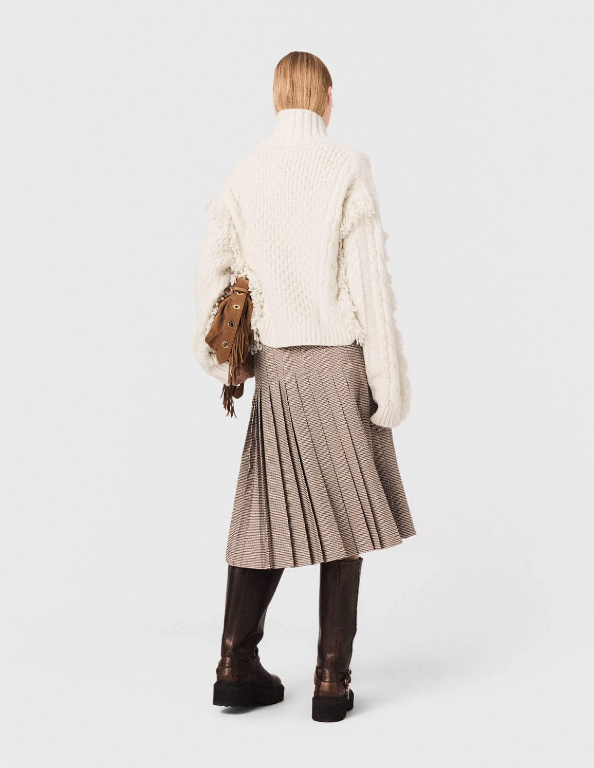 • Create a contrasting look by pairing it with a fringed turtleneck jumper, biker boots and a Miss M bag for a look that is both elegant and bold.