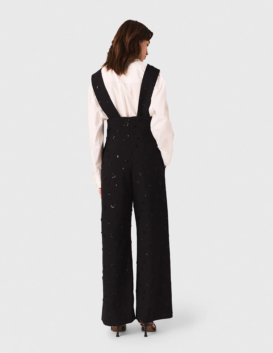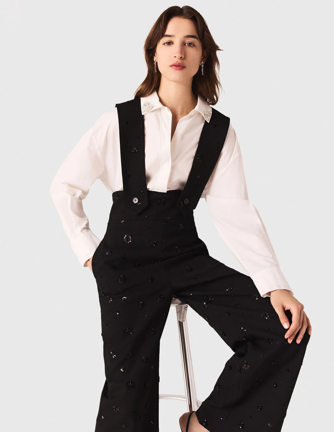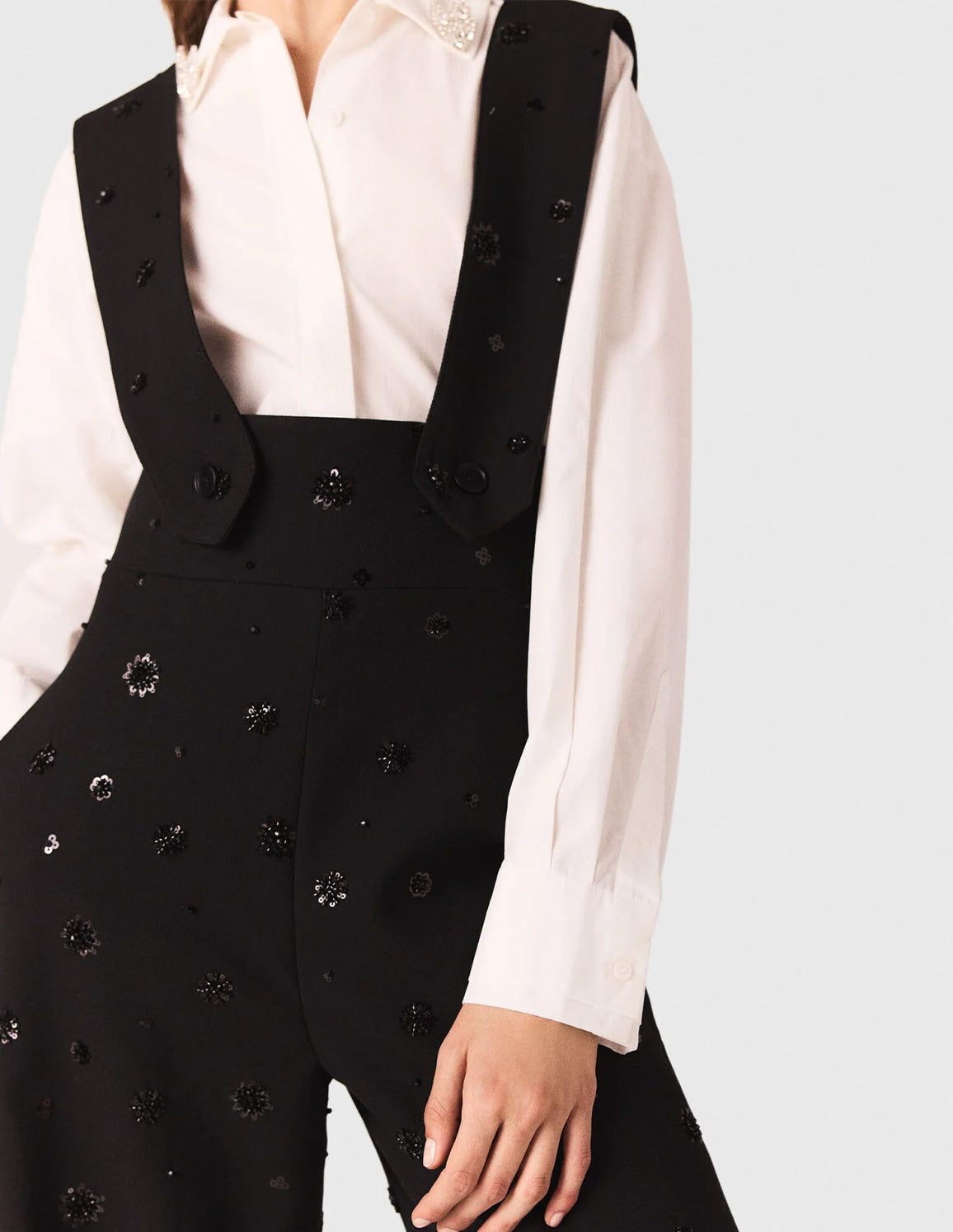 • Designed with an elegant high waist and wide, removable braces, they stand out with their delicate ornamentation of floral pearls and sequins.
