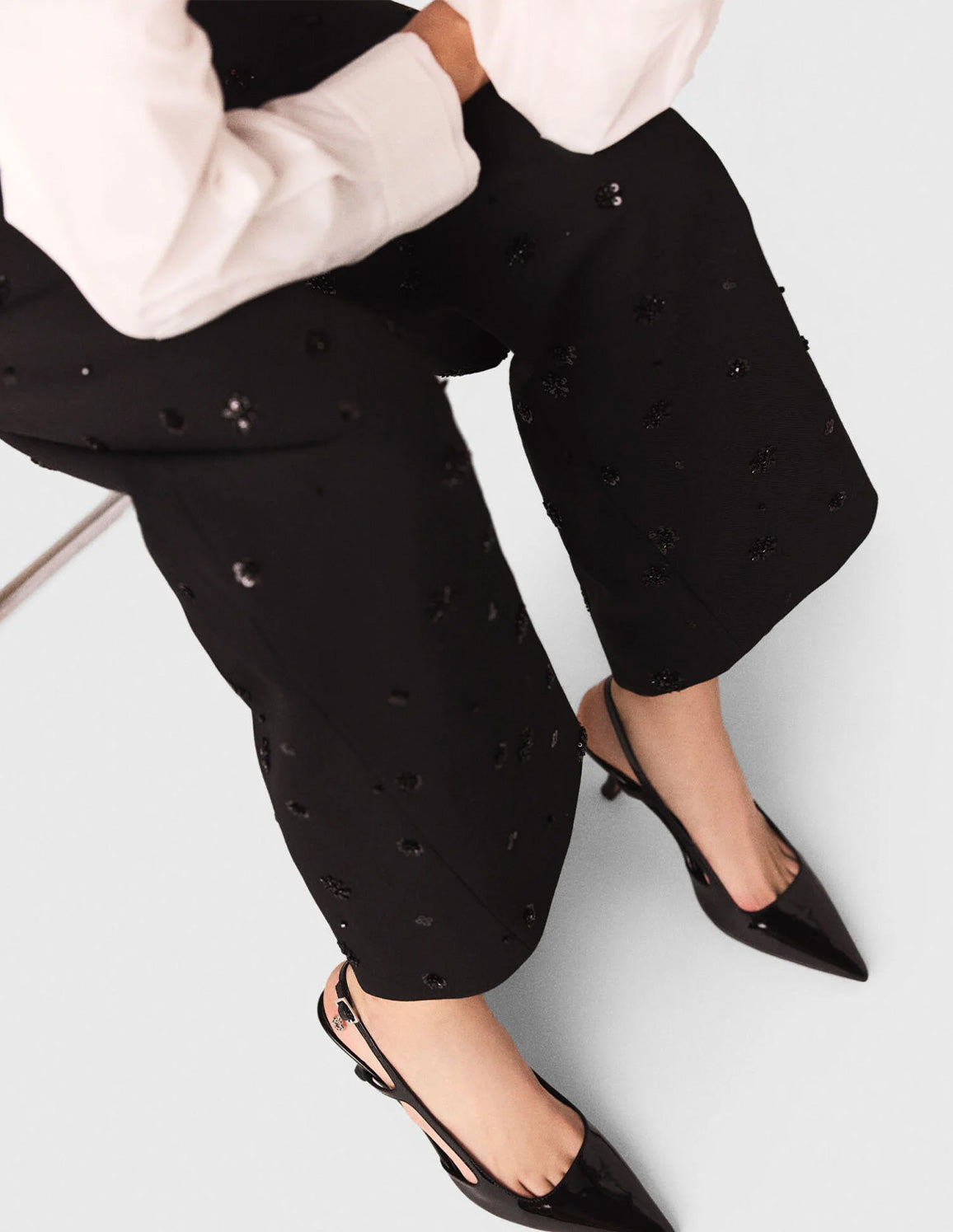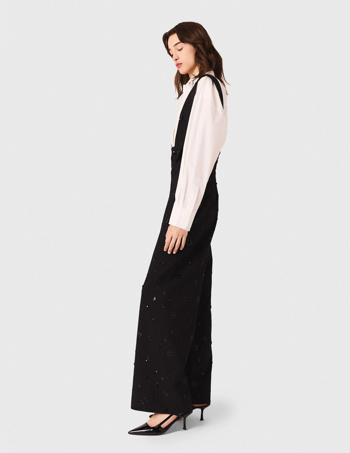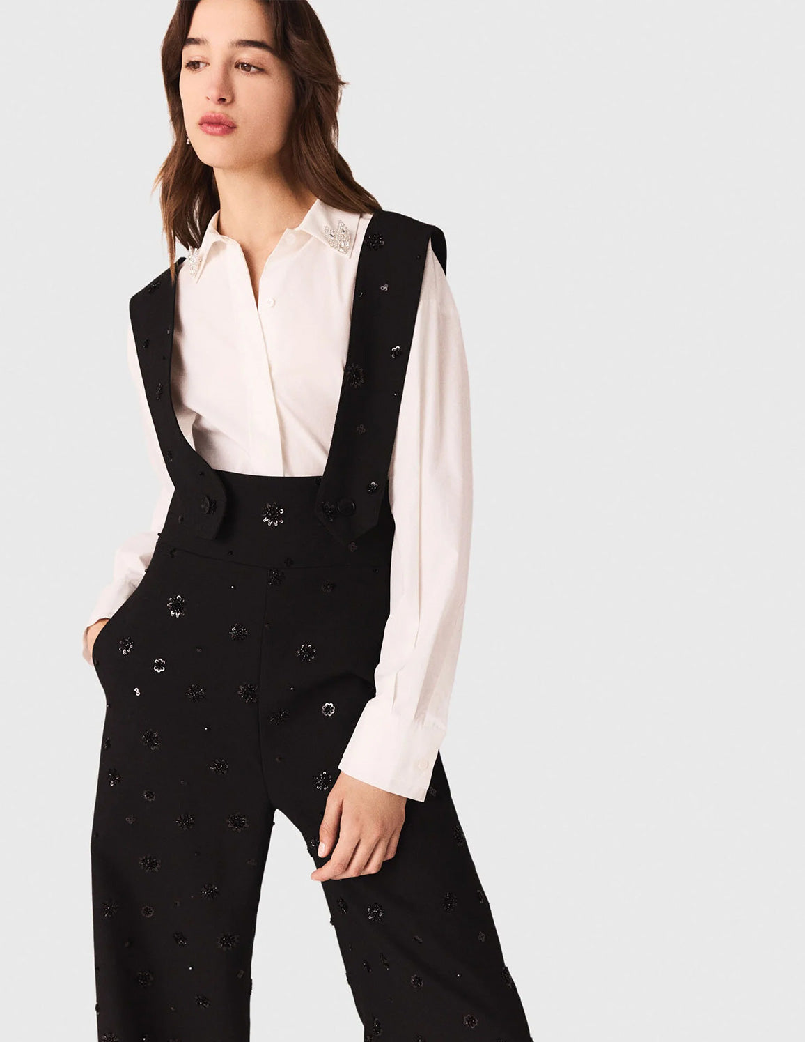 • Designed with an elegant high waist and wide, removable braces, they stand out with their delicate ornamentation of floral pearls and sequins.
