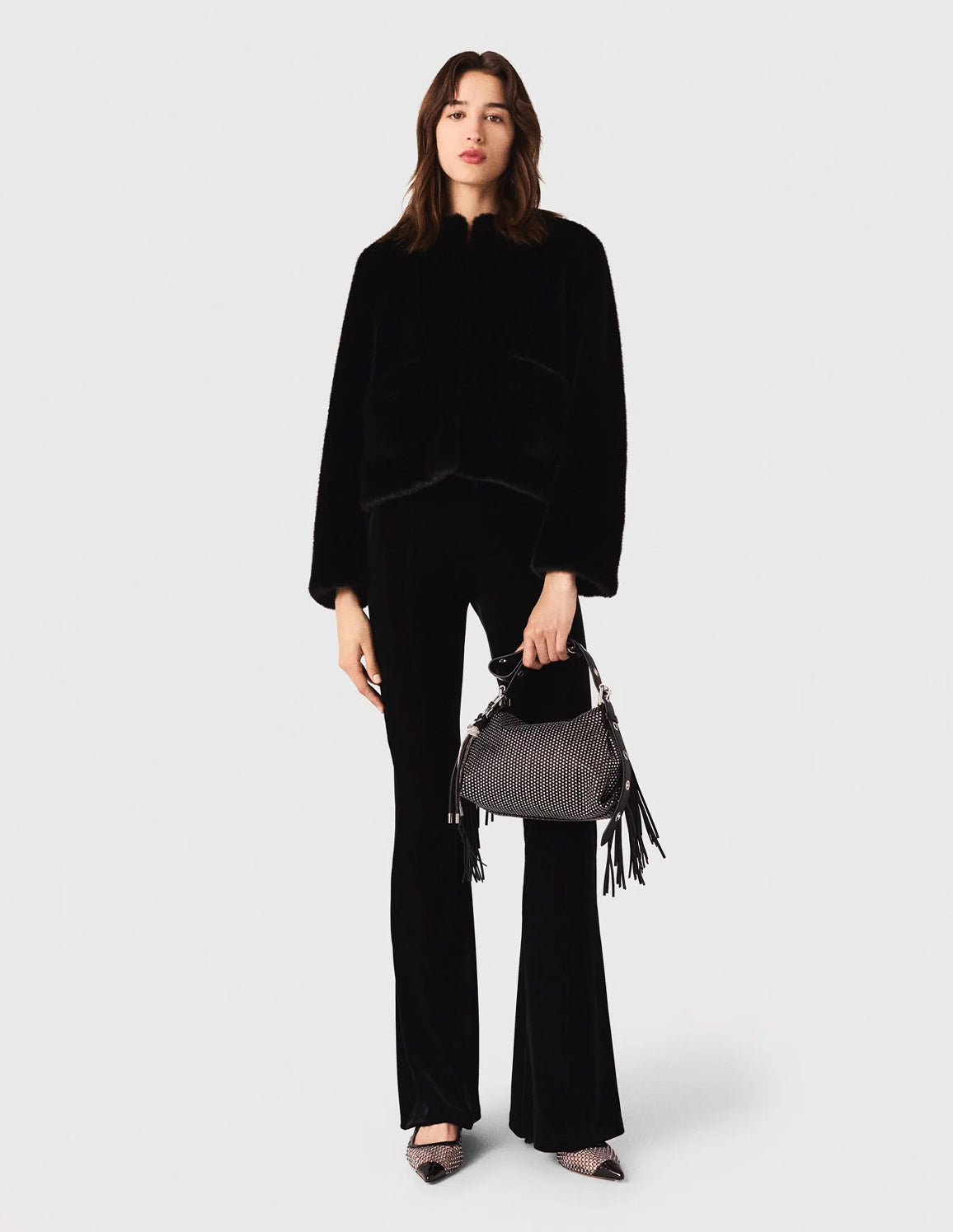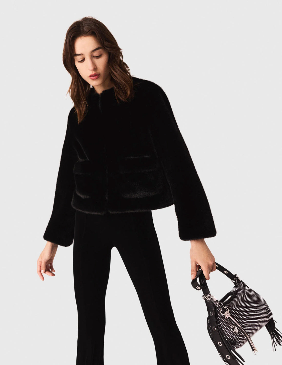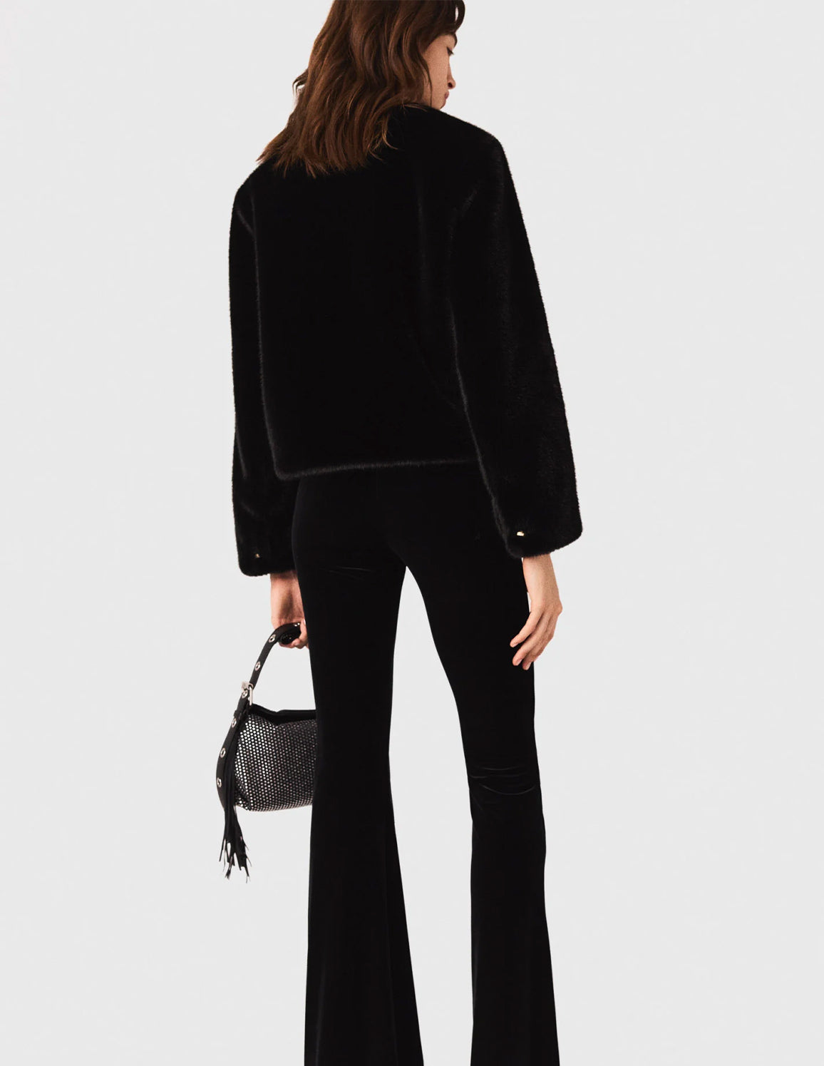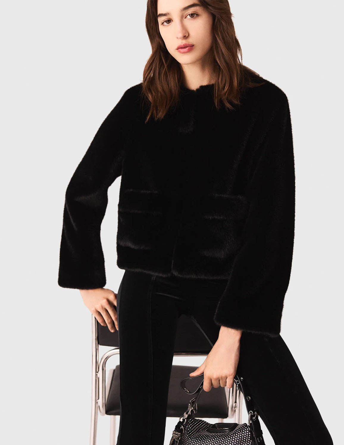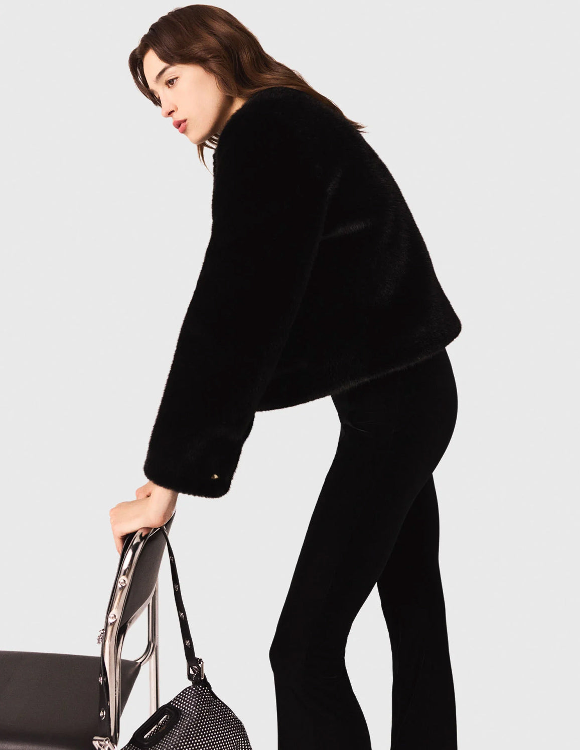• Style with a short faux fur coat, heels and a rhinestone-embellished bag.