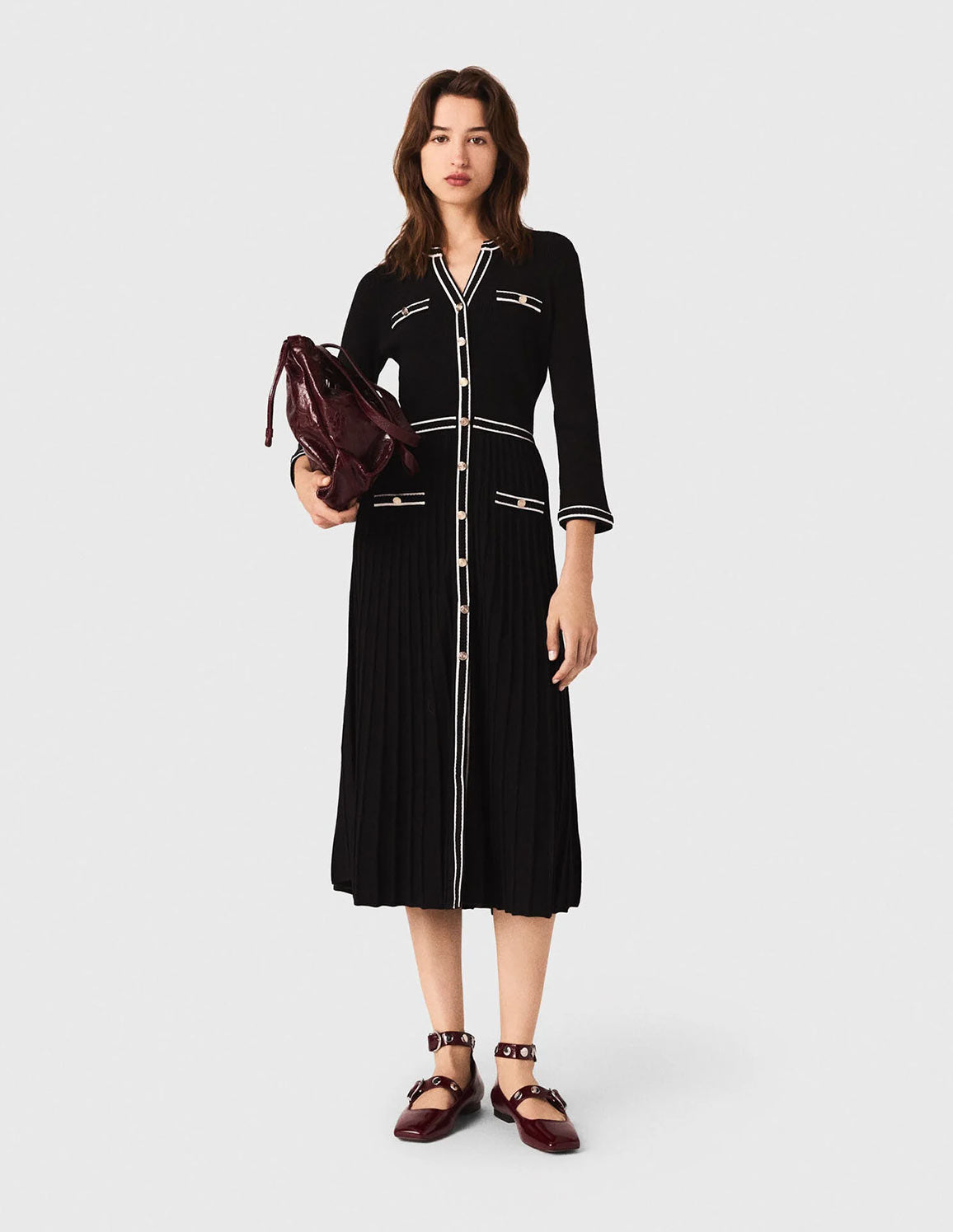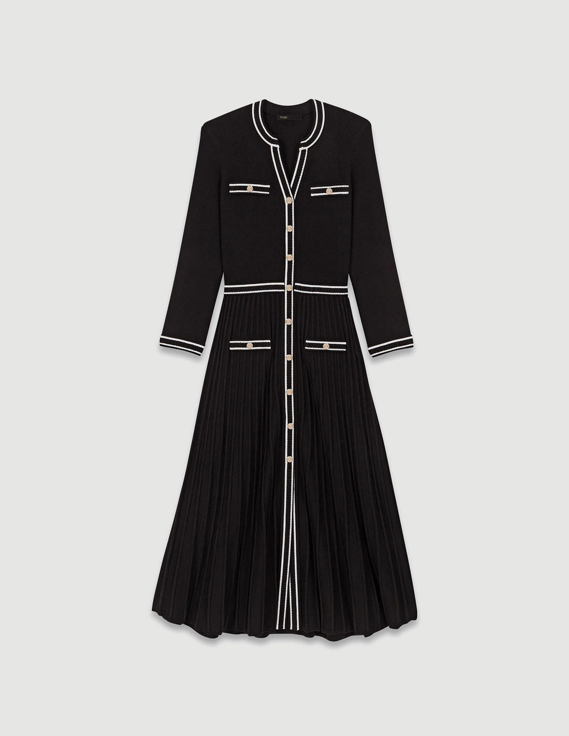 • Sleek and structured, this maxi knit dress has a retro feel with its contrasting trim and a button front inspired by tailoring. The dense pleating of the skirt adds movement, balanced by a fitted top and a V-neckline that elongates the silhouette.Wear with studded ballet flats and a signature handbag.