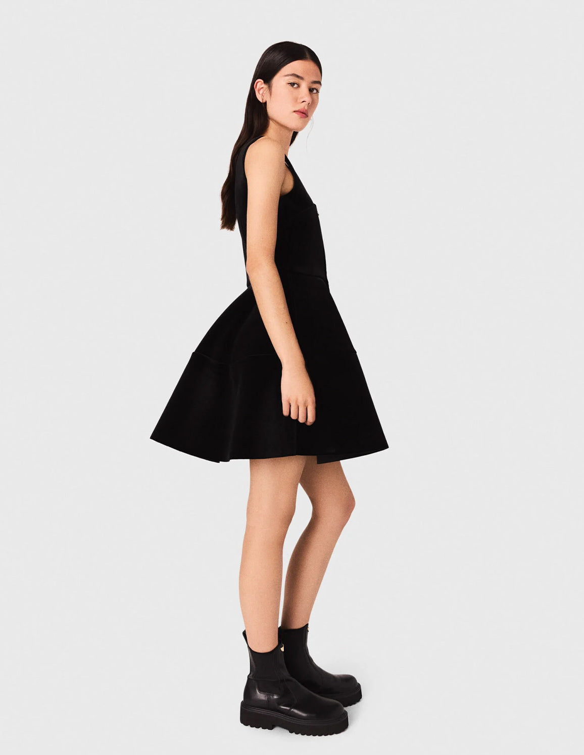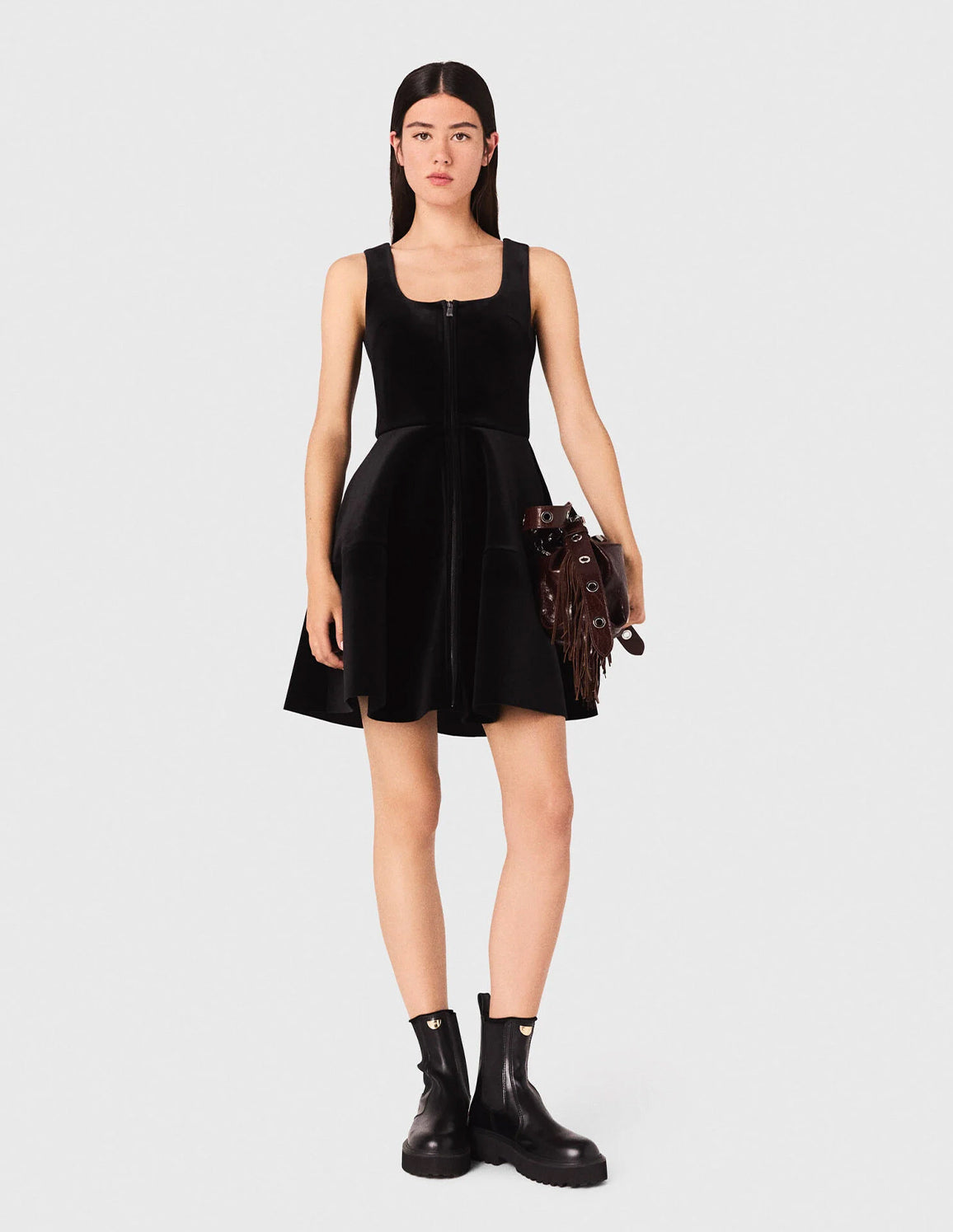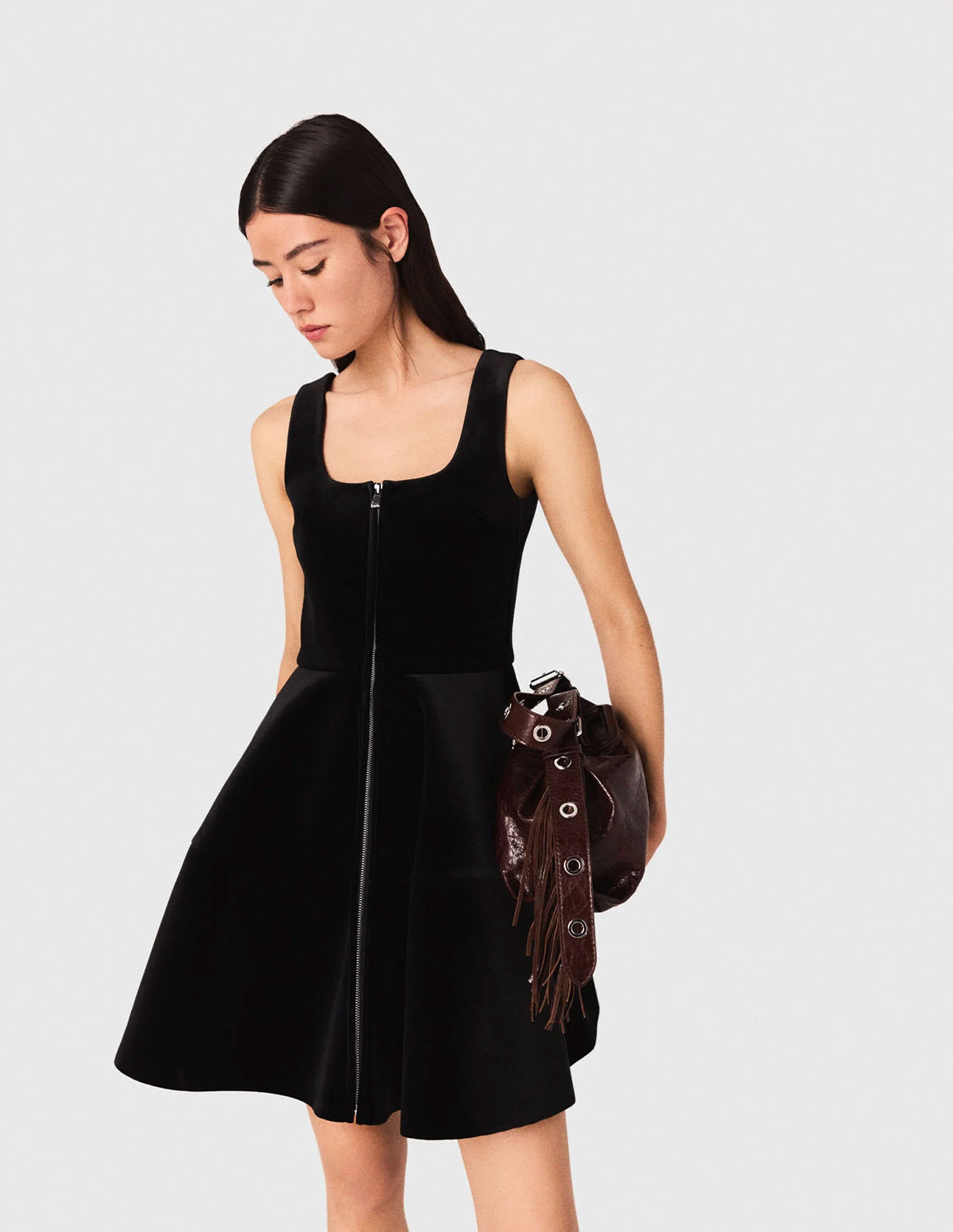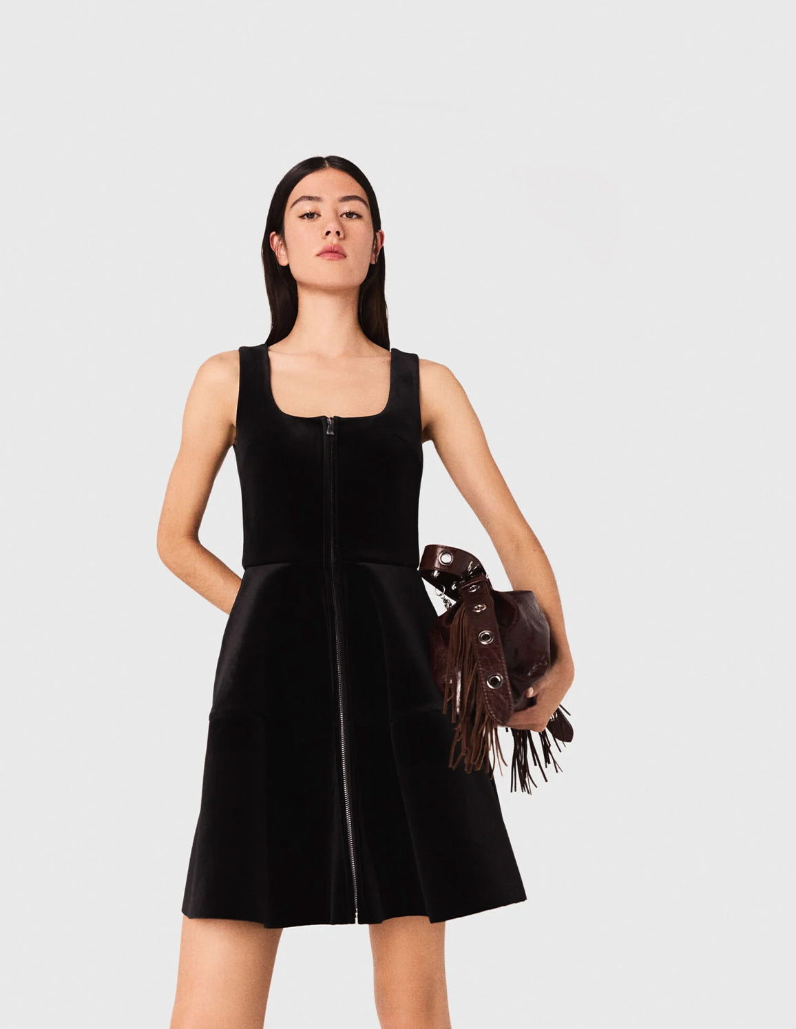 This skater velvet dress combines softness and structure thanks to its luxurious material and flared cut. The square neckline and wide straps add a graphic touch, while the silver front zip highlights the contemporary spirit of the piece. The side pockets add a practical note to this resolutely modern design.