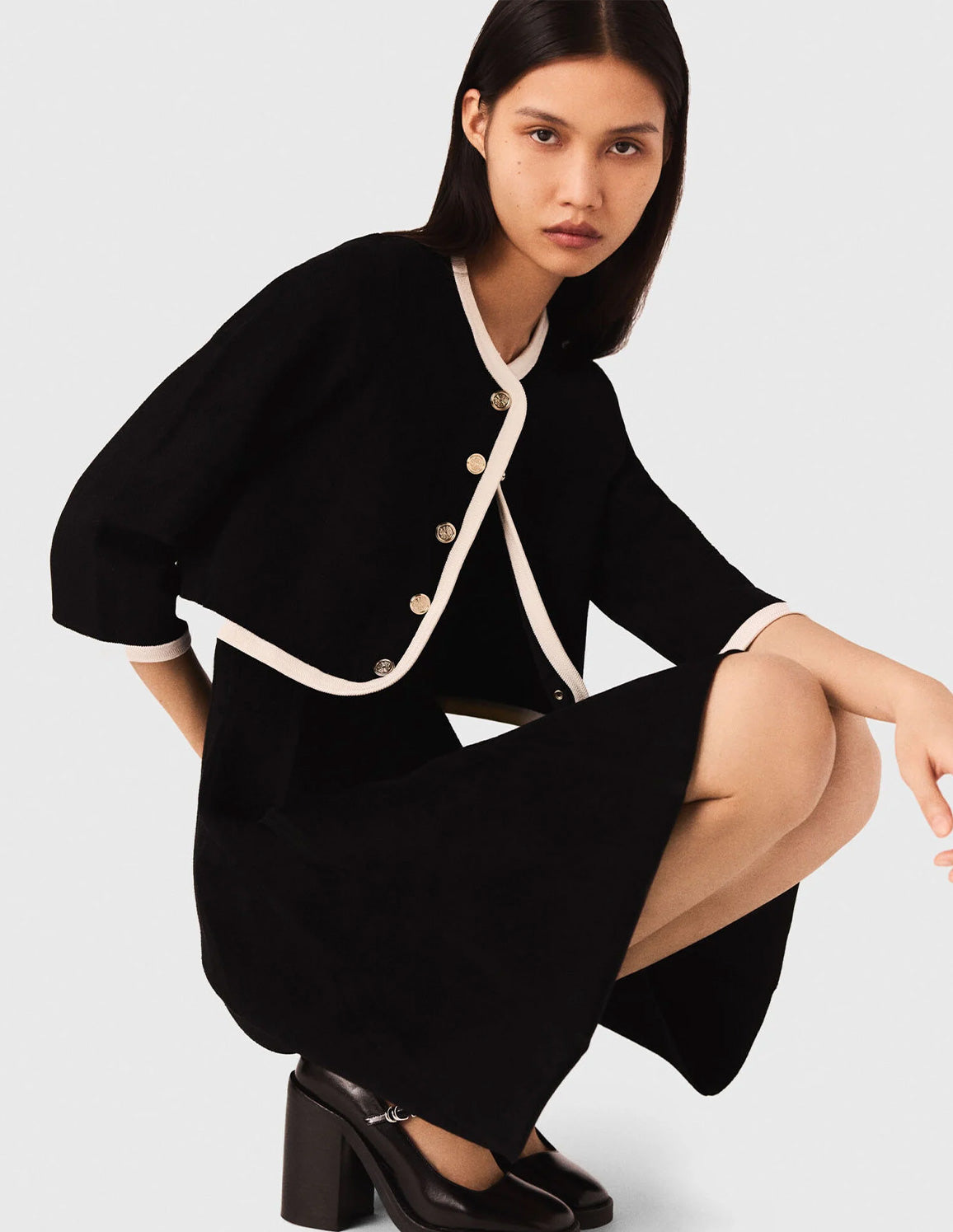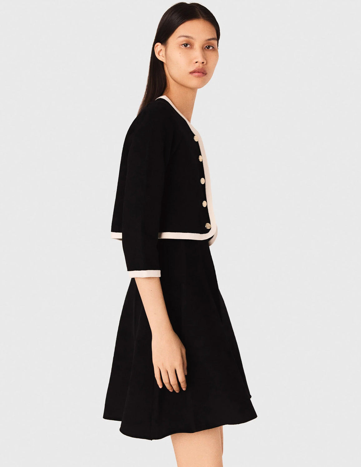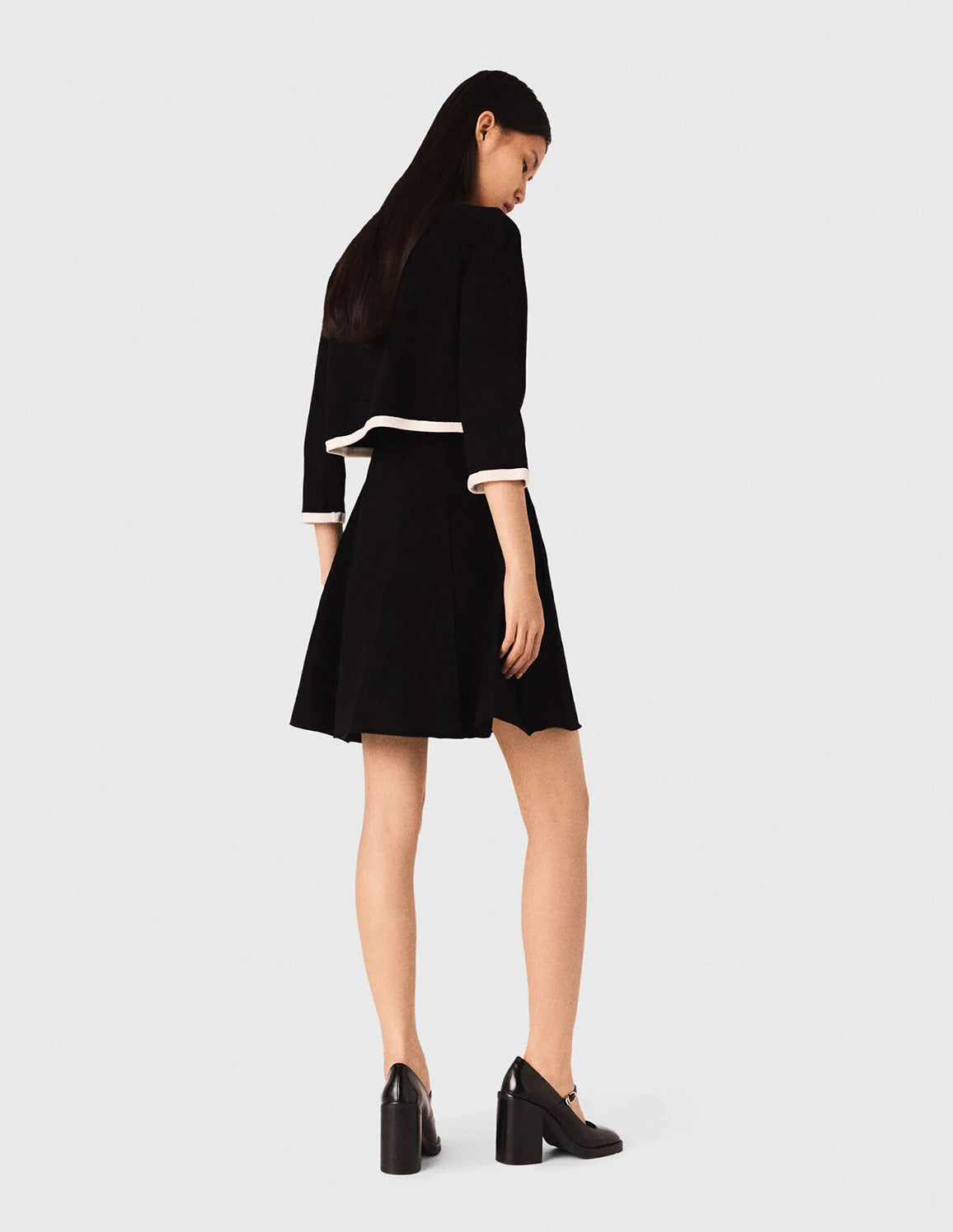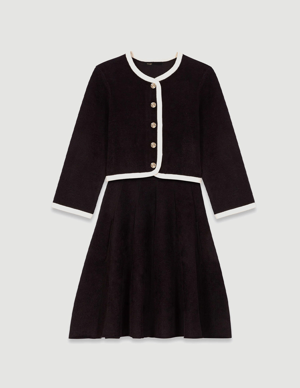 • An interplay of textures and layering for a look designed as a whole. This 2-in-1 dress combines a cardigan with contrasting trim with a dual-material dress, blending stretch knit with a velvet skirt. A new take on a retro look, ready to shake up your everyday style.