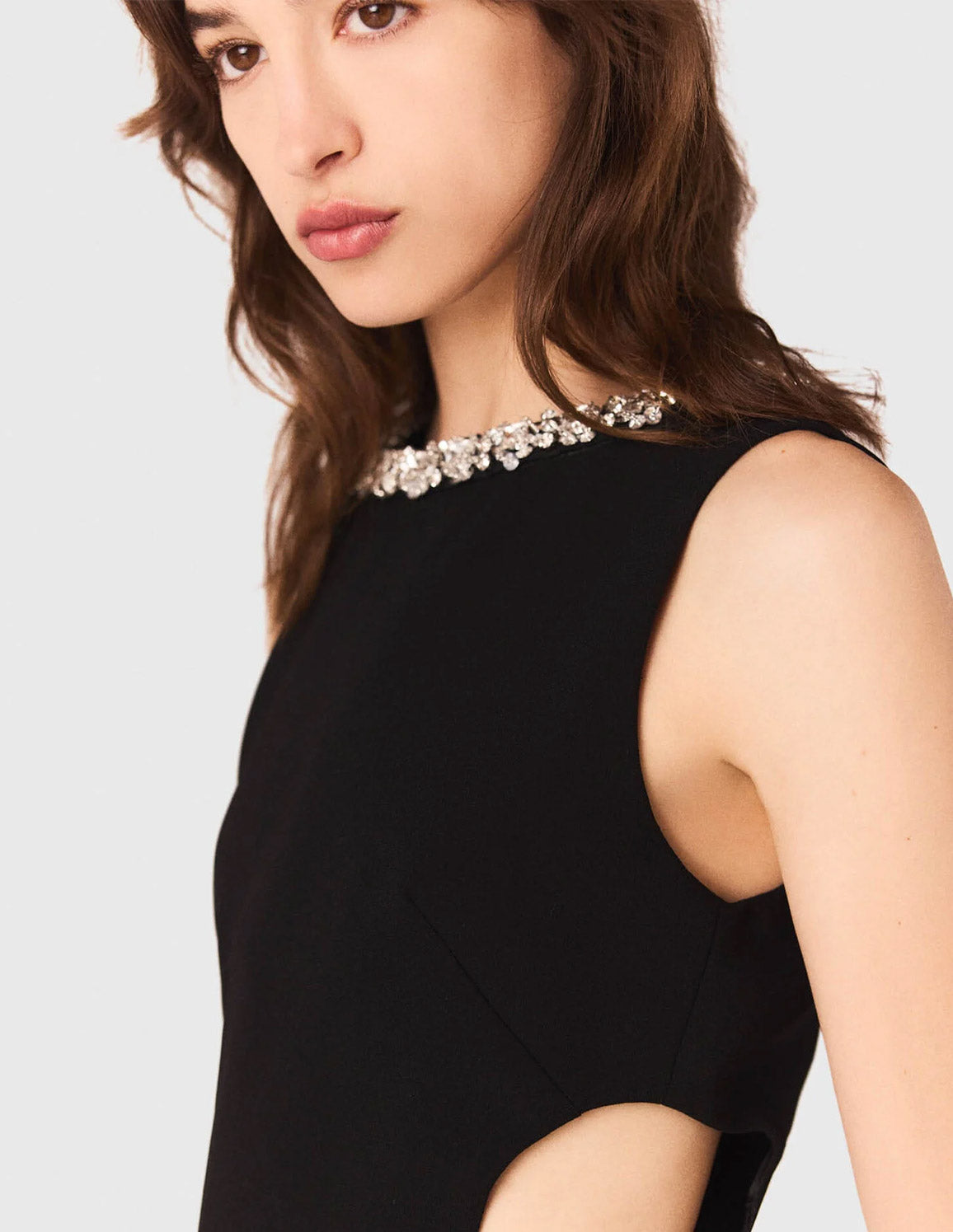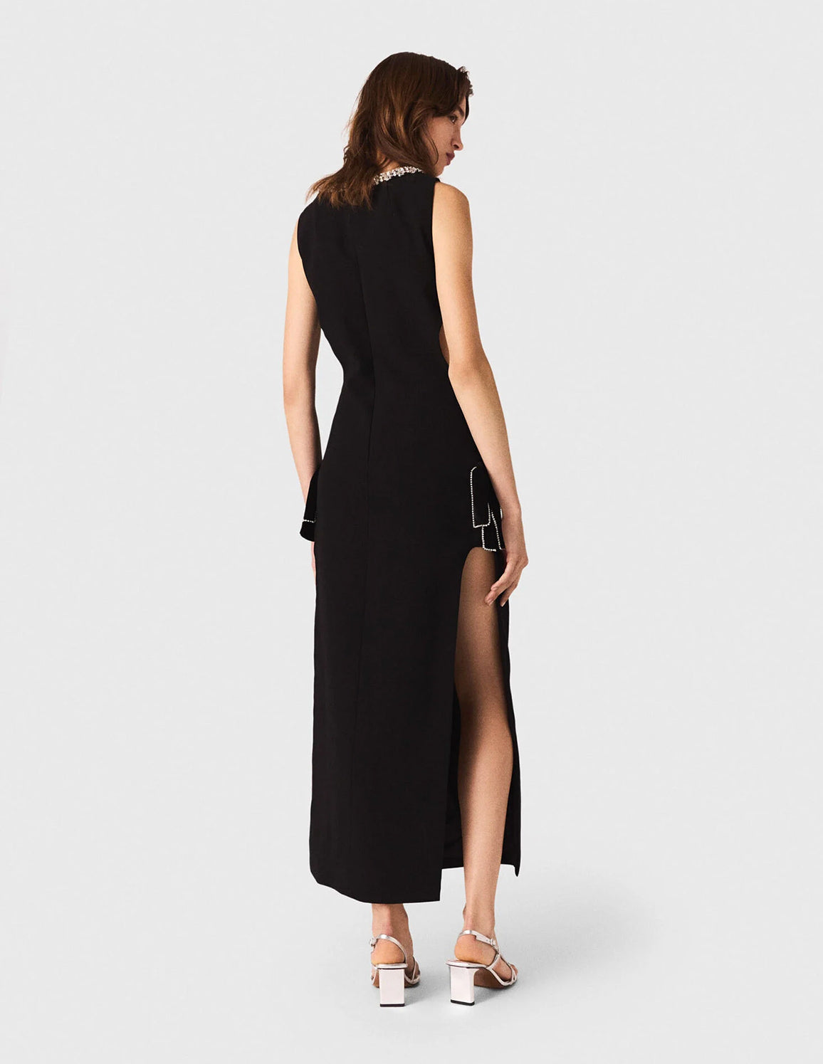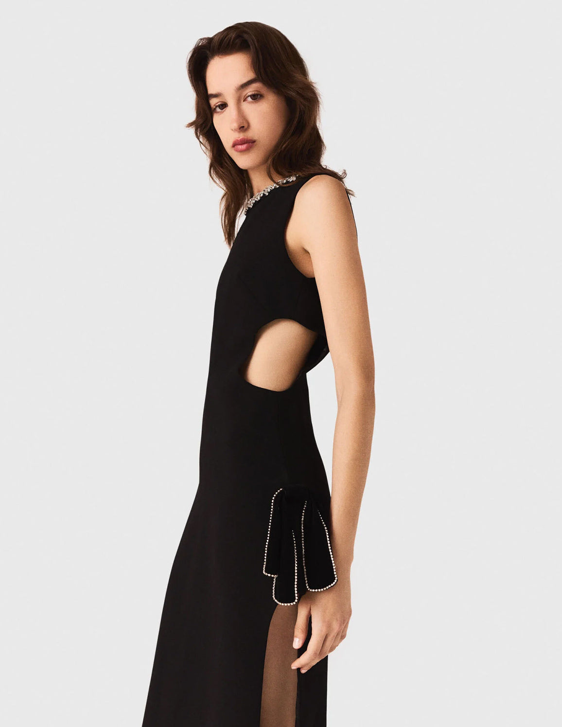 This sleeveless maxi dress has a couture look and a graphic silhouette. Its cut-outs on the sides reveal the waist, while two high slits extend the movement down the legs. Two structured bows adorned with rhinestones accentuate the waist, while the jewelled collar adds a precious touch. The zip fastening at the back ensures a clean line and a fitted style. Pair with heeled pumps for an elegant and contemporary evening look.