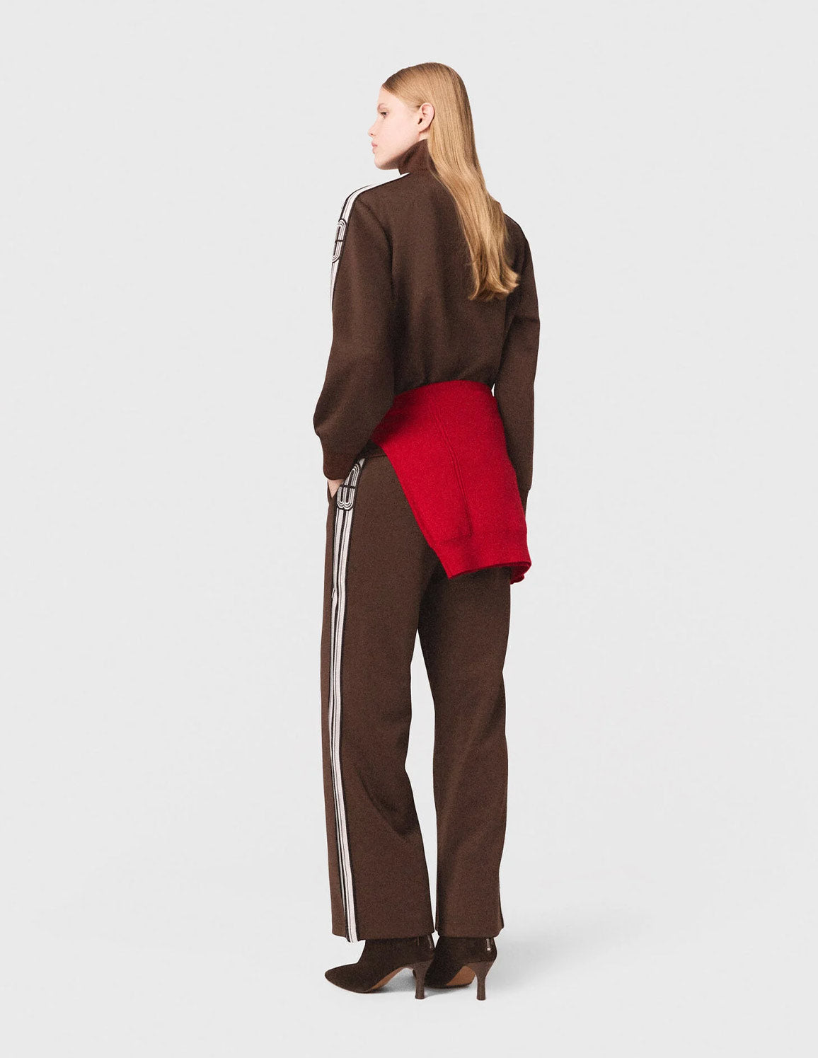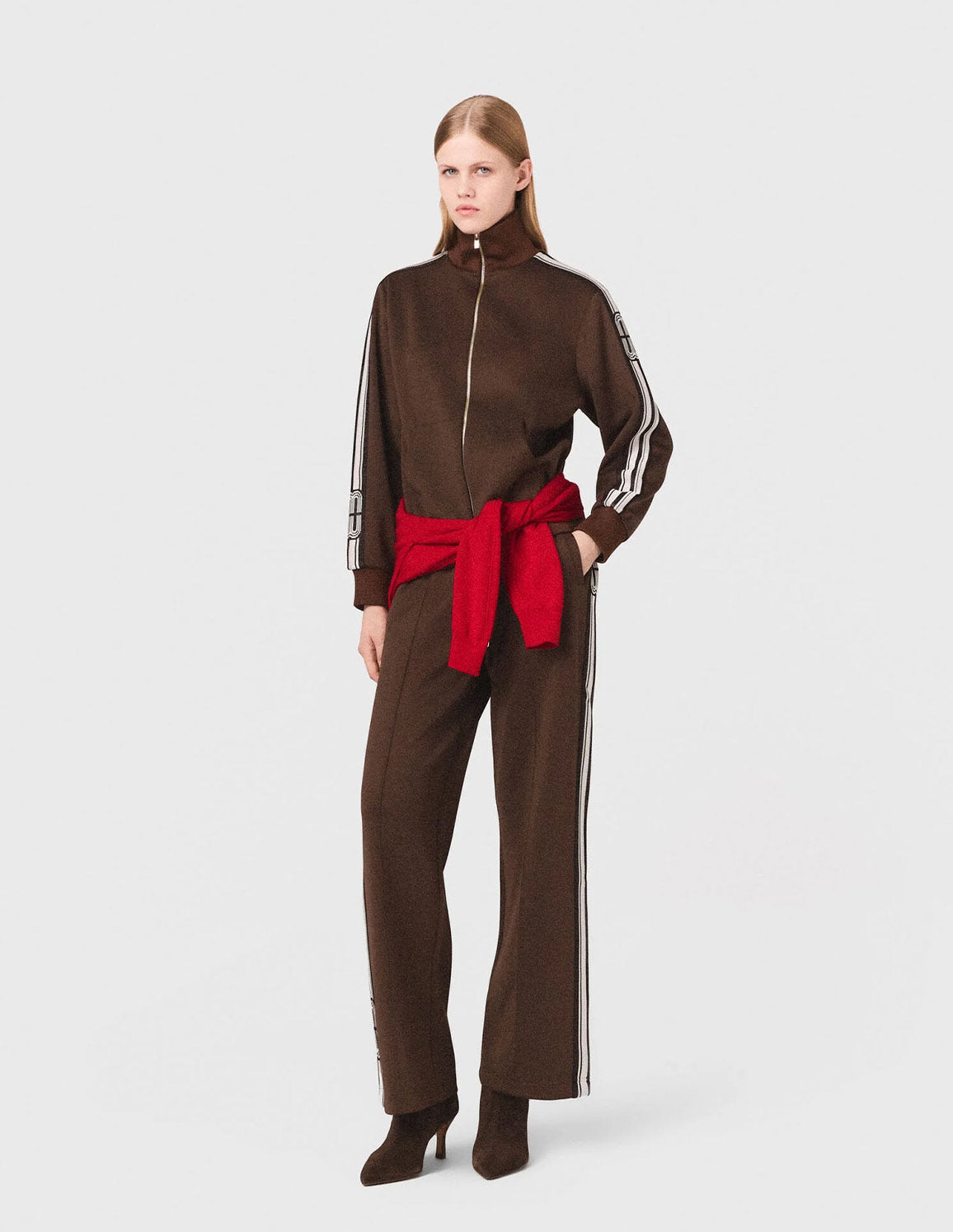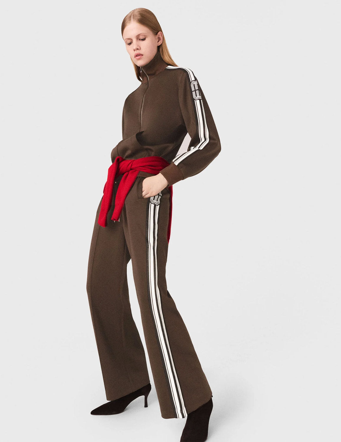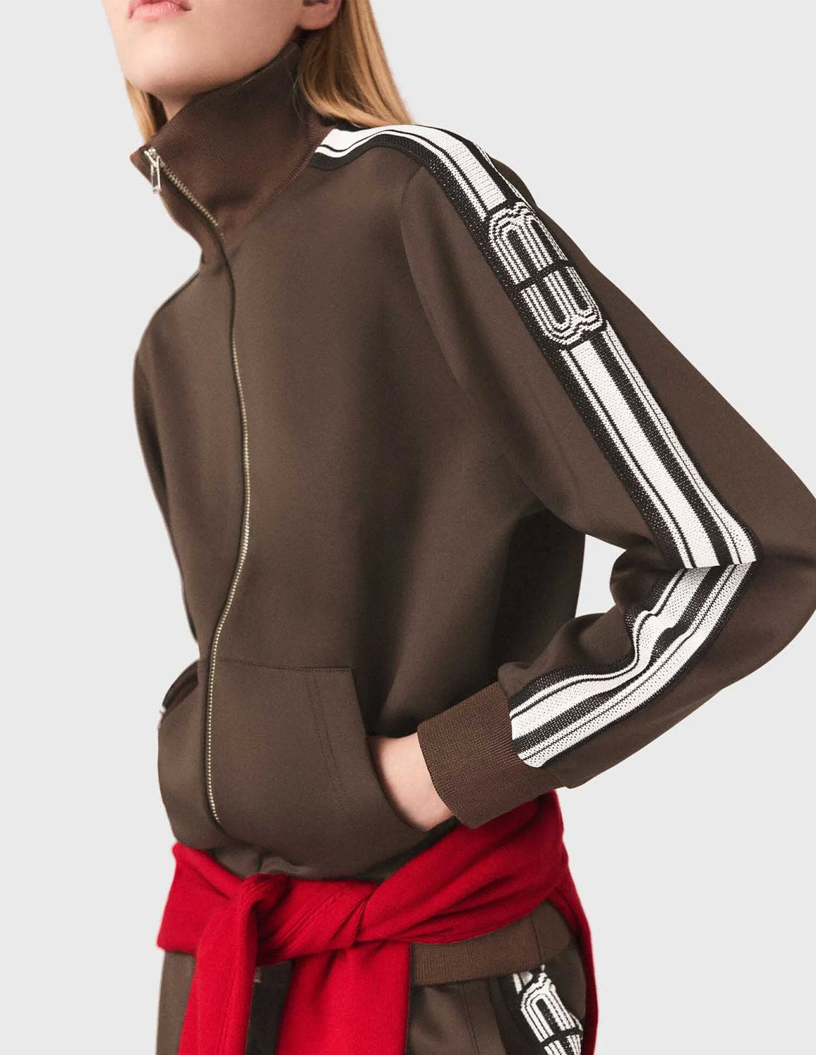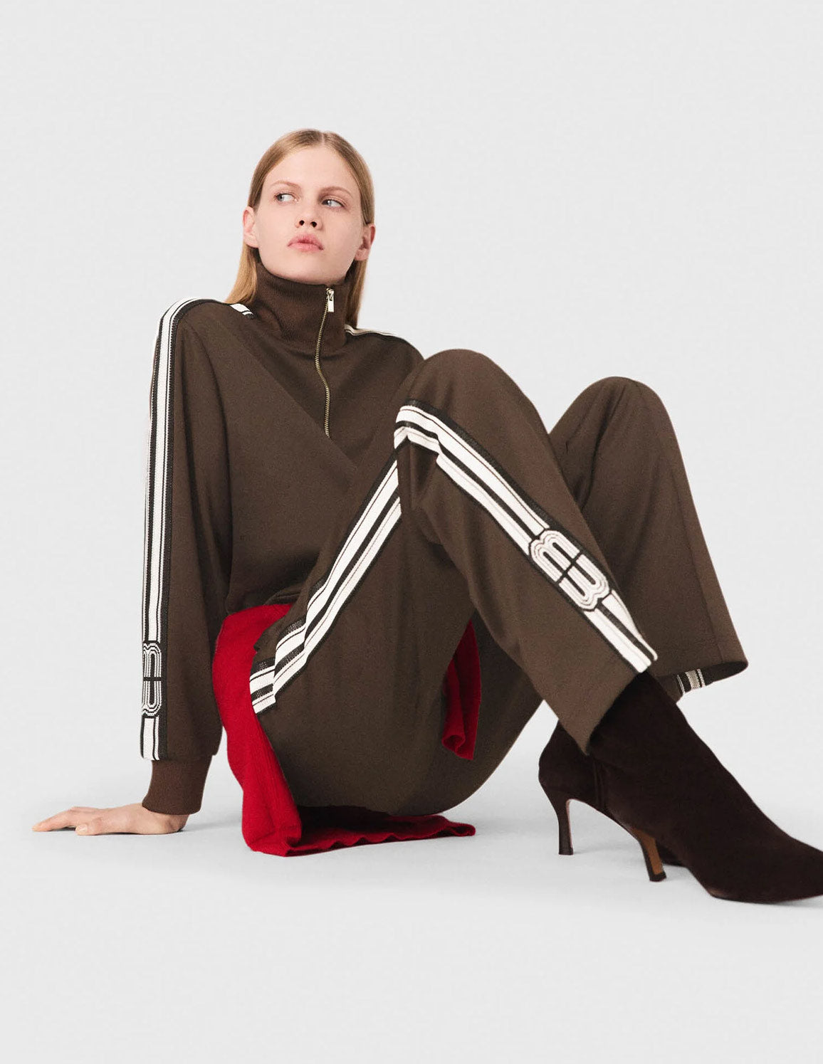 • This long-sleeved zip-up sweatshirt stands out with its contrasting stripes along the sleeves and its high neck, which highlight its sporty inspiration. Practical pockets and a ribbed trim complete the look, combining comfort and style.
