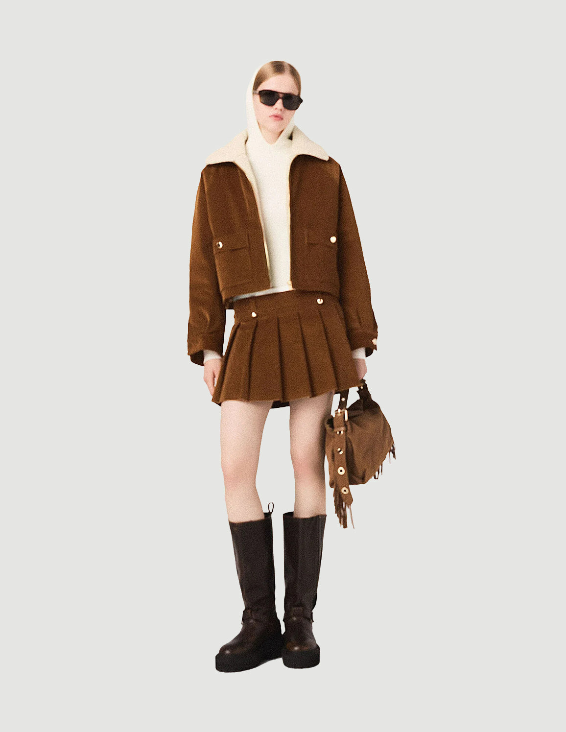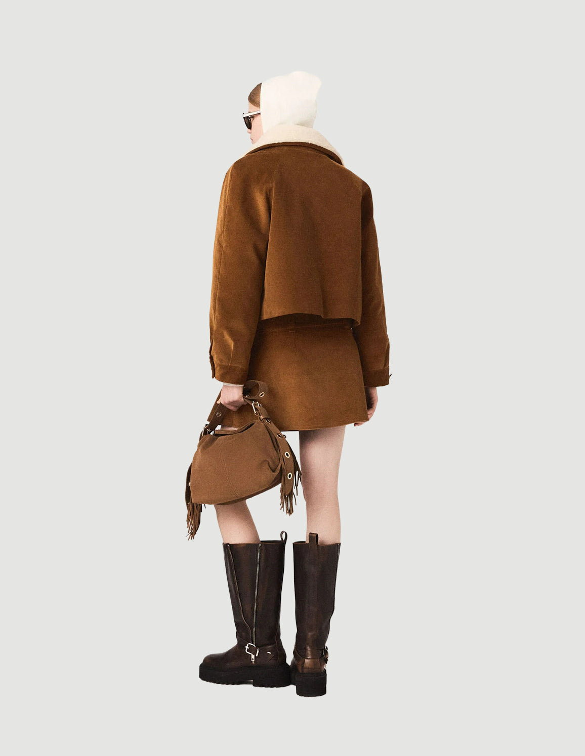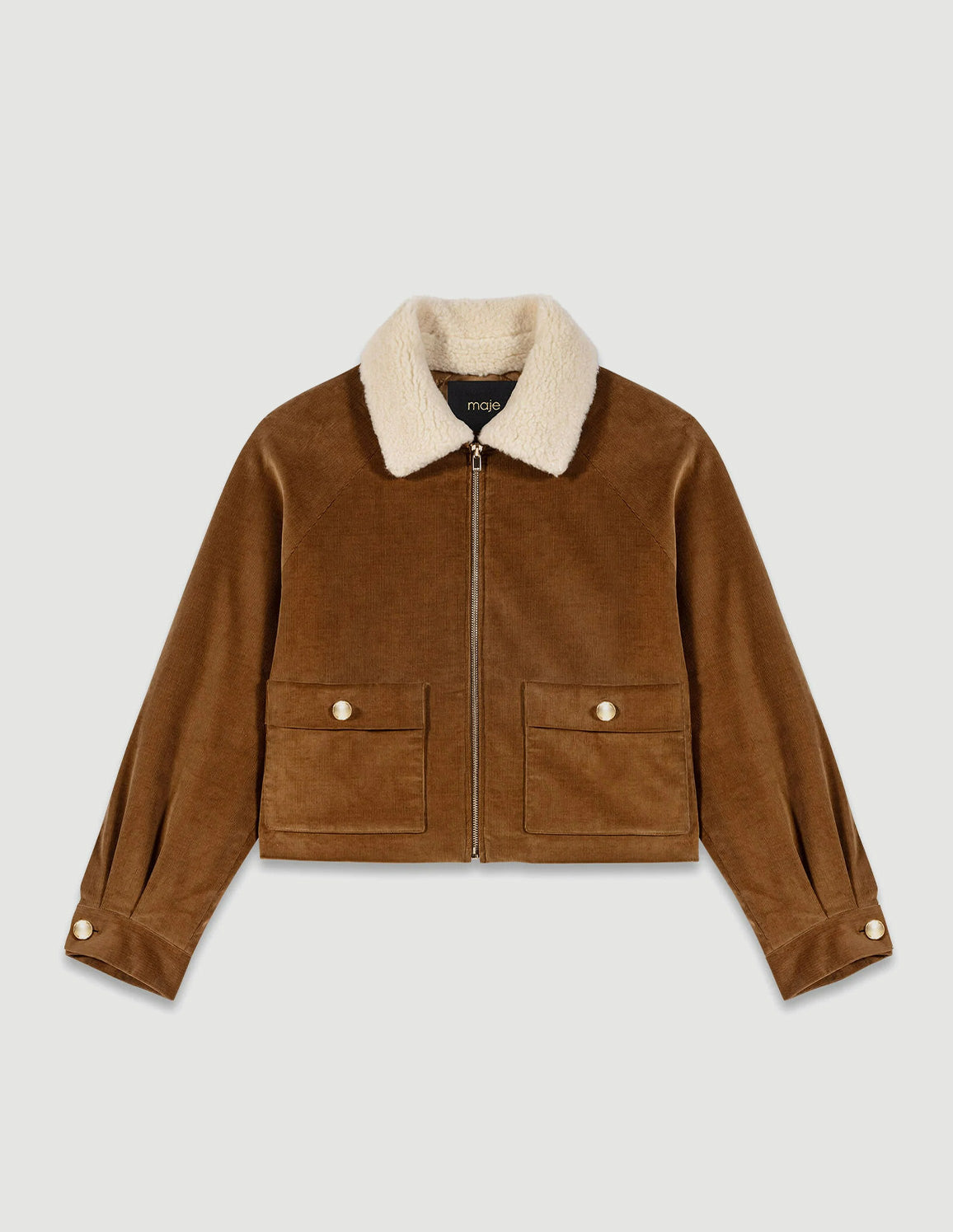• Here, the corduroy reveals all its depth and is warmed by a fur-effect collar, emphasising a cosy feel. The short cut and raglan sleeves provide freedom of movement, while the buttoned pockets and zip fastening create a practical, confident look.