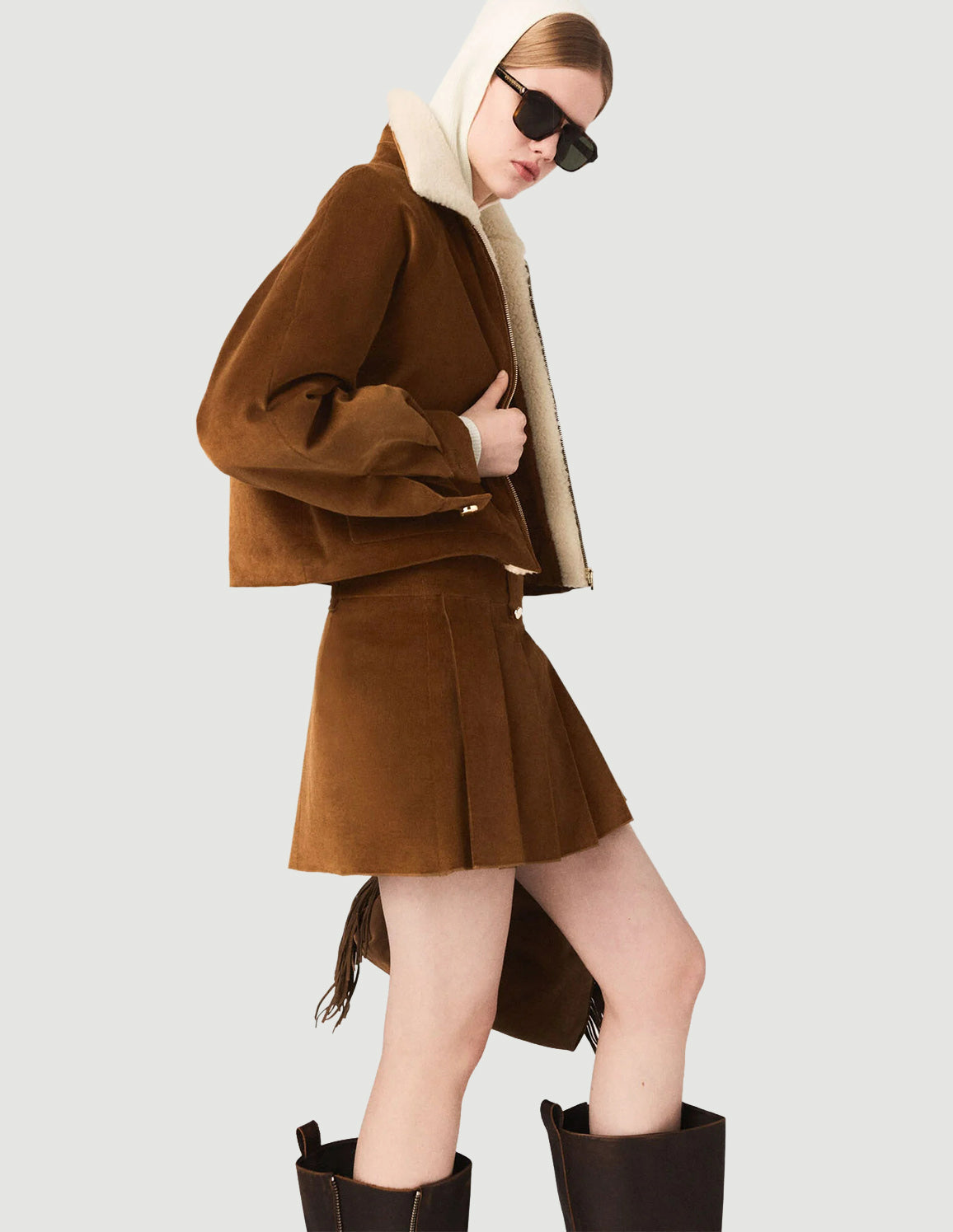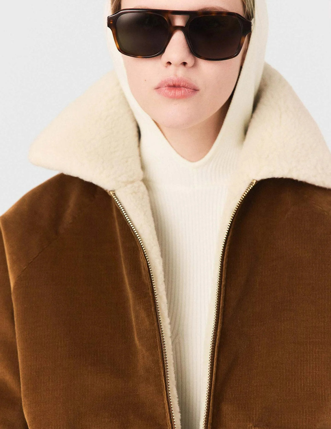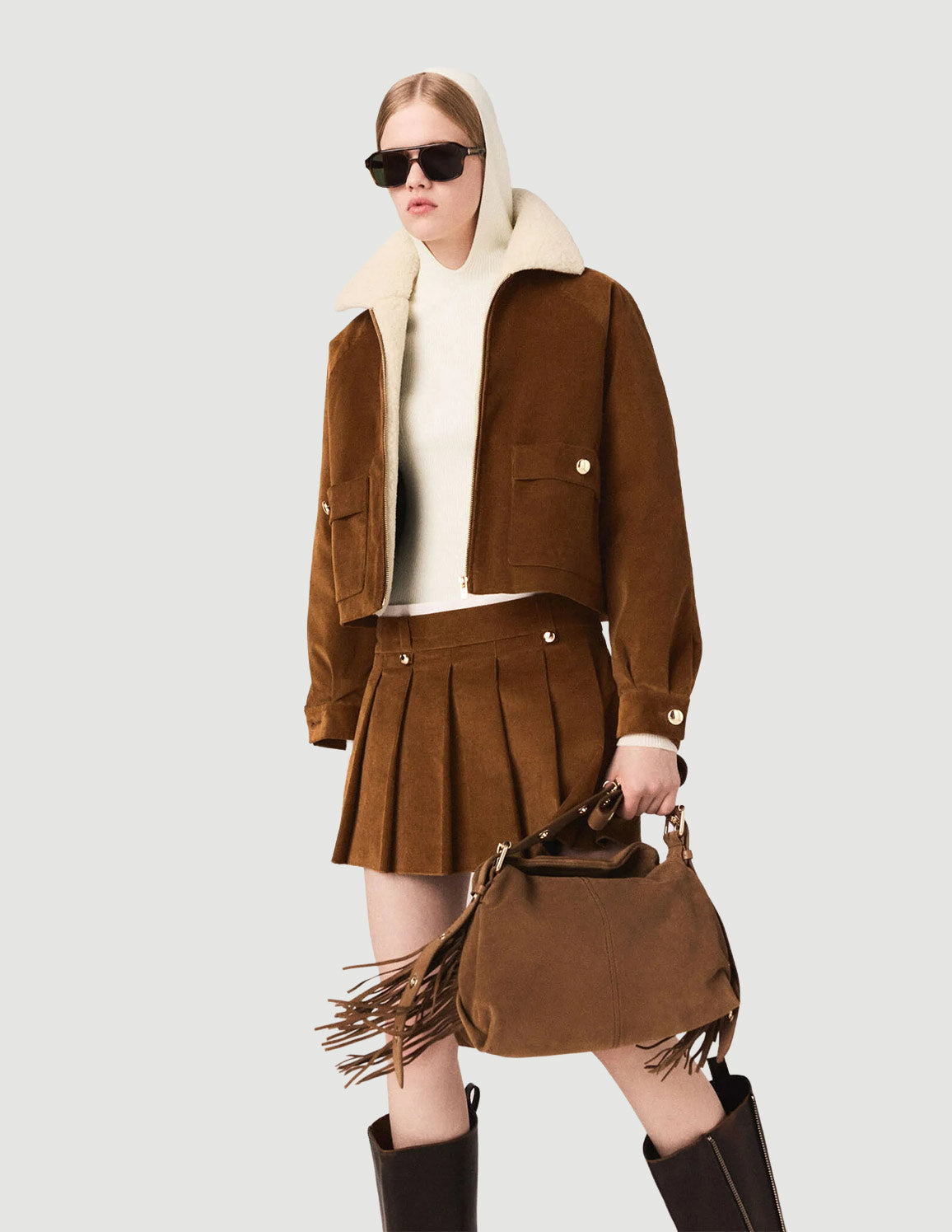 • Here, the corduroy reveals all its depth and is warmed by a fur-effect collar, emphasising a cosy feel. The short cut and raglan sleeves provide freedom of movement, while the buttoned pockets and zip fastening create a practical, confident look.