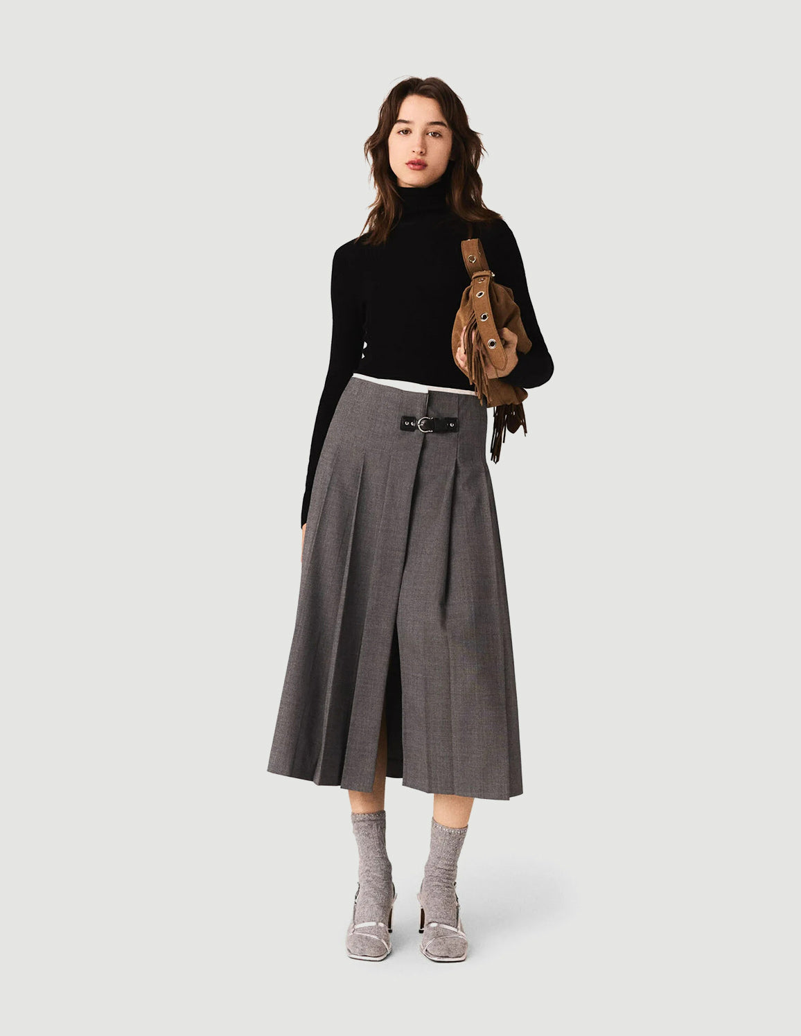 • Structured volume, tailoring details and elaborate finishes: this season, Maje is stylishly reinventing the wardrobe. This long wool skirt subtly plays on layering, and is the key piece in the collection.