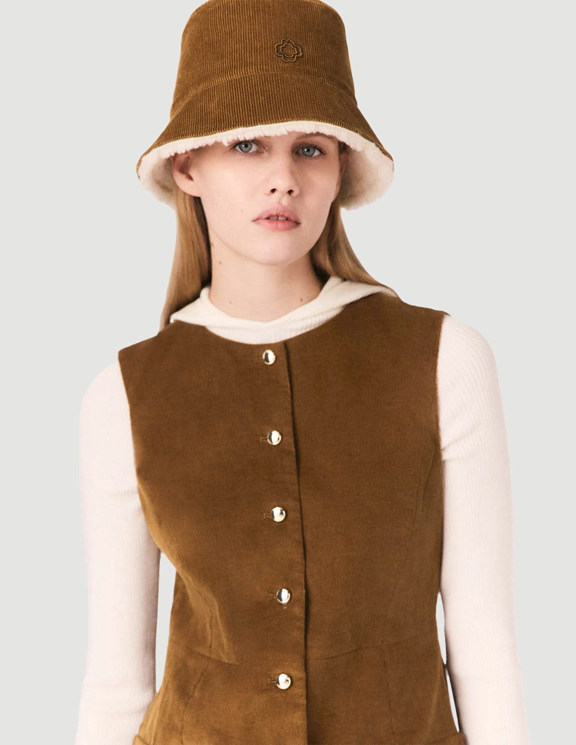 • This short corduroy dress has a captivating retro yet contemporary feel. Featuring a button fastening at the front, two side pockets and a sleeveless cut, it's an easy piece to style however you want. Wear it with a fine-knit hooded bodysuit, a velvet bucket hat, leather boots and a suede M bag for a structured, urban look.
