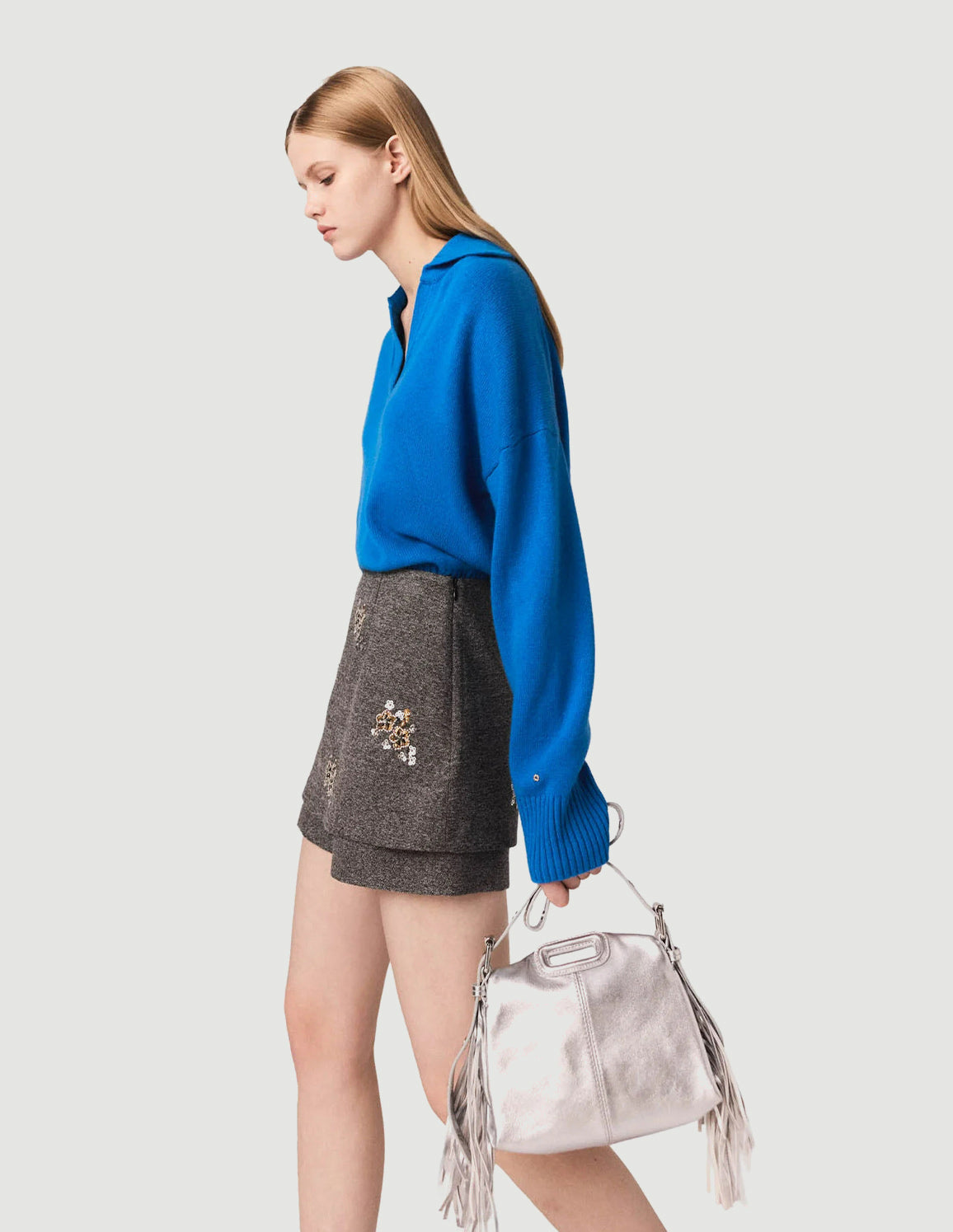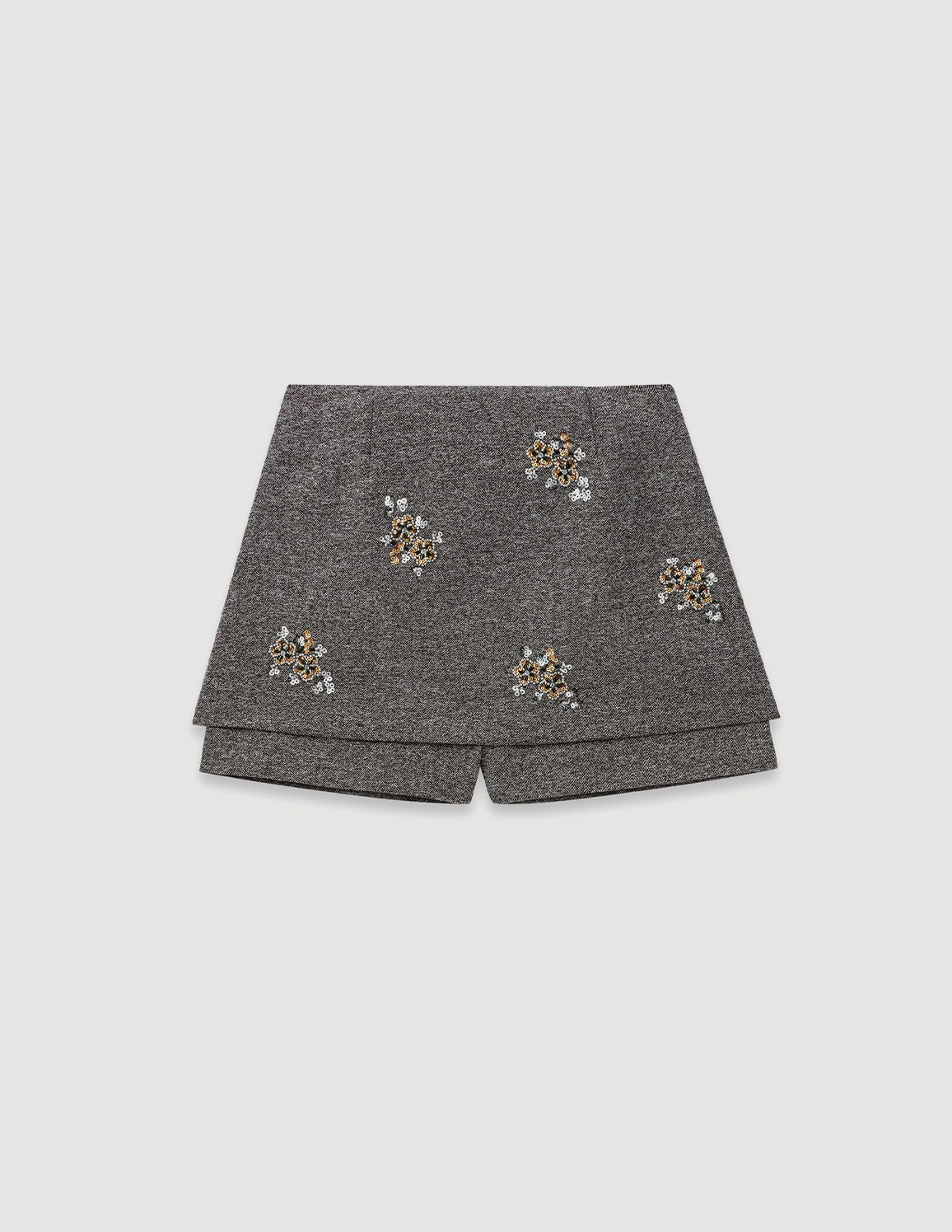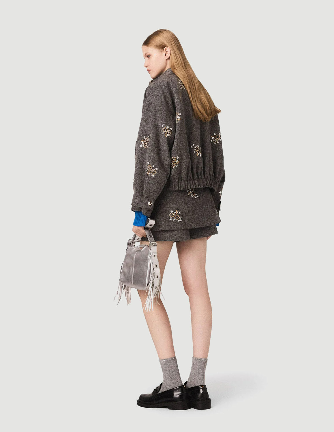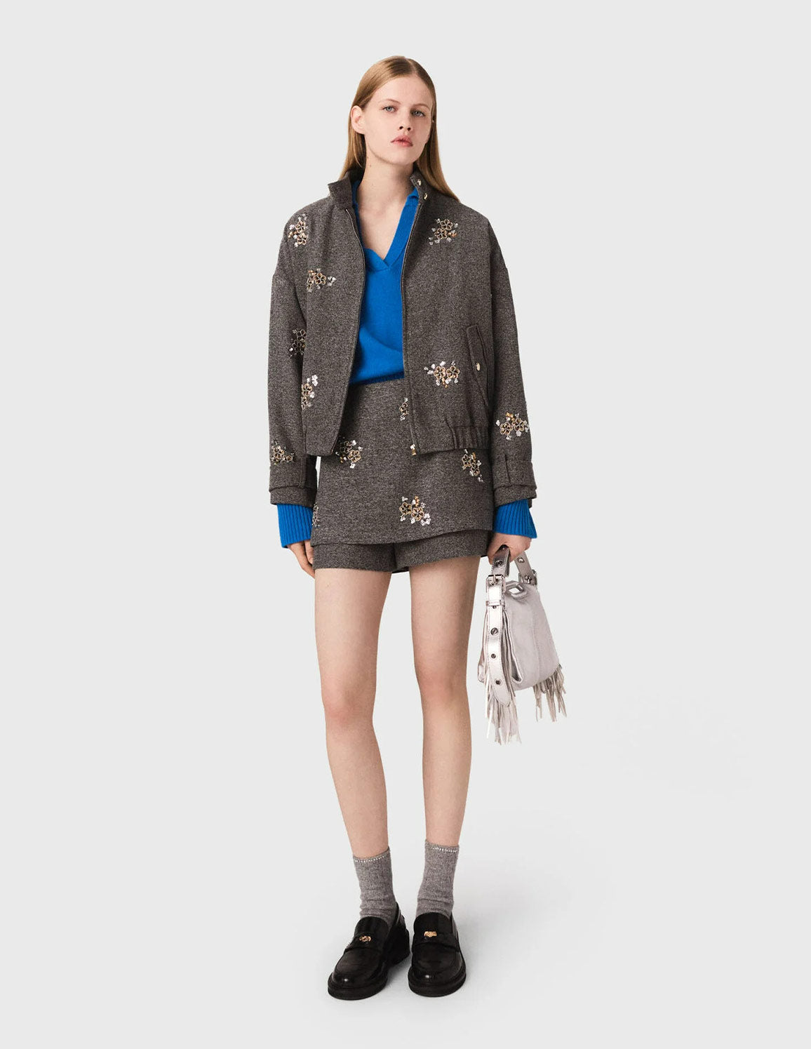 • Inspired by reinvented tailoring, these herringbone shorts play on contrasts of texture and light. Their graphic cut is enhanced with sequin-embroidered patches, crafted in the Maje workshops for a subtle and refined effect.