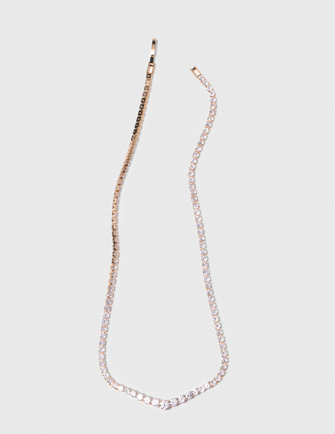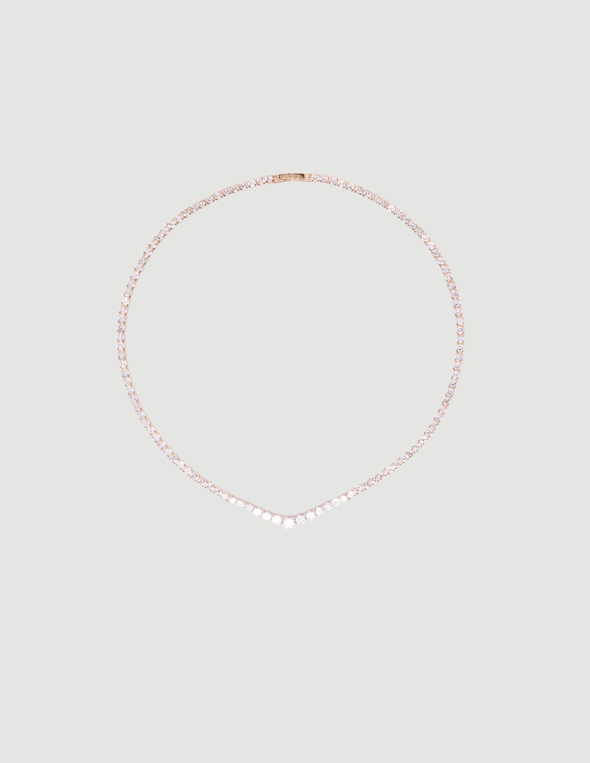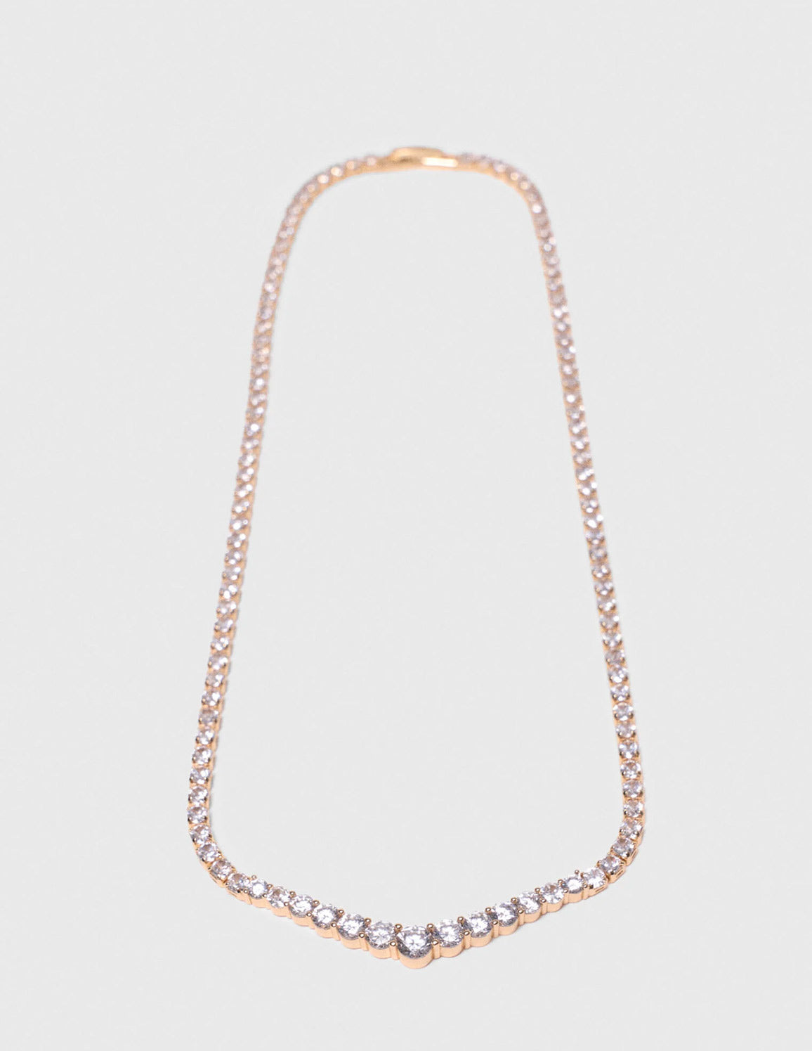 • This cascading rhinestone necklace shines with graphic elegance. A flexible row of faceted crystal-style stones, set on fine gold-plated brass, drapes in a V-shape at the hollow of the neck, creating a bright, feminine line.