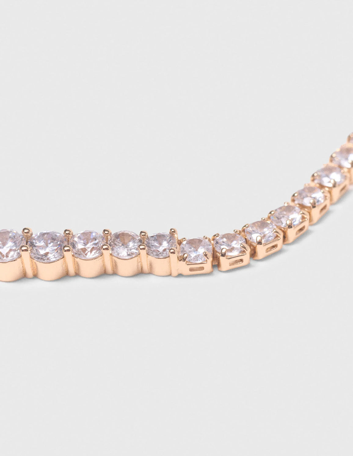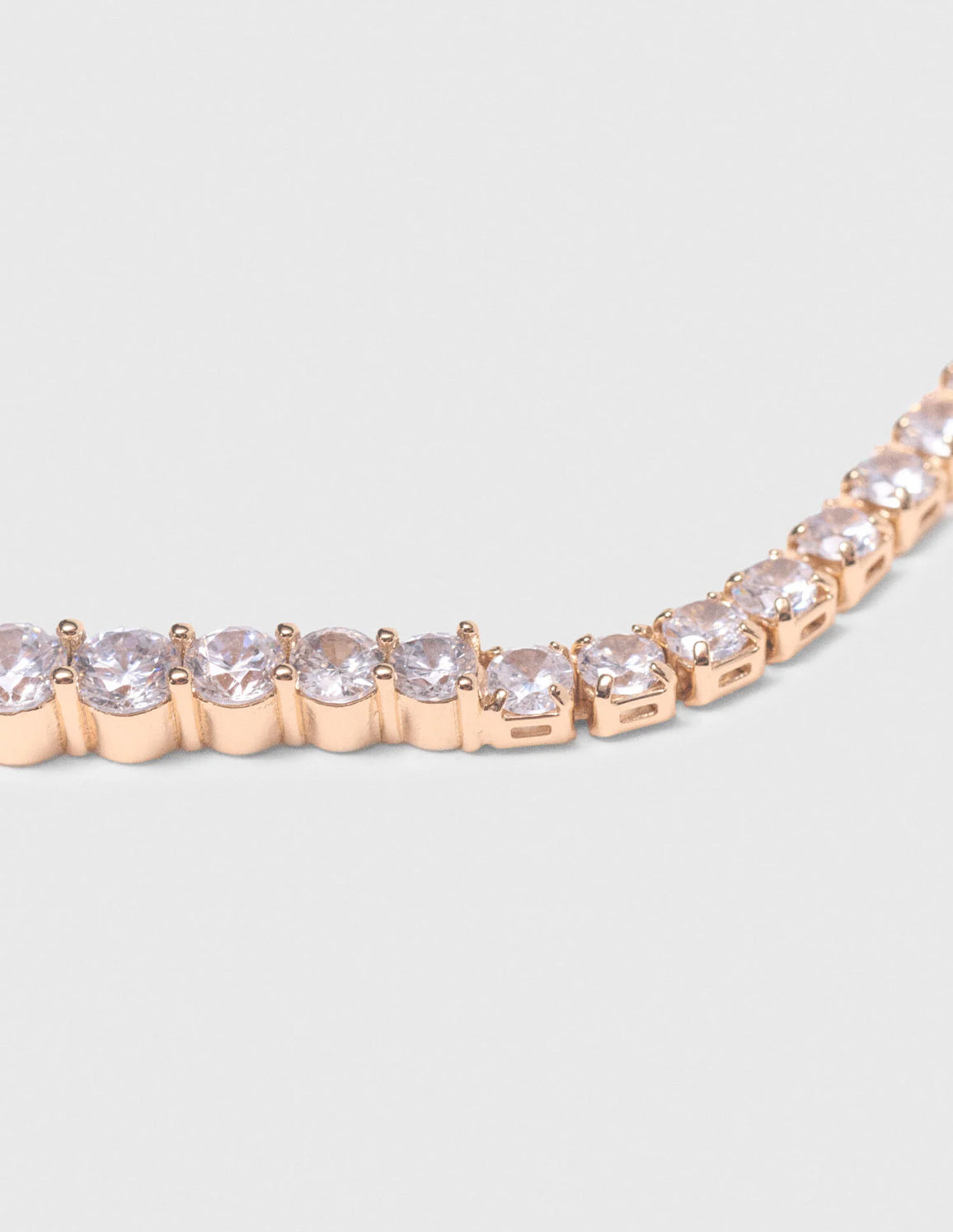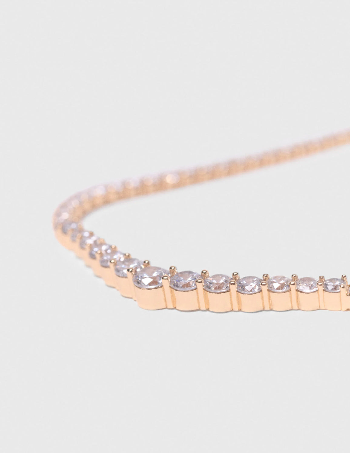 • This cascading rhinestone necklace shines with graphic elegance. A flexible row of faceted crystal-style stones, set on fine gold-plated brass, drapes in a V-shape at the hollow of the neck, creating a bright, feminine line.