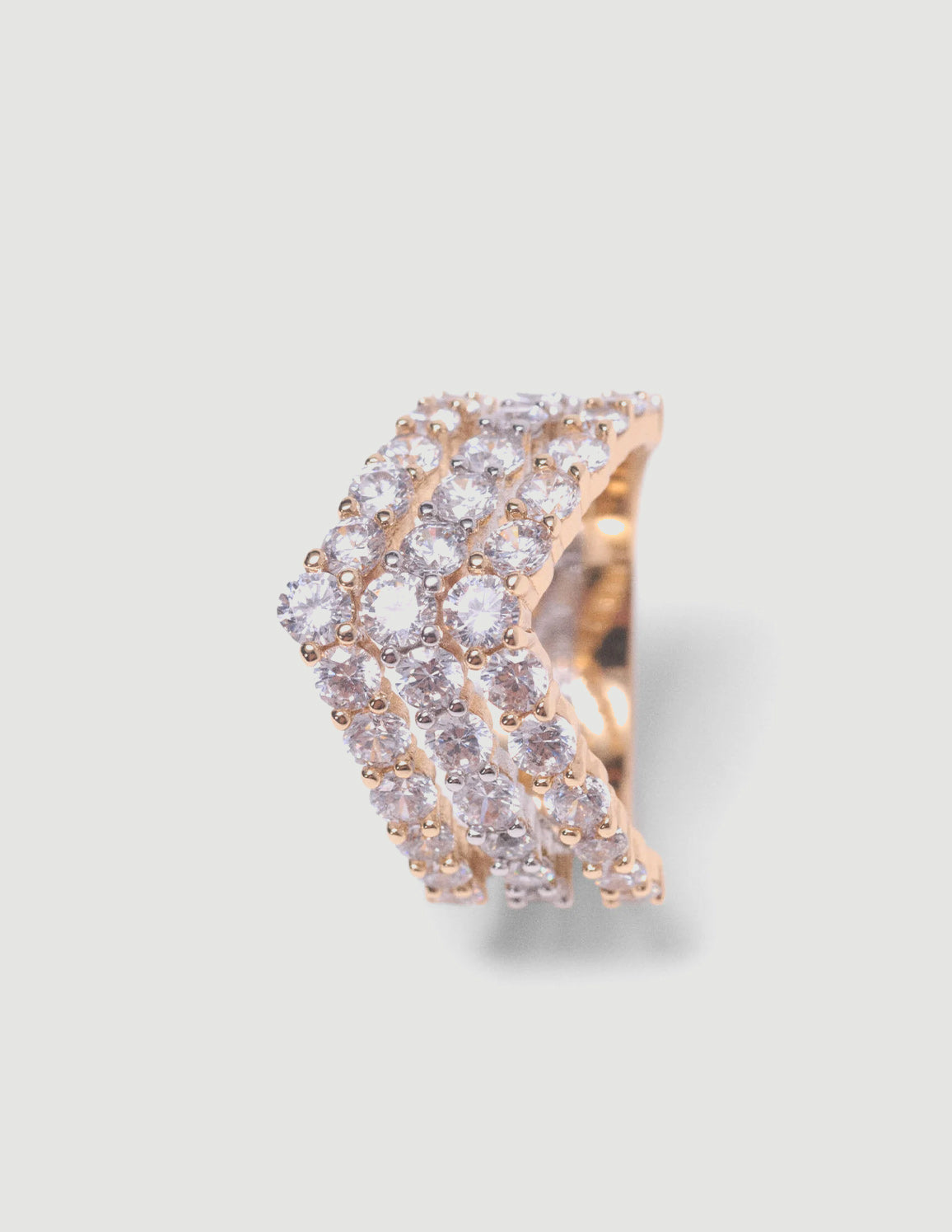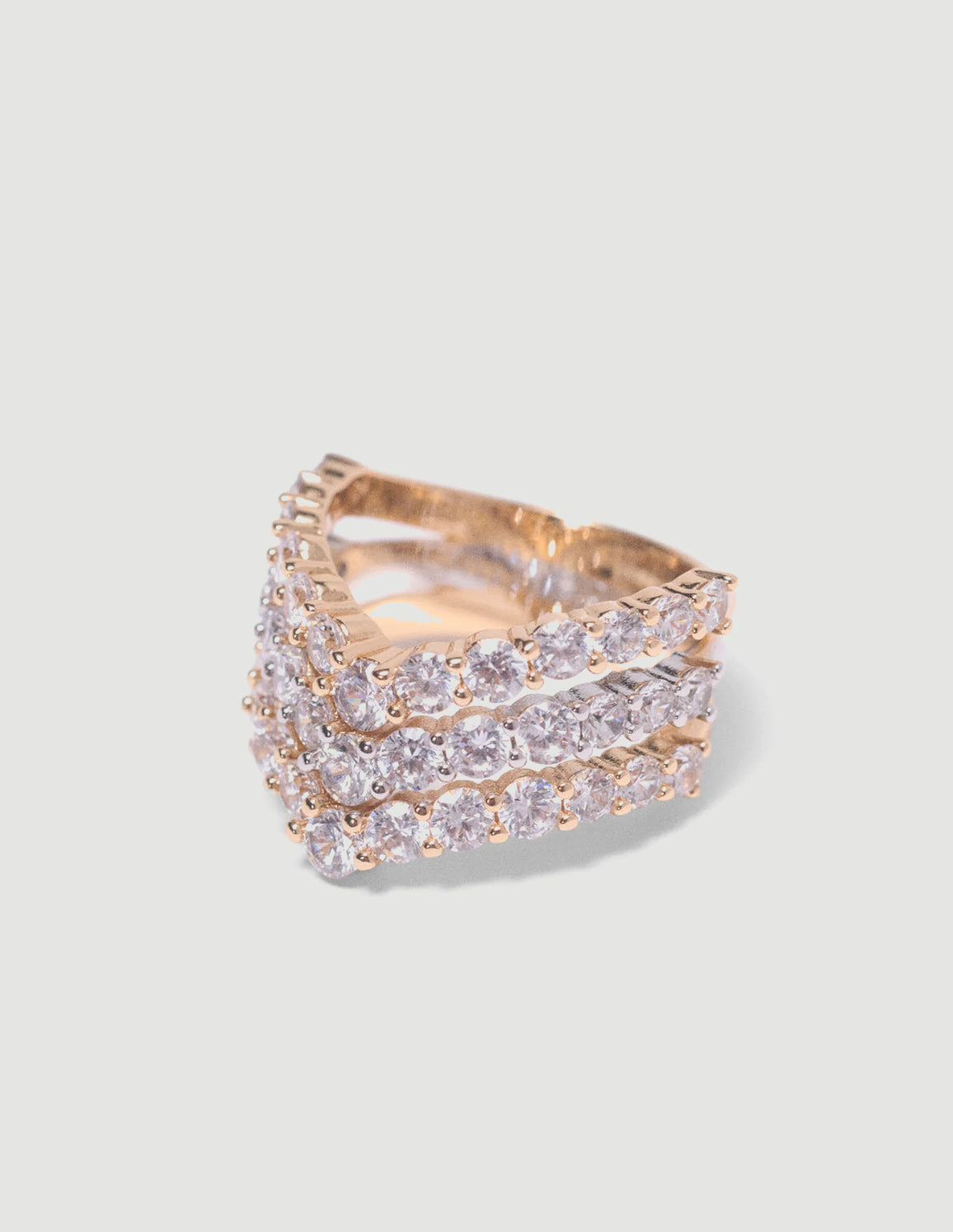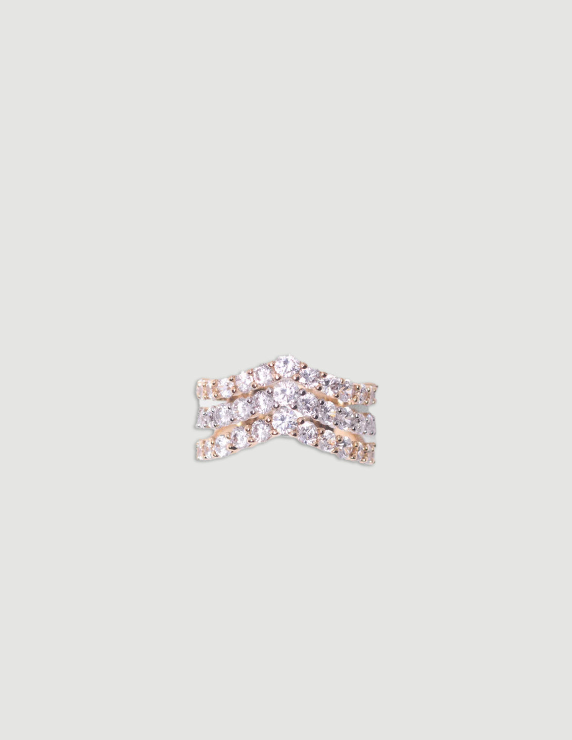• Its V-shaped structure and full pavé of crystal-style stones adorn the hand with a precious light, while playing on contrasts of texture and colour.